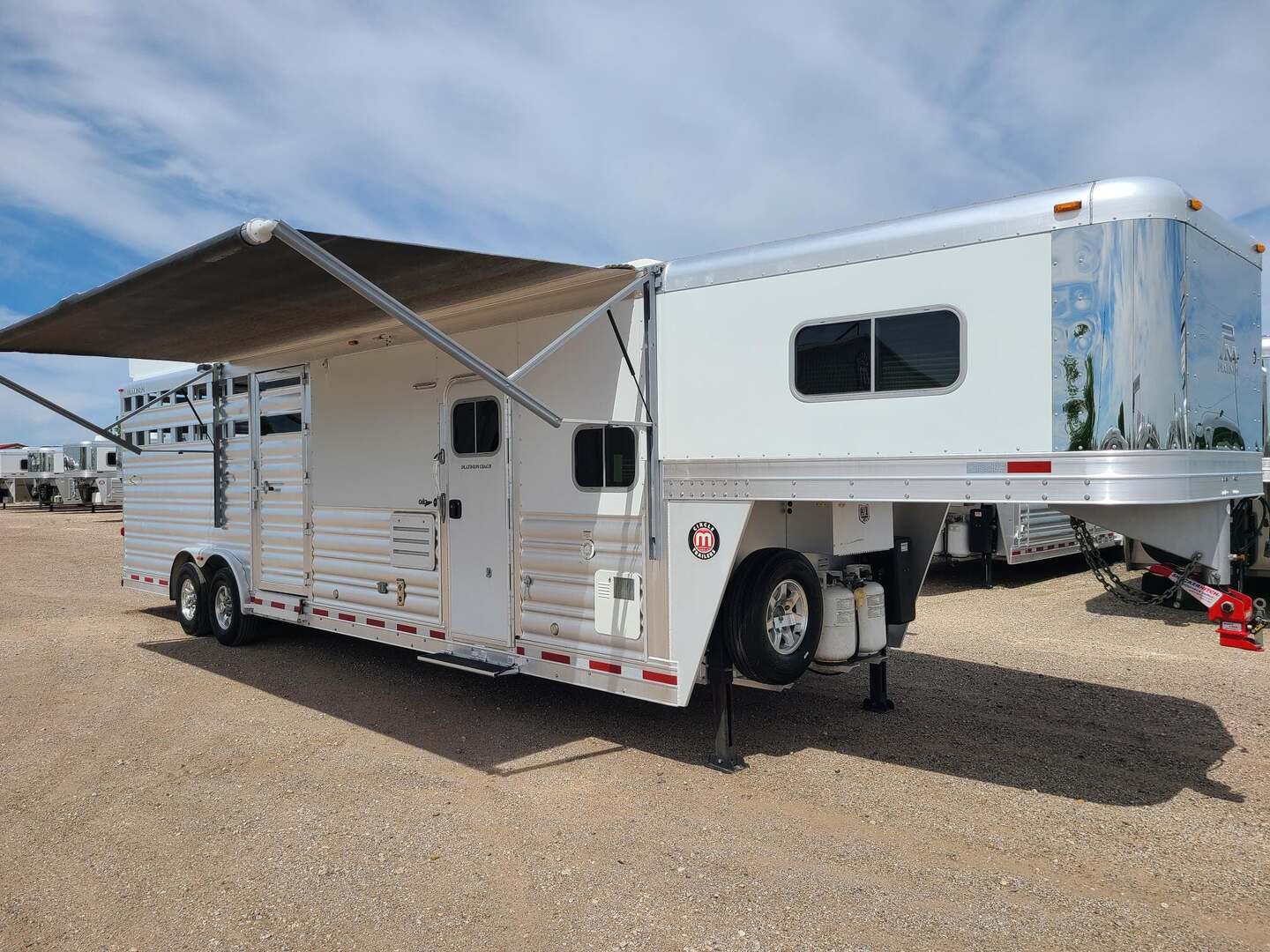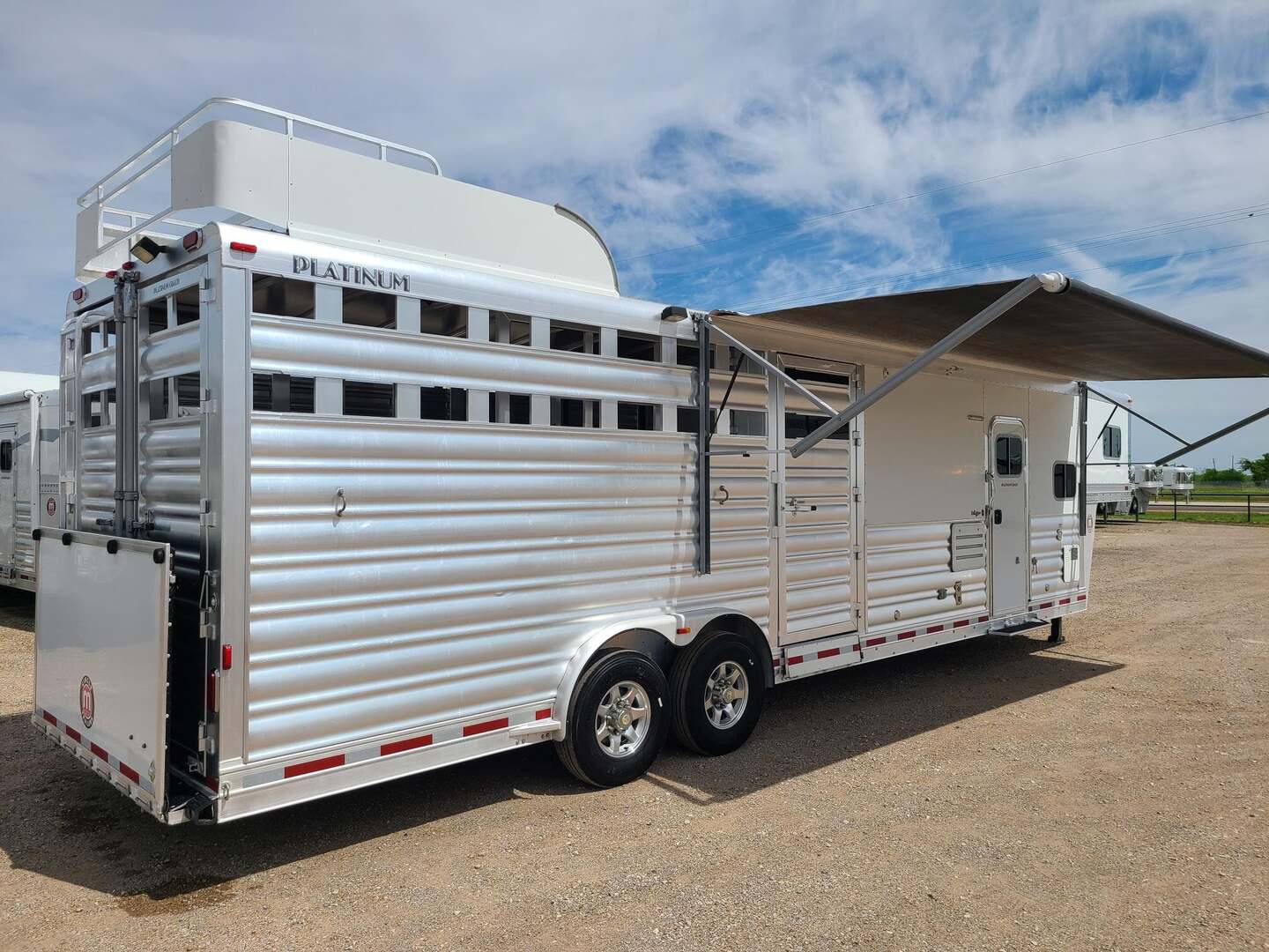 2020 Platinum Coach with 14’ Outlaw Conversion Living Quarter 8 x 30 x 8 tall 8000# axles, 14 ply tires, Aluminum Wheels WERM flooring Shocker Hitch 14’ Outlaw Conversion Living Quarter 7’ Slide with 72” sofa sleeper 15000 BTU A/C with Heat Strip 16000 BTU Propane Furnace 6.0 Propane / Electric refrigerator 6 gallon propane water heater 60 gallon water tank Quartz sinks in kitchen and bathroom Two burner recessed cooktop Microwave with vent hood over cooktop 32” radius shower with power vent overhead Vanity sink next to closet / toilet 24” walk through door to horse compartment Dual leg hydraulic jacks Double Aluminum Battery Box with On/Off switch Double 30# propane bottles 18’ power awning on passenger side 16’ total stock/horse area, 4’ tack area up front Plexiglas & Track on front 4’ section with rubber on both side doors Track for Plexiglas on rear 12’, no Plexi Full width spring loaded rear ramp Double rear gates No gen or pre-wire