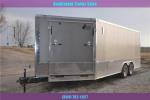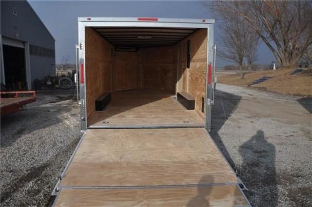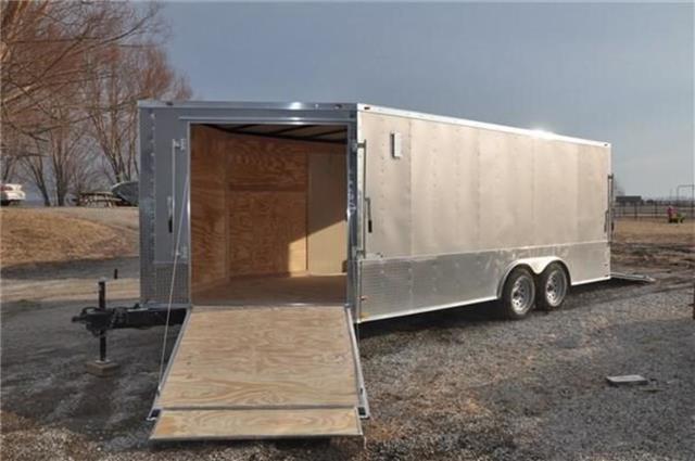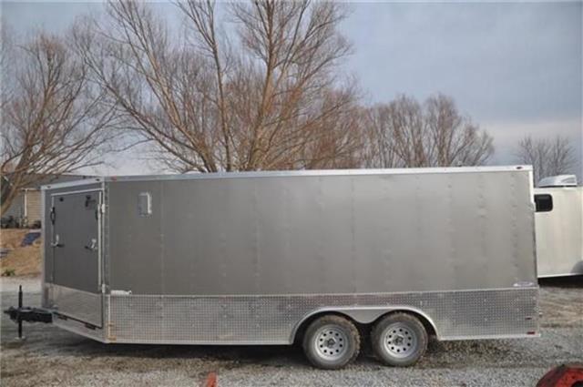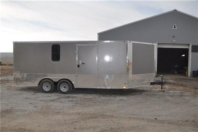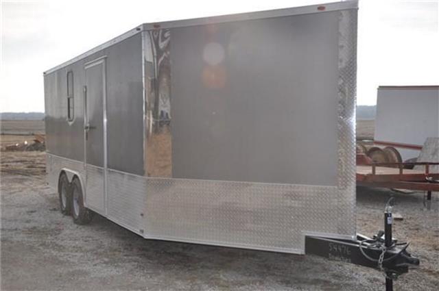SNOWMOBILE TRAILER This 8.5x18 snowmobile trailer features an extended v nose with a 5’ramp in the v nose for easy drive on drive off capabilities.Also included is a 15x30 window for added light and ventilation.The 24 inch bottom trim adds just enough flash to the trailer. The 8.5A--18 SNOWMOBILE TRAILER includes upgrades as well as all the standard features that make our trailers a leader in the industry..024 White Aluminum Exterior16”OC Floor Cross Members 24” OC Tubing RoofBows16” OC Tubing Side Wall Posts3/4” Plywood Floors & 3/8” Plywood Walls 4 Floor Mounted D-ringsRamp Door w/No Show Beaver Tail 2000# A Frame Jack/Sand FootNon Powered Roof VentGrey Mod WheelsColor Matched Screws on Exterior 78” Interior HeightOne Piece Aluminum Roof Slanted Stone Guard2 5/16’”’ CouplerFull LED Light PackageV-Nose w/Bright Anodized Aluminum Cap Tag Bracket & LED Tag LightATP Lined Step Well at Side Door 2”x 6” Tubing Main Frame3500# Leaf Spring Drop Brake Axles 15” 205 Radial Tires & EZ Lube Hubs 16” Extension Flap on Ramp7 Way Bergman Plug w/Elec Brakes 1-12 Volt LED Interior Light Aluminum Teardrop Fenders Flairs36” Side Door w/Flush Lock & SafetyChainJack and Coupler FeaturesManual Top Wind Jack 2 5/16 CouplerWheels and Suspension FeaturesBreak away Switch Electric Brake(s) 5 Hole WheelsStructural FeaturesTubular UprightsExterior FeaturesBaked Paint Wood Floor D-Rings InstalledSafety Convenience and Electrical7-Way Plug Insulated Wire Harness LED LightingInterior FeaturesLightsDoors, Windows and RampsSide Door Nose Ramp Rear Ramp Door