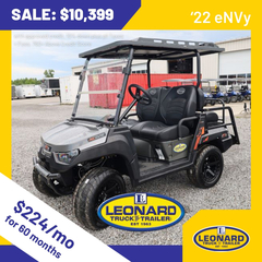 View Inventory: https://leonardtrailers.com/inventory/39437 Are you ready for the quietest comfortable ride? Then look no further than the eNVy Neighborhood Vehicle. This durable personal transport vehicle is built from heavy-duty American steel,Powder Coated Fusion-Bonded Solid American Steel Bridge Frame,52.2 ft lb torque,Automotive quality acrylic molded plastic body, and speeds up to 20 mph,Power steering, regenerative braking, 7” Touch screen color display,Keyless Ignition w/Security System,37”x 44” cargo bed space.The NV4 comes with 4 12-volt deep cycle lead acid batteries with watering kit and an integrated on-board charging system. Perfect for cruising the neighborhood with the family, the NV4 eNVy is a great choice. **We believe that these specifications to be accurate. Any discrepancies are unintentional. Please verify information with a sales associate prior to purchase.** Stock Number:39437