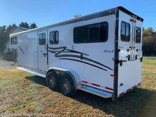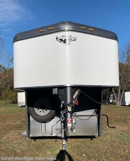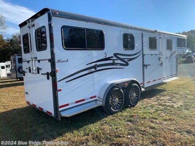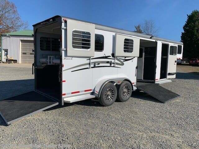 2026 Hawk 2+1 GN w/Dress and Side Ramp, 7’6”x6’8”, White, Lined and Insulated Walls In HA and Dress, One Piece Fiberglass Roof, Shelby Flooring in HA, Rubber Mat in Dress, 90” b/n Chest & Butt Bars, Drop Windows at Each Horse Head, 18’5” in HA, Diamond Plate Under Gooseneck, Rear Ramp w/Tie-Back Curtains & Windows in the Curtains, 60” Side Ramp w/Curtain Door, 30” Walk Through Door w/Window, Full Size Escape Door, Three-Stack Adjustable Saddle Racks, Bridle Racks, Brush Box, Clothes Bar, Full Aluminum Running Boards, Removable Center Post and Divider, Padded Center Divider, Padded Breast and Butt bars, Tubular Head and Shoulder Dividers, Four Roof Vents in HA, Rubberlined Sidewalls, Tie Rings, Dome Lights in HA and Dress, Loading Light at Each Ramp, Feed Bags, Spare Tire, 7-Year Warranty, GVWR 12000, Empty 6200, Carry 5800