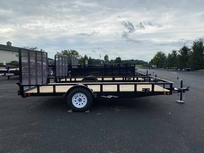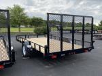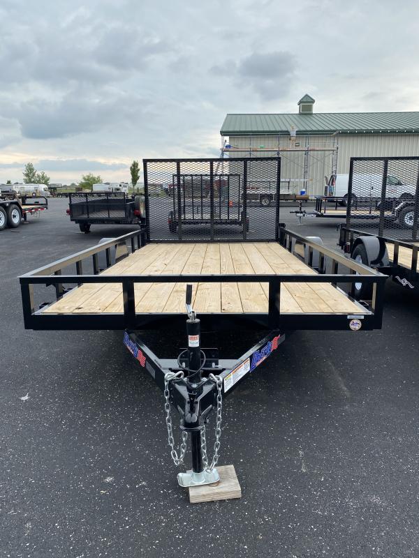 Single axle railed utility. 4” channel frame. Treated wood deck 82” wide x 14’ long. 3500# axle with spring suspension. 2990# GVWR. 15” 5 bolt wheels, ST205/75D15 radial tires. Angle rail front and sides. Tongue jack in 2” A frame coupler. Spring assisted HEAVY DUTY 2” X 2” TUBE FRAME RAMP GATE WITH #6 MESH.