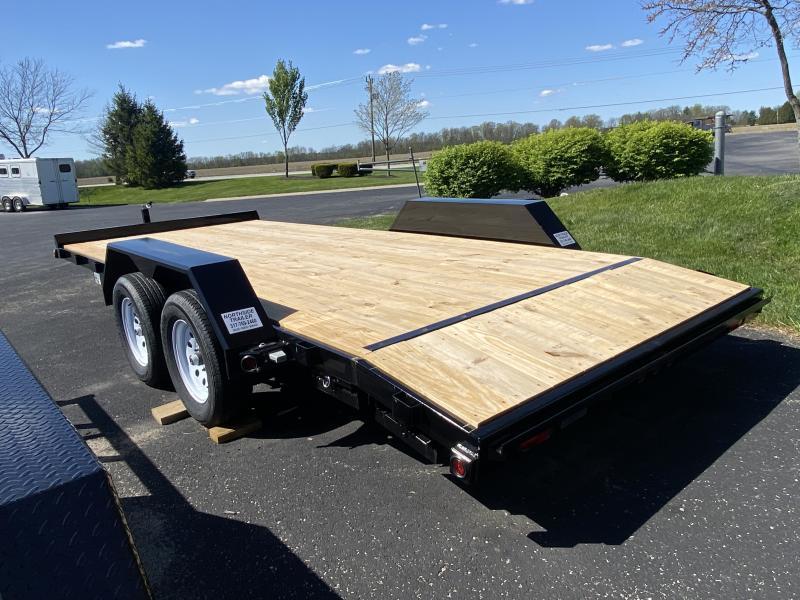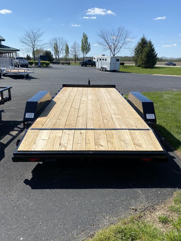 2022 BLACK 83” x 18’ (16’ 2’ Dovetail) LIBERTY CARHAULER TA BP Tandem 5200# Spring Axles ST225/75R16 LRE Radial Tiress 15” 6 bolt Silver Mod Wheels Electric Brakes All Wheels 7000# Set Back Jack Spare Tire Not Included Model: LC10K83X18C5DT GVWR: 9,990# Est. Empty Weight: 2300# 2-5/16 Adjustable Height Coupler, 7RV Plug 5” structural channel frame and wrapped tongue 3” structural channel crossmembers 24’ on center 2” treated pine floor with (4) ”D’ rings 2’ wood dovetail with 5’ slide in ramps Smooth jeep style teardrop fenders Stake pockets Spare tire mount only Seal beam LED lights, sealed wiring harness Powdercoated Spare tire mount only