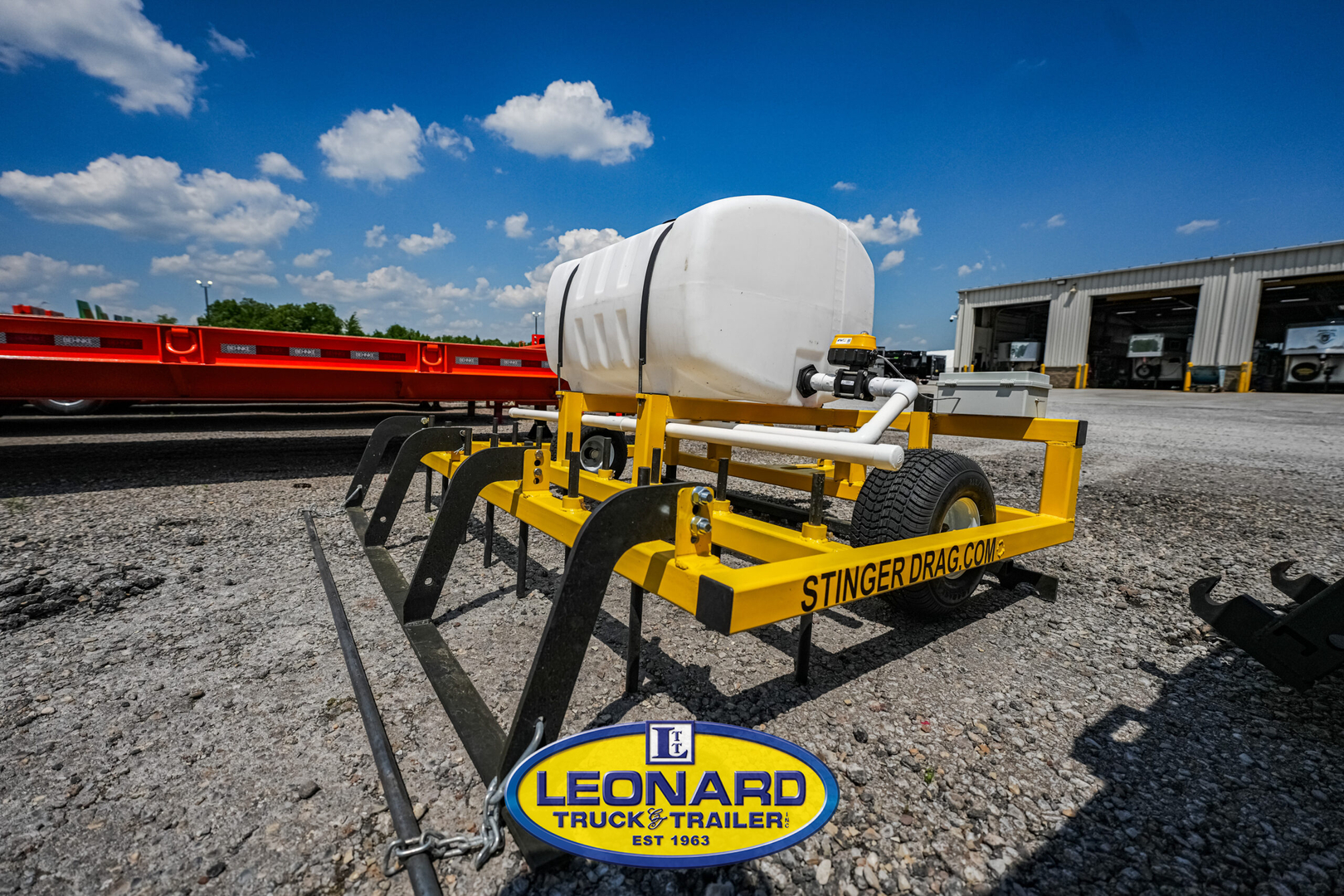 View Inventory: https://leonardtrailers.com/inventory/42413 High tech where you need it- rugged simplicity everywhere else. Every Stinger Drag Pro comes with the patent-pending Keyhole Hitch which allows you to pick up the drag like a traditional 3 point system, set it in the arena, and pull it like a towable arena drag. With the Keyhole Hitch you get the simplicity and convenience of a 3 point drag and the performance of a towable drag, all without leaving the tractor seat- and without any hydraulics. The Stinger Drag Pro is constructed with 3/16s tube steel, all ground contact components are made from AR400 steel- the same materiel used for bulldozer blades and excavator buckets, and has a fully welded frame. All components are powder coated for a durable finish. ARENA WATERING SYSTEM Our Arena Watering System mounts to our Stinger Drag Pro and is gravity fed with a remote control valve. From the tractor seat, you can turn your water on and off, and you can disconnect your drag without leaving the seat of your tractor- even with our watering system mounted to your drag. No components of the watering system require a physical connection to the tractor- no PTO pump, no electrical connection, and no hydraulic connection. Stock Number:42413