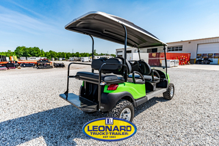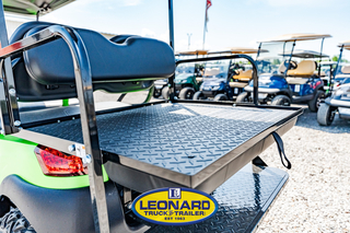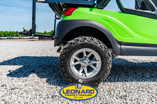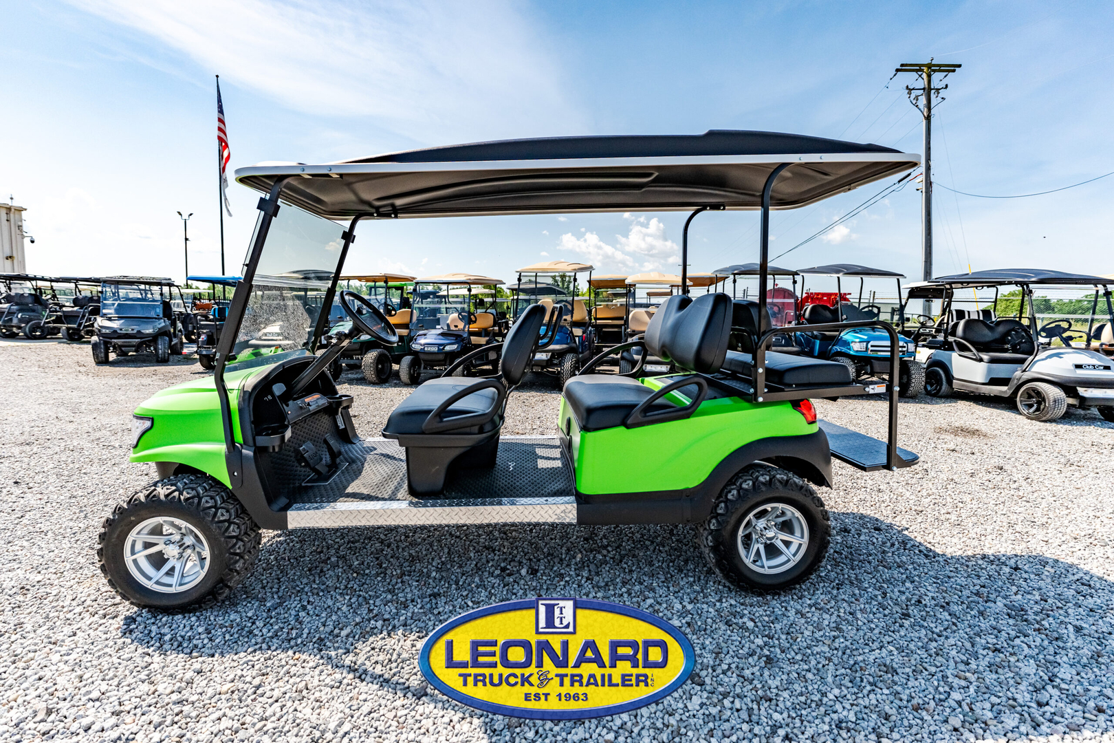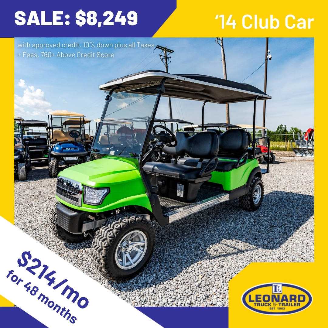 View Inventory: https://leonardtrailers.com/inventory/42453 Used 2014 CLUB CAR PRECEDENT stretch lifted electric cart with LED head and tail lights, seat kit and 116” eagle top. All terrain tires Stock Number:42453