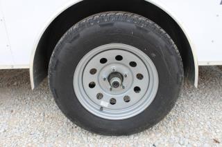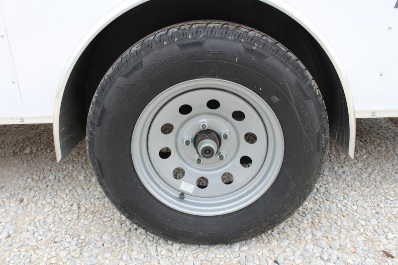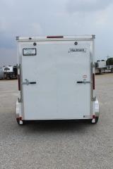 New 2023 Haulmark 10’ Cargo Trailer, V-nose, flat roof, single axle, lined side walls, dome light, 4 tie downs on the floor, rear fold down ramp with extension, gravel guard on nose and white in color.