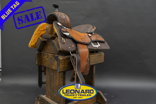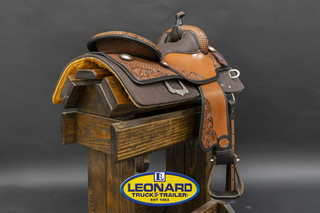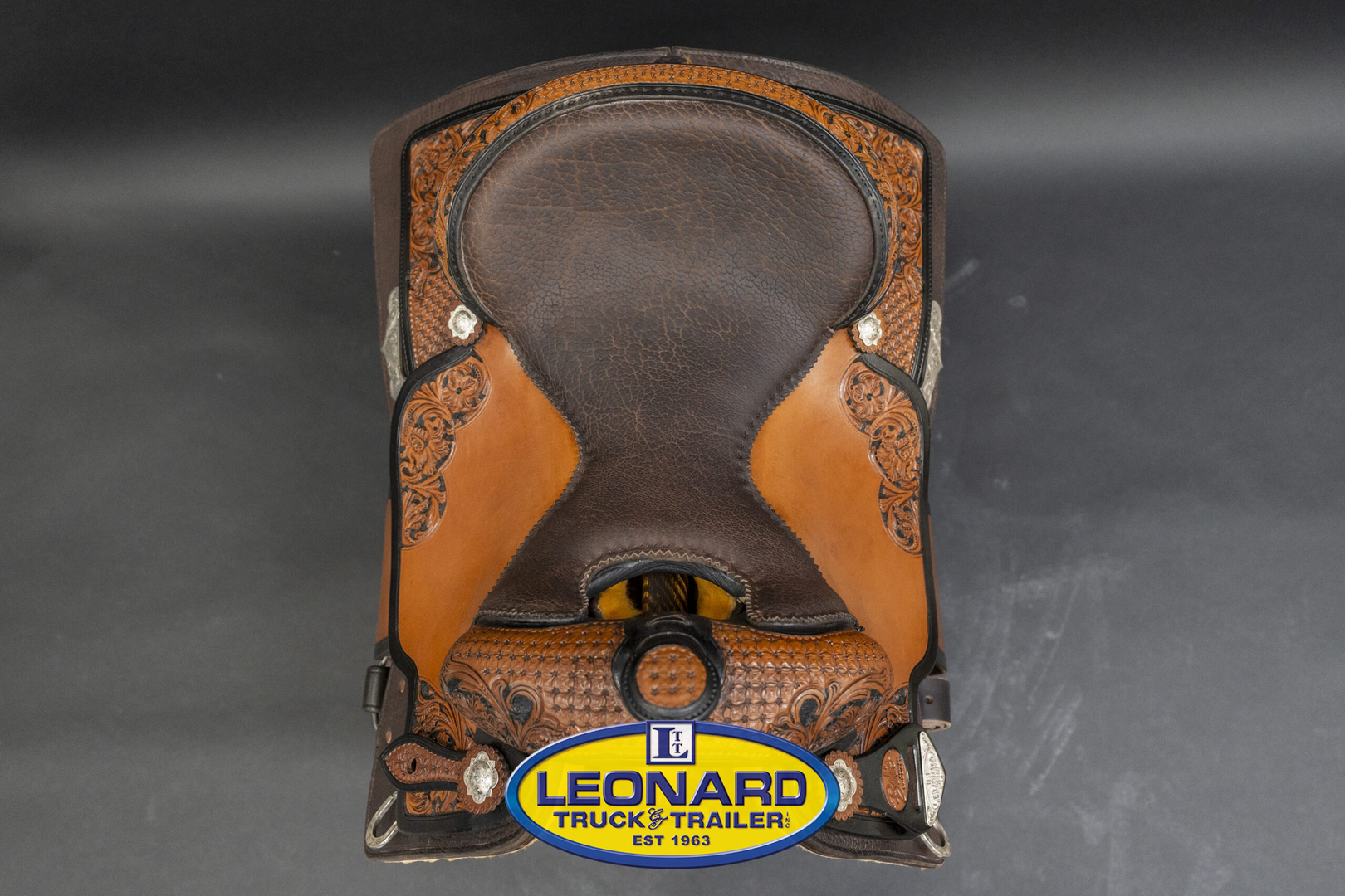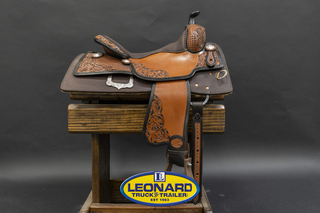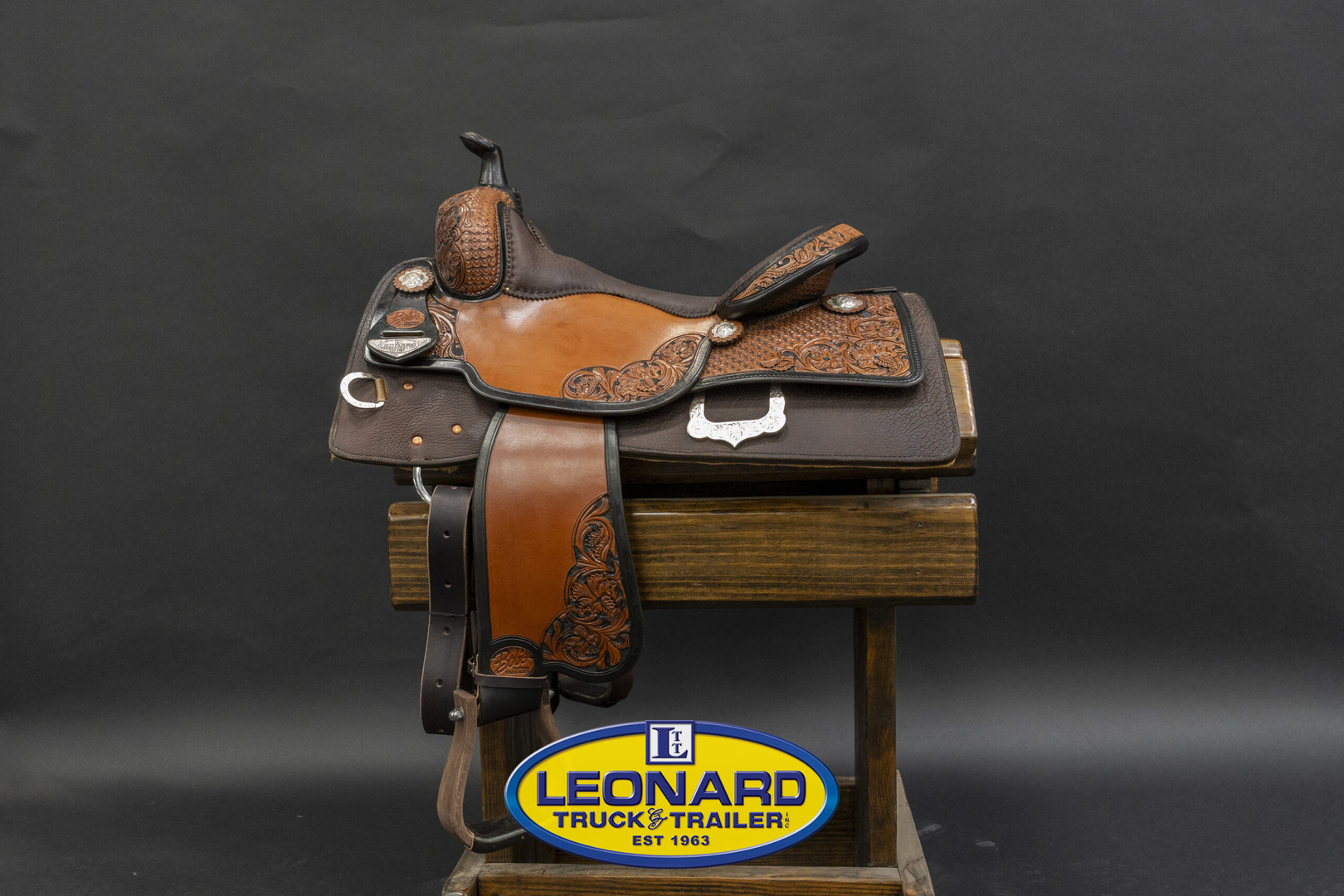 View Inventory: https://leonardtrailers.com/inventory/42877 Bob’s Custom Saddle Lady Reiner. Built on a 16.5” DL Tree with a 16” inch Single Narrow 1/2” Foam California/Cutter Seat. Chocolate Bison If you are looking for a comfortable, deep pocket and close contact reining saddle, that will turn heads, you have found it! Since 1977, Bob’s Custom Saddles are built with the finest trees available; from hand-picked, top-grain hermann oak leather, real sheepskin, and hand-engraved sterling silver or silver overlay. Bob’s hand-tool every saddle, hand-lay every ground seat, hand-stitch every seat, and hand-craft each cantle. Their superior quality, craftsmanship, and performance are a prime choice for premier horsemen around the world. Proudly presented by Leonard Truck & Trailer. **We believe that these specifications to be accurate. Any discrepancies are unintentional. Please verify information with a sales associate prior to purchase.** Stock Number:42877
