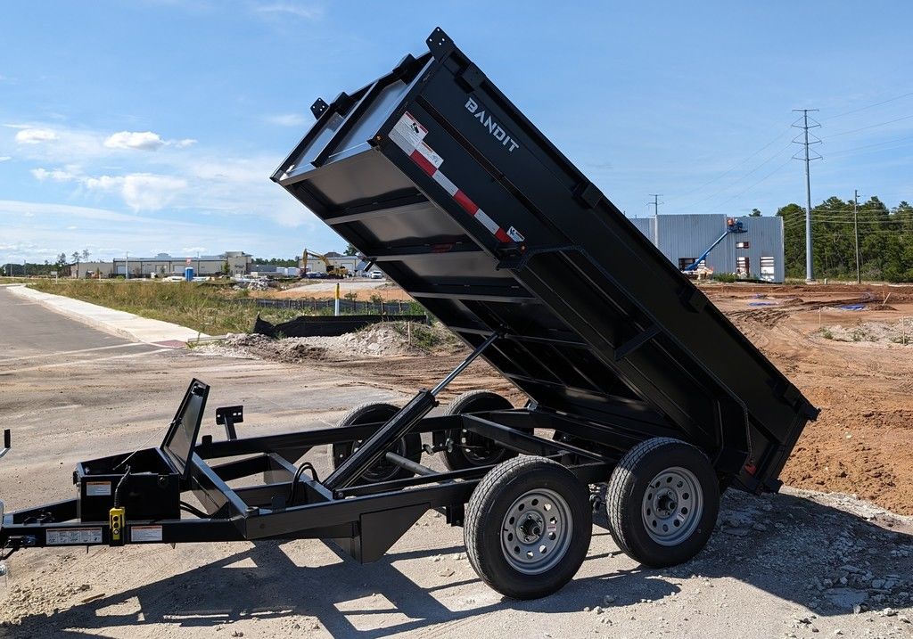 BANDIT DUMP TRAILER 18 AMP BATTERY CHARGER LED LIGHTS BLACK POWDER COATED SINGLE RAM 2 5/16” BALL COUPLER REAR BARN DOOR GATE BRAKES ON BOTH AXLES