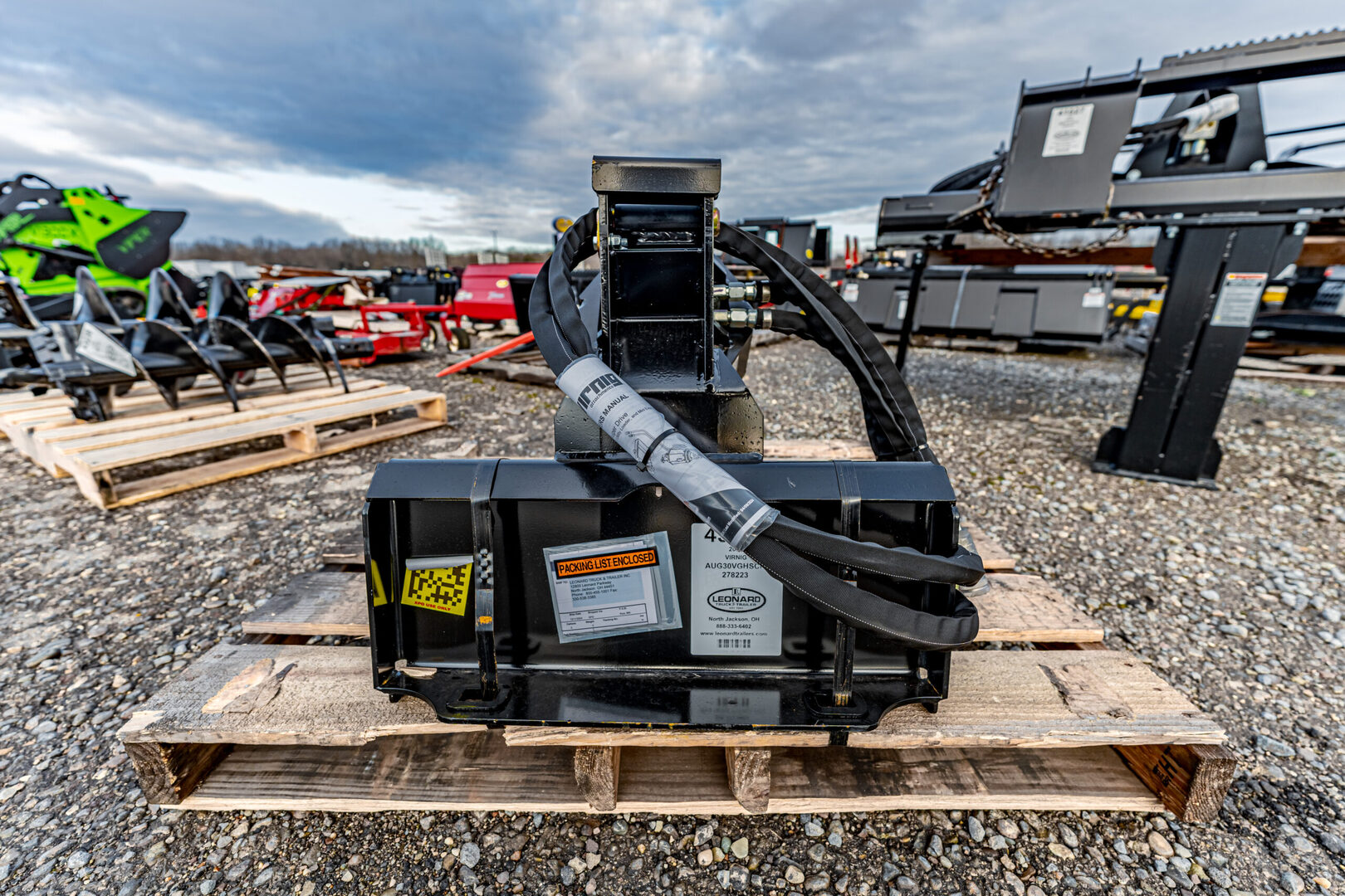 View Inventory: https://leonardtrailers.com/inventory/43237 v20 Mini Skid Steer Auger Drive Product Category: New Products Drive unit interchangeable between skid steers, mini excavators and mini skid steers. HOSES ROUTED FROM TOP OF HOUSING FOR DEEPER DRILLING WITH 12? DIAMETER BITS DIRECT DRIVE MOTOR WITH HYDRAULIC PRESSURE RELIEF PROTECTION PLANETARY REDUCTION ENSURES LONGEVITY & CONSISTENT TORQUE BI-DIRECTIONAL AUGER ROTATION FRAME DESIGN ALLOWS 4' LONG BITS FOR LOADER HINGE PIN HEIGHT OF 80+ INCHES Supports Auger Bits up to 30? in diameter. SPECS: Output: 2? Hex Recommended Flow Rate (GPM): 10-18  Maximum Bit Diameter (Inches): 30 Torque @ 3000 PSI (ft.-lbs.): 2,205 Speed @ 14 GPM: 58 Mount:  Universal Mini Skid Weight (lbs.)  : 250 We do have financing available and accept trades. Please call us for any additional information! **We believe that these specifications to be accurate. Any discrepancies are unintentional. Please verify information with a sales associate prior to purchase.** Stock Number:43237