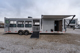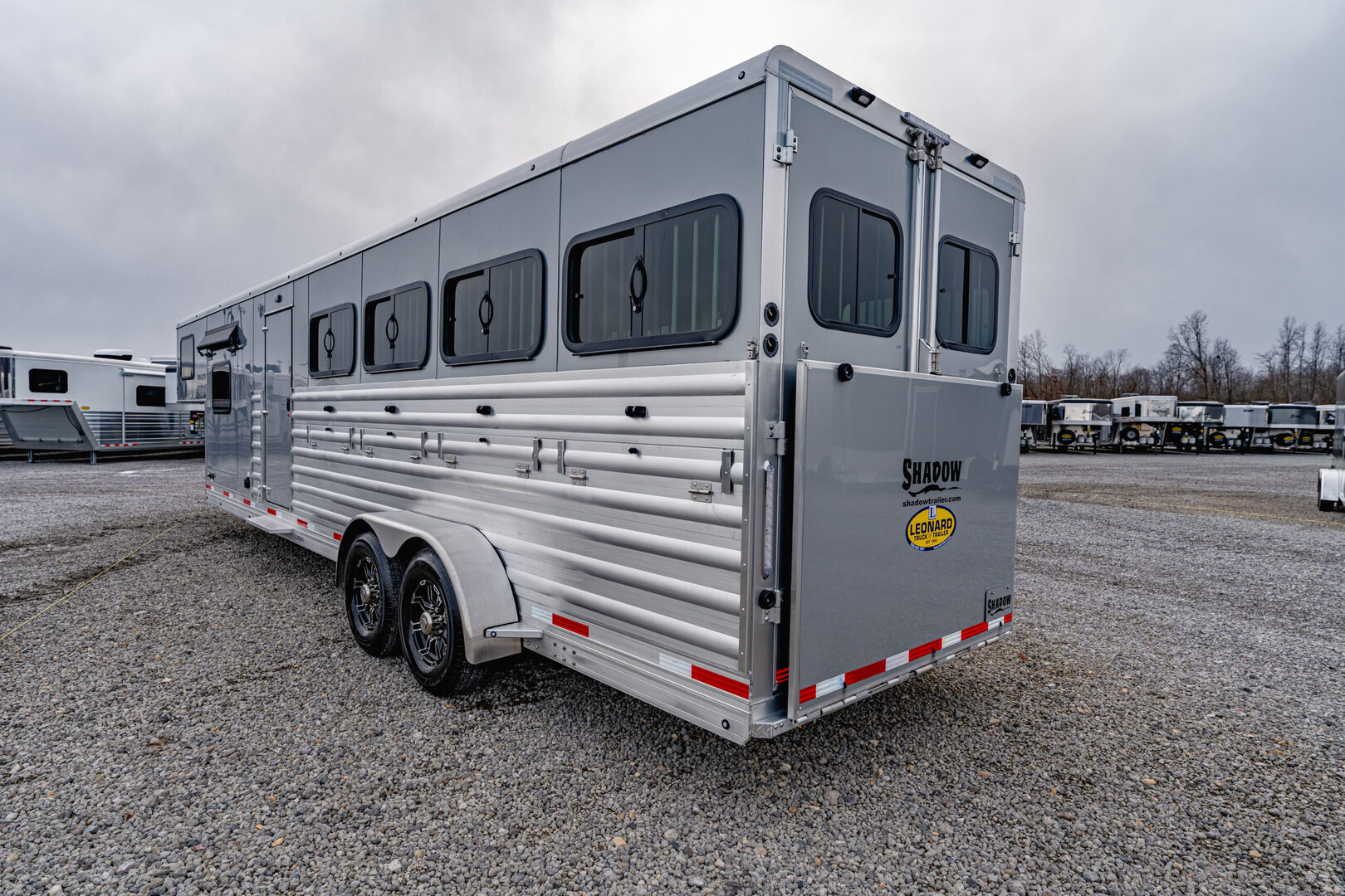 View Inventory: https://leonardtrailers.com/inventory/43281 Stock# 43281 New 2026 Shadow 69306E-8PEN GN LQ Stock Trailer  Shadow Stock Trailers are built tough for everyday use on the ranch. Shadow offers 8’ wide.  The spring axles give your stock a much better ride, getting your livestock to their destination with less stress and fatigue. Model:69306E-8PEN Warranty: 6yr-Structural 2yr- Bumper to Bumper  Changes to Standard Trailer: 29’ Floor 37’ OAL (Overall Length) 7’6” Tall 6’9” Wide Hydraulic Jack- single leg Drive Train: 7000# Spring Leaf Axles 16” Aluminum Wheels with ST235-80R x 16 Load Range ’E’ Radial Tires Includes spare Dress Area: 66” Straight Wall 32” Entry Door (C/S - Curb Side) Horse Area Door Feeder Bars on Straight Wall Stock Area: 42” Side Ramp 8–48” 60/40 or 50/50 Style Pens Dome Lights on each side of stock area with LED strip Lighting 50/50 Rear Doors Rear Ramp Lining/Insulation Roof Vents Lower Wall Lining/Insulation Aluminum Floor with WERM Flooring 13.5 A/C   Additional Feature: Silver Sheeting with Black Graphics   We offer outstanding financing options, accept trades, and can arrange nationwide NO HASSLE delivery! Inquire today for more information! (888) 333-6613 **We believe these specifications to be accurate. Any discrepancies are unintentional. Please verify information with a sales associate prior to purchase.** Stock Number:43281