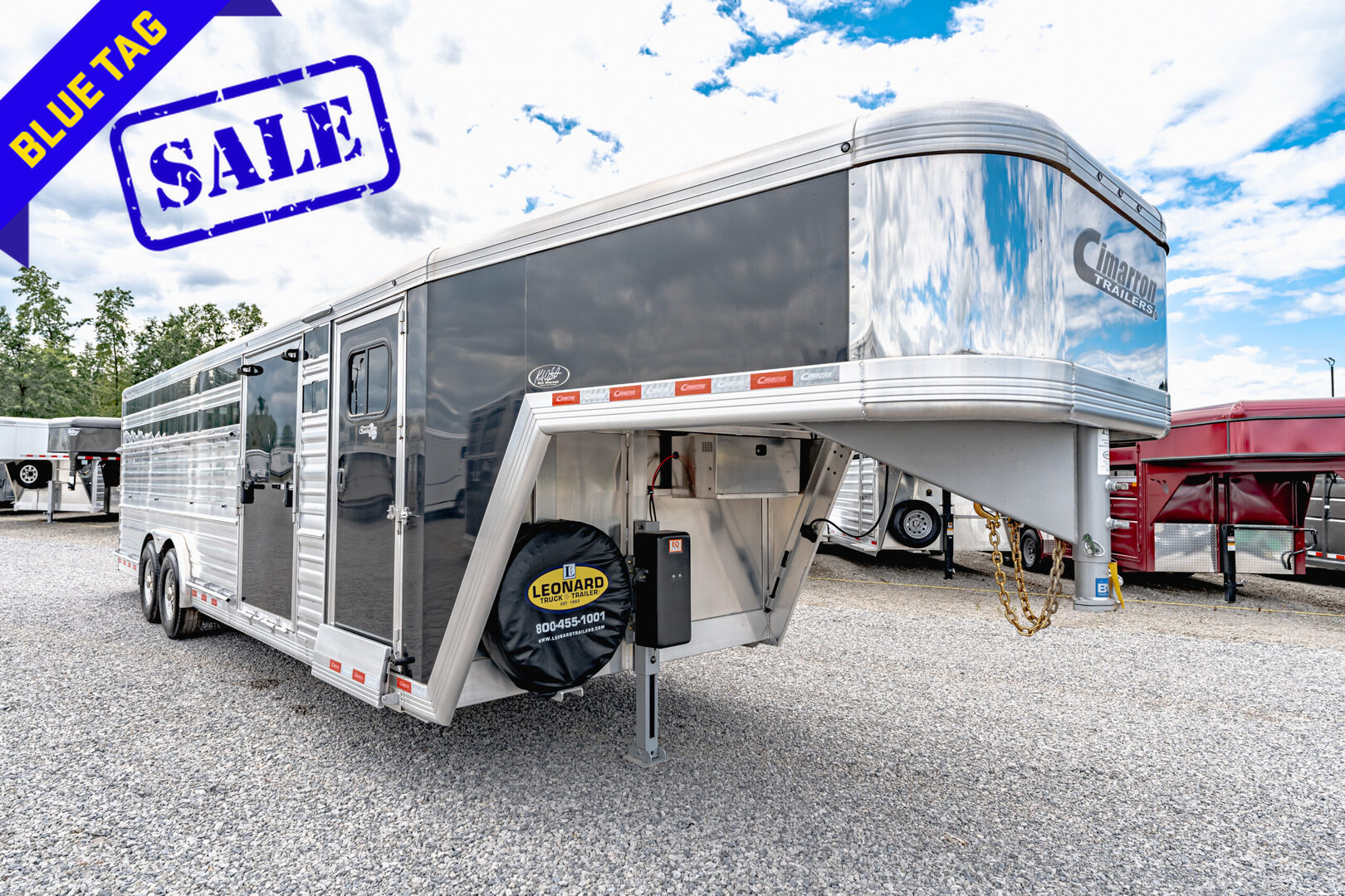 View Inventory: https://leonardtrailers.com/inventory/43286 Stock# 43286 New 2025 Cimarron SW24GPRO Gooseneck Stock Trailer Cimarron Trailers has teamed up with club calf legend Kirk Stierwalt to design the perfect club calf trailer. The Stierwalt Series trailers have the most useful trailer features for hauling club calves. Model: SW24GPRO Warranty: 8yr- Structural 3yr-Body and Hardware Overall Equipment Wall Construction: Extra Single Wall (Front Tack): 0 Dimensions: Box Length: 24’ - 0” Box Width: 8’ - 0” Box Height: 6’ - 8” Gooseneck (GN) Length: 8’ - 2” GN Drop Wall: 50” (For 4x4 Vehicle) GN Structure: Medium Duty Undercarriage: GVWR: 13,680 lbs Axles: 7,000 lb Dexter Torflex Axles (8 Bolt Hubs with 9/16” Studs) - Qty: 2 Axle Articulation: 10 Degree Up Brakes: Electric (All Wheel) Tires: Goodyear ST 235/80 R16” LR-E - Qty: 5 Wheels: 8-Hole Aluminum Spoke 16” LR-E - Qty: 5 Trim: Fender Edge Molding: NO Lower Body: Rocker Panel, Full Length Coupler: Type: 2-5/16” Positive Lock with Adjustable Height Stem (GN Standard) Design: Nose Profile: Tapered Sides with 18” Radius Corners Nose Sheet: Polished Stainless Steel Side Walls: Extruded Side Slat with 2 Air Gaps & Plexiglass Insert & Tray Sheet Color: Silver Metallic Exterior Extrusions: Mill Finished Fenders: Tear Drop Overall Width: 102” O.A.W. Roof Material: Insulated Roof Panel Flooring: Type: Extruded Aluminum with Cross Members @ 4” C/C Bottom Rail: HD-Bottom Rail Hardware: Hold Backs: All Doors & Gates Jacks & Parking: Type: Standard Single Speed with Drop Shoe Exterior Lights: Back-Up LED Lights: NO Tail Lights: LED with Red Lens (Qty: 4) Marker Lights: LED Button Type (Qty per side on top rail: 5) Flood Lights: LED Awning Light 8” (Qty: 1) Other Lights: LED Awning Light 16” (Qty: 1) Side Turn Signals: NO Walls: Front Tack Room: Solid Partition Wall, Full Height & Width Rear Tack Room: Straight Wall Front Tack Room Equipment Size: Length (LH): 4’ - 0” Length (RH): 4’ - 0” Width: 8’ - 0” Doors: Primary Door: 32” Wide x Standard Height (RH) Flooring & Carpeting: Carpet/Floor Mat: Rubber Mat Floor, Carpet on GN Wall & Deck Living Quarters Prep: A/C Frame: 1 Windows: Sliding Type: 15” x 22” Stall Area / Load Space Equipment Size: Length (LH): 20’ - 0” Length (RH): 20’ - 0” Width: 8’ - 0” Rear Opening: Type: Gate - Swing Type with Sliding Gate Latch Type: HD-Steel Cam Lock Gates: Access: 34” Sealed Access Gate with Black Latch (LH) GN Nose: 4” Tall Removable Tube @ GN Wall Center: Not specified Traveling: Frame with 48” Swinging Gate (No Threshold) Ramps: Side: Full Height up to 48” Wide, Sealed with Black Latches Pen Management System Width (LH): 5’ - 0” Width (RH): 3’ - 0” Lengths: Infinity Fold-Down Slat (Per Every 48”): Qty: 9 Hardware Dome Lights - Optibrite LED: Qty: 4 Utility Hooks (Set of 4): Qty: 2 Clothes Bars: Qty: 1 Pop-Up Vents (2 Rows): Qty: 6 Fold-Up Steps: Qty: 1 Special Requirements: Interior Tie Rail per Ft. - LH Side 28” & 48” Above Floor (Qty: 44) Tie Rail, Exterior, 1” Tube - RH Side Just Above Rocker Panel & Just Below Mid Gap (Qty: 26) Center Gates are 6” Above Floor Taper Ends of Fender Wells (Stock Trailer) (Qty: 1) Notch Rear Traveling Gate for Fenders Both Traveling Gates to Store at Partition Wall When Pens are in Place Pens are 50-50 and All Panels Hinged Off Center Post, 37.5” Tall   We offer outstanding financing options, accept trades, and can arrange nationwide NO HASSLE delivery! Inquire today for more information! (888) 333-6613 **We believe these specifications to be accurate. Any discrepancies are unintentional. Please verify information with a sales associate prior to purchase.** Stock Number:43286