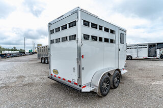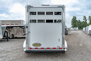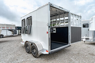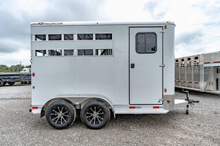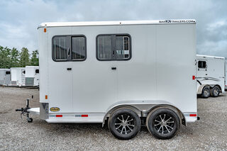 Stock# 43384 New 2025 Bar-M SS-20-SC Bumper Pull Horse Trailer  At Bar-M Trailers, we value creativity, innovation, and durability. We believe in creating products that are not only good for the animals but also benefit the user. We are proud to be built in the USA! Model:SS-20-SC Warranty: 7yr-Structural Model Info Model: SS-20-SC Type: 2 Horse Slant with Stock Sides on Butt Side and DDFD (Drop Down Feed Door) on Head Side Standard Features Aluminum frame Aluminum side wall posts and aluminum roof bows Sidewall posts: 1 1/2” deep Typically on 16” centers Unit height: 7’-6” tall Flooring cross members: commonly on 12” centers 2x6 pressure-treated wood floor with rubber mats One-piece, seamless aluminum roof Exterior aluminum skin: .040 (white is standard), riveted nose sheets Dexter spring axles: 3,500# on 2-horse model 5,200# on 3-horse model Electric brakes on all axles (4) Steel wheels & (1) steel spare (15” LR D) on 2-horse model (4) Steel wheels & (1) steel spare (15” LR E) on 3-horse model Heavy-duty 2 5/16” coupler with safety chains Horse Area Interior Standards HDPE smooth black high-impact wall liner: Road side and curb side of horse area Rear side of swing wall to dressing room High and low sheeted air gaps on curb side walls in horse area 32”x24” radius corner drop-down feed door at each stall on road side High and low sheeted air gaps on the single rear swing door (1) Slim-line LED stall light per stall in cove on curb side Swinging partition between front horse stall and dressing room (2) Horse ties per stall inside of horse area (1) Horse divider between each stall Stall spacing: 42” between stalls Exterior Standards (1) Exterior horse tie on curb side exterior (3-horse models) (2) Exterior horse ties on road side exterior (2- and 3-horse models) Lockable 32” camper door with 20”x20” window to dressing room on curb side Single swinging rear door with sheeted high and low air gaps Single swinging rear door with (4) hinges on curb side & single aluminum cam bar on road side Drip cap above dressing room door (aluminum) Optional Upgrades Running boards Upgrade to aluminum wheels Add Shelby flooring   We offer outstanding financing options, accept trades, and can arrange nationwide NO HASSLE delivery! Inquire today for more information! (888) 333-6613 **We believe these specifications to be accurate. Any discrepancies are unintentional. Please verify information with a sales associate prior to purchase.**< Stock Number:43384