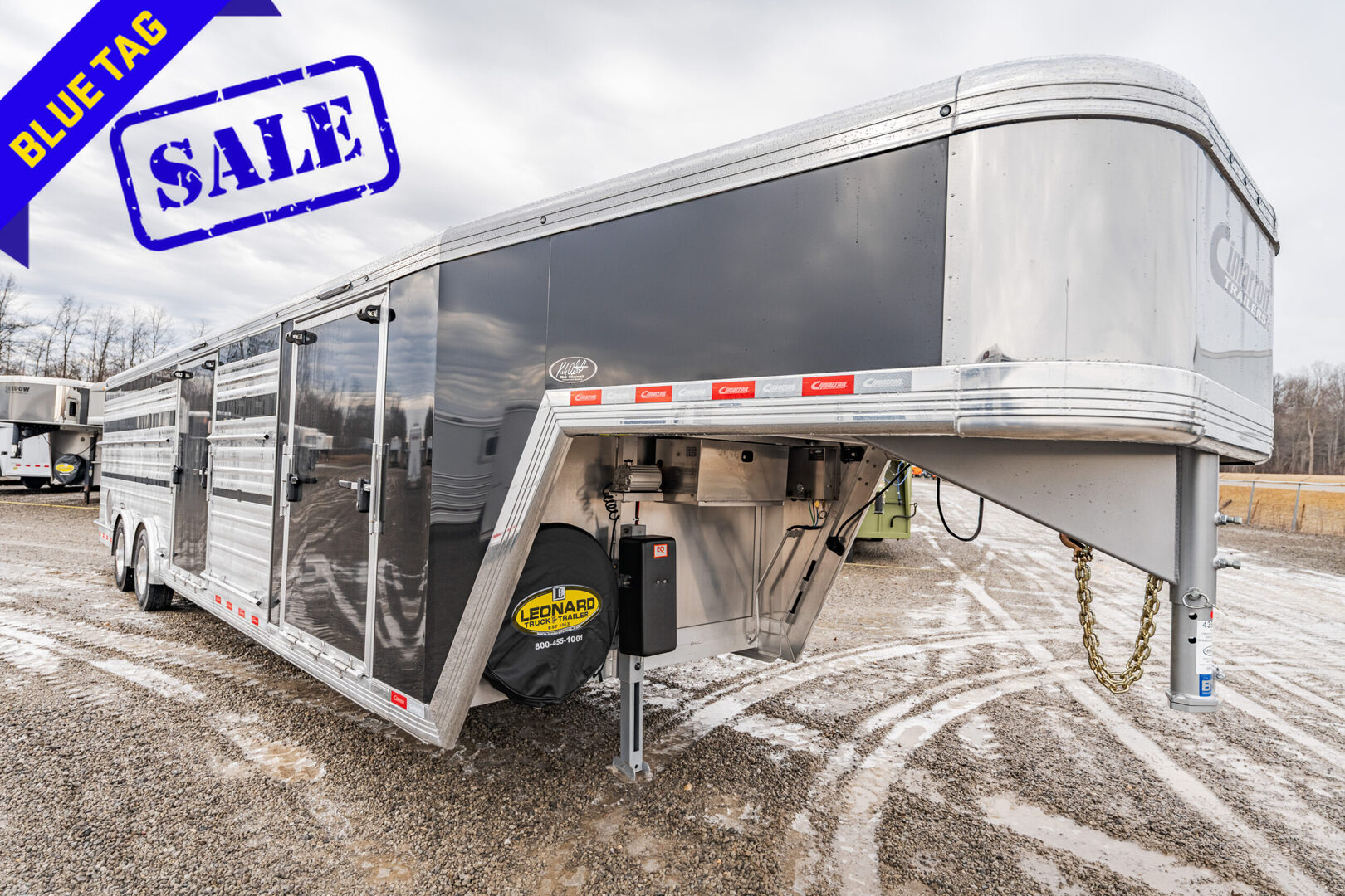 View Inventory: https://leonardtrailers.com/inventory/43507 Stock# 43507 New 2025 Cimarron SW30G SIG Gooseneck Stock Trailer Cimarron Trailers has teamed up with club calf legend Kirk Stierwalt to design the perfect club calf trailer. The Stierwalt Series trailers have the most useful trailer features for hauling club calves. Model: SW30G SIG Warranty: 8yr- Structural 3yr-Body and Hardware Overall Equipment Dimensions: Box Length: 30’ - 0” Box Width: 8’ - 0” Box Height: 6’ - 8” Gooseneck (GN) Length: 9’ - 0” GN Drop Wall: 50” (For 4x4 Vehicle) GN Structure: Medium Duty Undercarriage: GVWR: 16,000 lbs Axles: 8,000 lb Dexter Airflex Axles (8 Bolt Hubs w/ 5/8” Studs) Axle Articulation: 0 Degree Brakes: Electric / Hydraulic Brakes, DISC BRAKES-8K Tires: Continental 245/70 R17.5” LR-J (Choose SRW or ALCOA Wheels) Wheels: 8-Hole Aluminum ALCOA MOD 17.5” Trim: Fender Edge Molding: NO Stone Guards: VYNL Lower Body: Rocker Panel, Full Length Coupler: Type: 2-5/16” Positive Lock w/ Adjustable Height Stem (GN Standard) Design: Nose Profile: Tapered Sides with 18” Radius Corners Nose Style: Wrap Around Nose Sheet: Polished Stainless Steel Other Options: Extend GN 10”, No Door or Enclosure Side Walls: Extruded Side Slat with 3 Air Gaps, Plexiglass Insert & Tray Sheet Color: Black, Exterior Extrusions Polished Fenders: Single-Spread-2, Overall Width 102” O.A.W. Roof Material: Insulated Roof Panel Flooring: Flooring Type: Extruded Aluminum with Cross Members @ 4” C/C Bottom Rail: HD-Bottom Rail Hardware: Hold Backs: All Doors & Gates Roof Mount Parts: (Not Specified) Ladder Type: (Not Specified) Tie Rings: Interior: Not Specified Exterior: Not Specified Jack & Parking Type: Type: Single Electric / Hydraulic with 12V Battery & Compartment Exterior Lights: Back-Up LED Lights: YES, Built into Tail Lights Tail Lights: LED with Red Lens (Qty: 4) Marker Lights: LED Button Type (Qty per side on top rail: 9) Flood Lights: LED Awning Light 16” Right-Hand (RH): 2 Left-Hand (LH): 2 Other Lights: Not Specified Side Turn Signals: NO Walls: Front Tack Room: Solid Partition Wall, Full Height & Width (Straight Wall) Rear Tack Room: Arrangement Not Specified Mid Tack Room: Not Specified Closet Tack Room: Not Specified Front Tack Room Equipment Size: Left-Hand Length: 6’ - 0” Right-Hand Length: 6’ - 0” Width: 8’ - 0” Doors: Primary: 32” Wide, Standard Height Secondary: Ramp - Full Height, Up to 48” Wide, with Black Latches Flooring: Carpet/Floor Mat: Grey Rubber Tread Flooring, Carpet on GN Wall & Deck Living Quarter Prep: A/C Frame: Not Specified Side Wall Vent Frames: Not Specified Hold Tank Frames: Not Specified LP Brackets: Not Specified Battery Compartment: Triple RV Battery Box Under GN, Wired Hot (with Electric Jack) Generator Equipment: Not Specified Glide Outs: Not Specified Windows: Sliding Type: Size: 15” x 22” Left Corner (LC) Qty: 1 Right Corner (RC) Qty: 1 Awning Type: Not Specified Stall Area / Load Space Equipment Size: Length (LH): 24’ - 0” Length (RH): 24’ - 0” Width: 8’ - 0” Rear Opening: Type: Gate - Swing Type with Sliding Gate Latch Type: HD-Steel Cam Lock Doors: Access Doors: Not specified Feed Doors: Not specified Windows: Sliding Type: Not specified Gates: Access: 34” Sealed Access Gate with Black Latch (LH Location) GN Nose: 4” Tall Removable Tube @ GN Wall Center: Not specified Traveling: Frame with 48” Swing Gate (Bar Top Half - No Threshold) Track Length: 7.8’ Ramps: Rear: Not specified Side: Full Height up to 48” Wide, Sealed with Black Latches Pen Management System Total Pens: Not specified Pen Arrangement: Not specified Width (LH): 5’ - 0” Width (RH): 3’ - 0” Lengths: Infinity Panel Mounting Height: Not specified Removable Posts: Not specified Feeder Rods per Pen (LH): Not specified Feeder Rods per Pen (RH): Not specified Extra Panels: Not specified Drop-Down Sliding Windows with Fold-Down Bars (18” x 37”): Not specified Head Padding: Not specified Fold-Down Slat (Per Every 48”): Not specified Flooring & Lining Kick Mat: Not specified Floor Mat: WERM Flooring - Black (Installed at Cimarron) Wall Lining: Not specified     We offer outstanding financing options, accept trades, and can arrange nationwide NO HASSLE delivery! Inquire today for more information! (888) 333-6613 **We believe these specifications to be accurate. Any discrepancies are unintentional. Please verify information with a sales associate prior to purchase.** Stock Number:43507