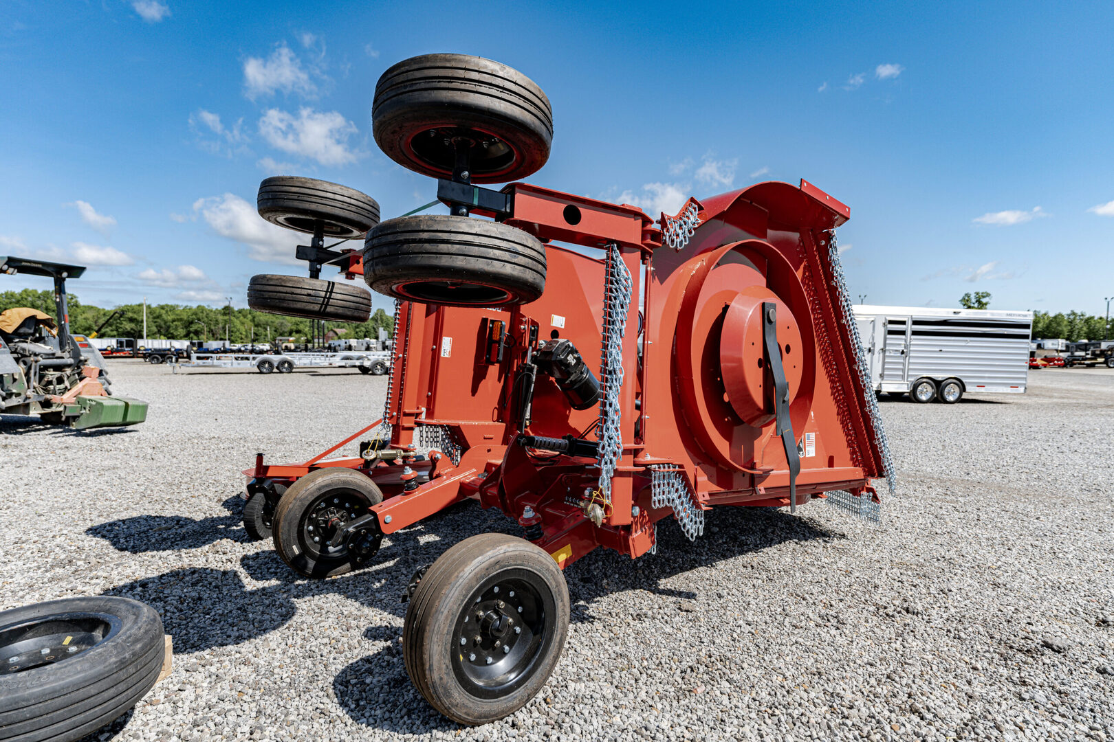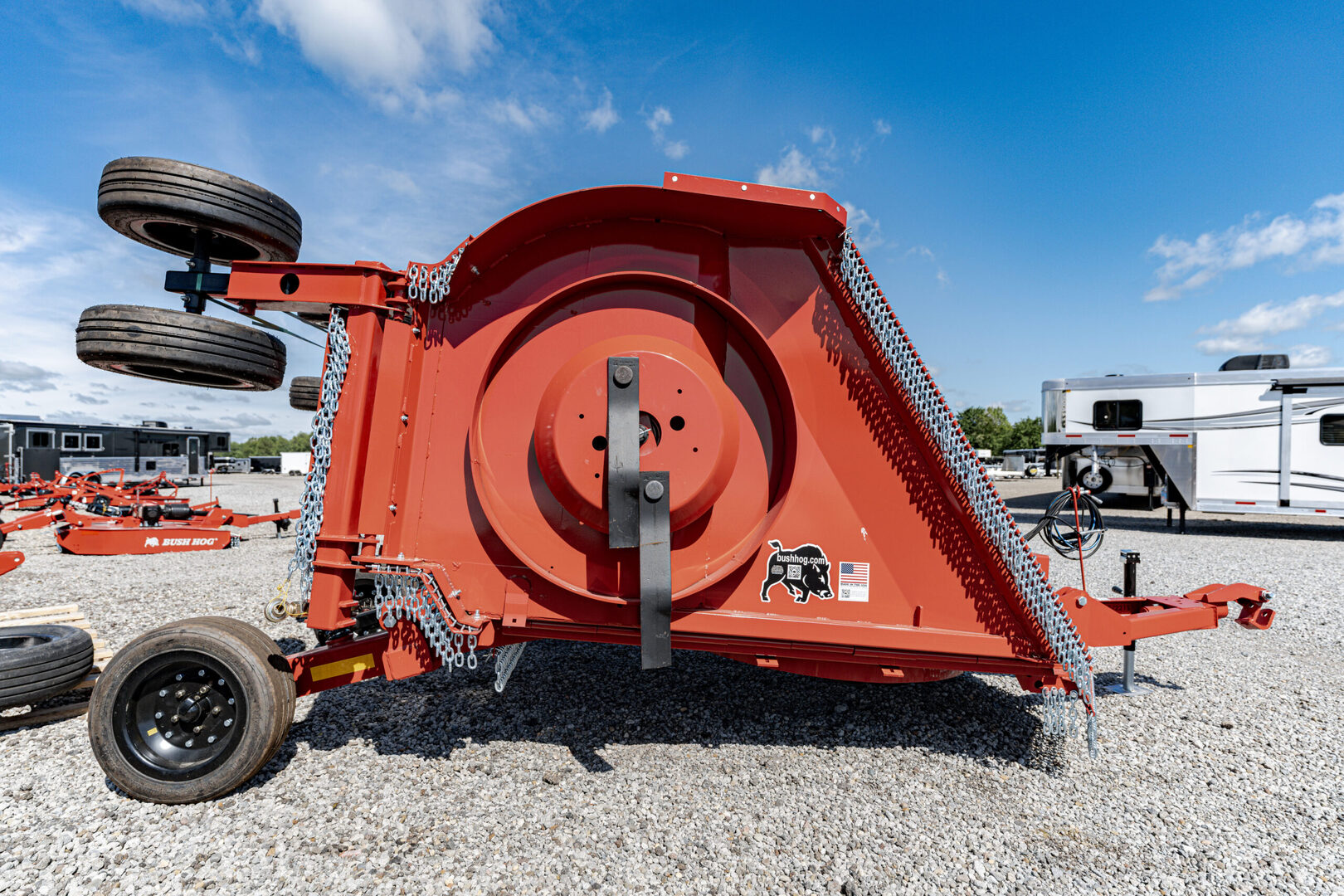 View Inventory: https://leonardtrailers.com/inventory/43501 Stock #43501 – Bush Hog 2215 Flex-Wing Rotary Cutter Medium-Duty Plus Flex-Wing The Bush Hog 2215 Flex-Wing rotary cutter is built to handle grass, weeds, and brush up to 3 1/2” in diameter. Ideal for pasture maintenance, crop shredding, and roadside upkeep, it delivers Bush Hog’s legendary durability and performance. Maintenance-friendly features like EZ Clean decks and EZ Lube drivelines make upkeep simple. Performance Features 3/8” thick wing skids with 45° turned-up edges reduce sideband damage. Center section blades align with wheels for close cutting in ditches. Grease fittings and spring steel bushings at axle pivots extend service life. Free wing float: 22° down, 45° up without hydraulic rod movement. Optional grass/row crop baffles improve material distribution. Construction Features Center section axle spindles ensure even vertical load distribution. Patent-pending oil sight gauge allows quick checking of all three cutting box oil levels. All PTO CV and wing driveline grease fittings are easily accessible. Greaseable axle pivots with spring steel bushings. Turnbuckle alignment with wing hinge pin reduces wear. Durable powder coat paint finish. Safety Features Redesigned wing sidebands minimize ground-contact damage. Financing & Delivery We offer outstanding financing options, accept trades, and provide nationwide NO HASSLE delivery. Call today at (888) 333-6613 for more information! We believe these specifications are accurate. Any discrepancies are unintentional. Please verify with a sales associate prior to purchase.       Stock Number:43501