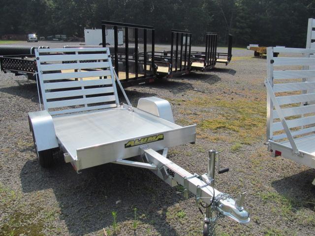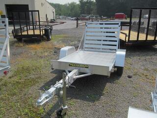 * 1200# Rubber torsion axle - No brakes - Easy lube hubs * 5.30-12 LRC (1045# cap/tire) * Silver mod wheels with 5 on 4.5 bolt pattern * Aluminum fenders * Extruded aluminum floor * 6” Front retaining bumper * A-Framed aluminum tongue, 48” long with 2” coupler * 4. Stake pockets (2 per side) * 4. Tie down loops (2 per side) * LED Lighting package, safety chains * Swivel tongue jack, 1200# capacity * Aluminum tailgate - 44.625” wide x 39” long * Overall width = 65.5” * Overall length = 120”