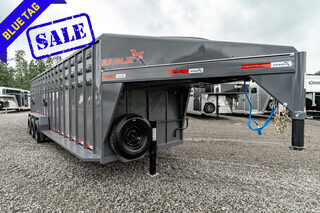 View Inventory: https://leonardtrailers.com/inventory/43750 Stock# 43750 New 2025 Eagle X EXT1680BP7K Gooseneck Stock Trailer  No matter what type of trailer you need, you may count on Eagle X to exceed your expectations on all counts. Check our product range for more details. Model:EXT1680BP7K Warranty: 1yr-Limited 3yr-Structrual Trailer Size: Dimensions: 8’ x 6’8” Eagle X Livestock Trailer, Tri-Axle Height: 6.5 Standard Interior Height Option Available Rear Gate: EXT5037 Rear Swing/Slider Gate Escape Gate: EXT5042 48” Escape Gate (Driver-Side) Floor & Axle Options: Flooring: EXT5018 Cleated Rubber Floor (28’ Trailer) Axle Upgrade: 8,000 lbs. Torsion Axle Upgrade (6) ST235/85R16 14-Ply Tires Tire Options: EXT5149 - 14-Ply Spare Tire Additional Features: Color: Shadow Grey Ventilation: 3-Vent Row Gates: Center Gates Sorting Gate (EXT5039) Rear Gate Tack Room Options: Tack Room Features: Saddle Racks Window on Tack Door Other Options: Exterior & Utility: Brush Fenders Jack Options Tie Down Options Hay Rack Option Toolbox Interior Layout: Horse Slant Clean Out Gap EXT5101 - 120 Cattle Coozies (28’ Trailer, 3 Row Vents) Lights & Hitch Options: Lighting: 1 Work Light on Each Side & 2 on the Rear Hitch Options Available Additional Trailer Specifications: Axle Load Capacity: 7K lbs Standard on 12’ - 32’ 8K lbs Standard on 32’ Suspension Axle Type: Dexter Torsion 7K Standard LCI Torsion 8K Standard Finish: Powder Coated Wheels & Tires: 16” Steel, 8-Hole Bolt Pattern 235/80R16 10-Ply Tires (Standard on 7K Axles) Running Boards Included Gates & Roof: Gates: Butterfly Gate Full Swing Center Gates Standard 39” Driver Side Calf Gates Calf Gates in Nose of Trailer Coupler Roof: Full Top Trailer Roof Side Walls: Punched Hole Sides, # Row Section Final Dimensions: Inside Height: 78” Wall Height: 84” Overall Height (Floor to Top): 94”   We offer outstanding financing options, accept trades, and can arrange nationwide NO HASSLE delivery! Inquire today for more information! (888) 333-6613 **We believe these specifications to be accurate. Any discrepancies are unintentional. Please verify information with a sales associate prior to purchase.** Stock Number:43750