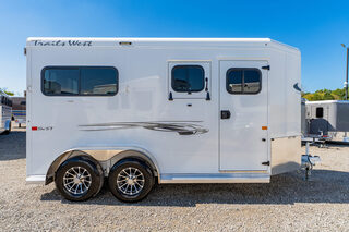 Stock# 44043 2026 Trails West ROYALE BPSXS TACK Bumper Pull Horse Trailer Do you haul a big horse? Well, look no further than the Trails West Royale. This side-by-side trailer features one of the industry’s largest stalls, giving your horse the comfort and ride they deserve. The walk-through loading style makes it a breeze to safely load and unload your horses. And our Royale Plus model allows the inside divider and hardware to be easily removed creating a single large box stall for whatever you’re looking to haul.. Warranty: 1yr- Paint/Trim 5yr- Structural Royale BP SXS Tack Horse Trailer Model Description Type: Bumper Pull Horse Trailer Layout: Side × Side Horse Stalls (Straight Load) Features: Feed doors & tack storage under manger Appearance & Branding Graphics Package: Roy-Char Logos: 1 – Charcoal Cove Logos: 1 – Charcoal Standard Equipment Axles: 3,500# Tires: ST225/75R15 LRD Optional Package Convenience Package: Royale SST   We offer outstanding financing options, accept trades, and can arrange nationwide NO HASSLE delivery! Inquire today for more information! (888) 333-6613 **We believe these specifications to be accurate. Any discrepancies are unintentional. Please verify information with a sales associate prior to purchase.** Stock Number:44043