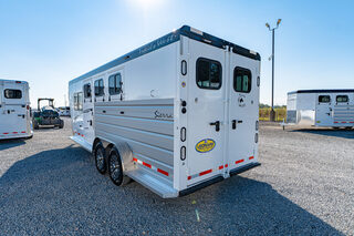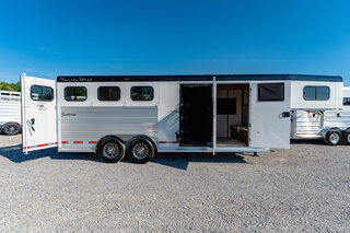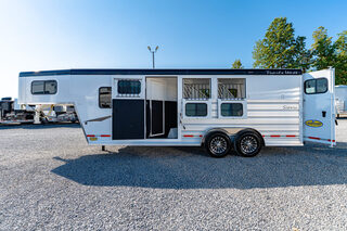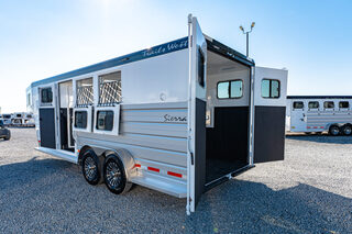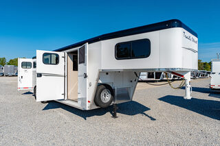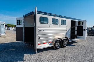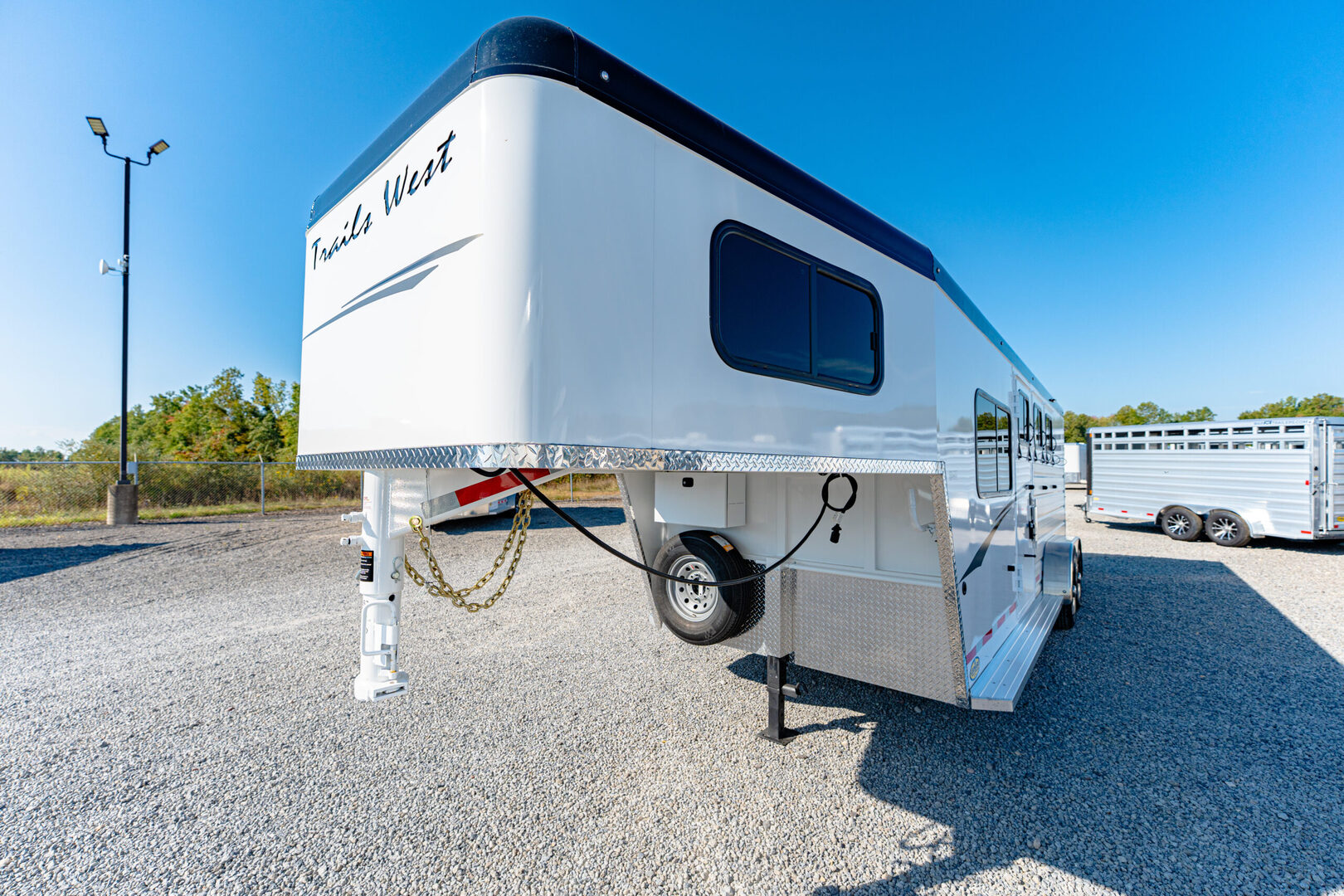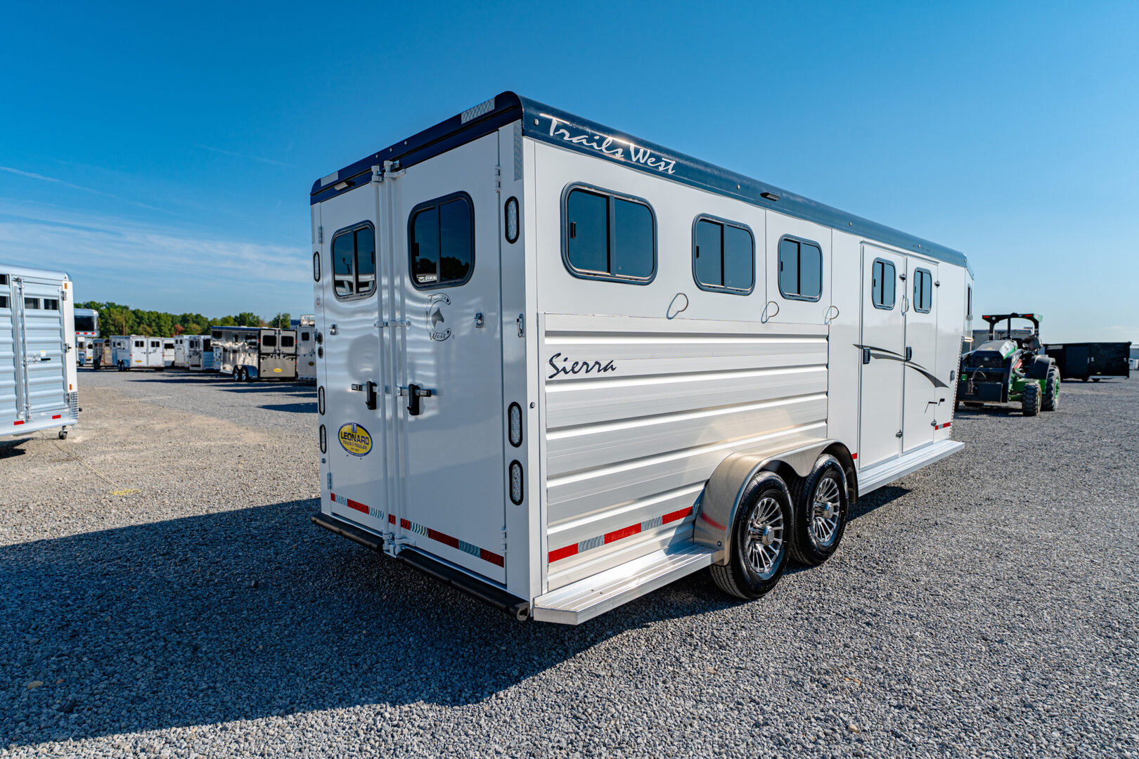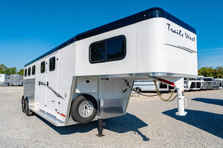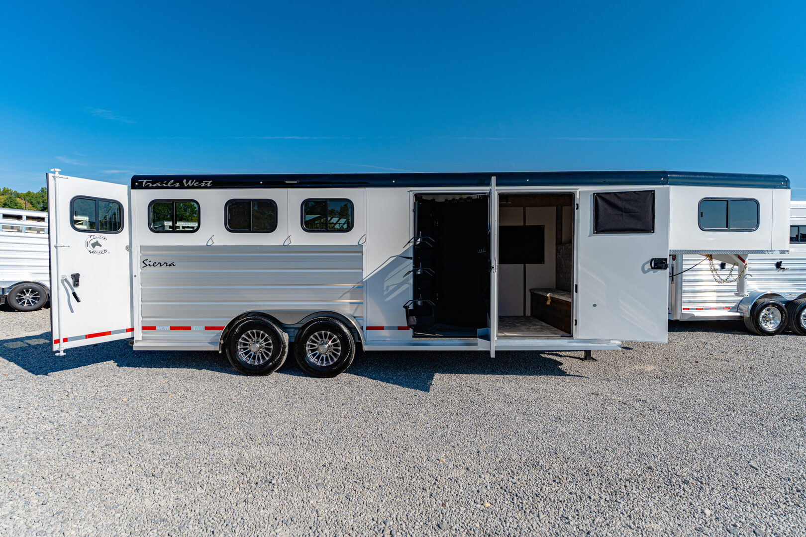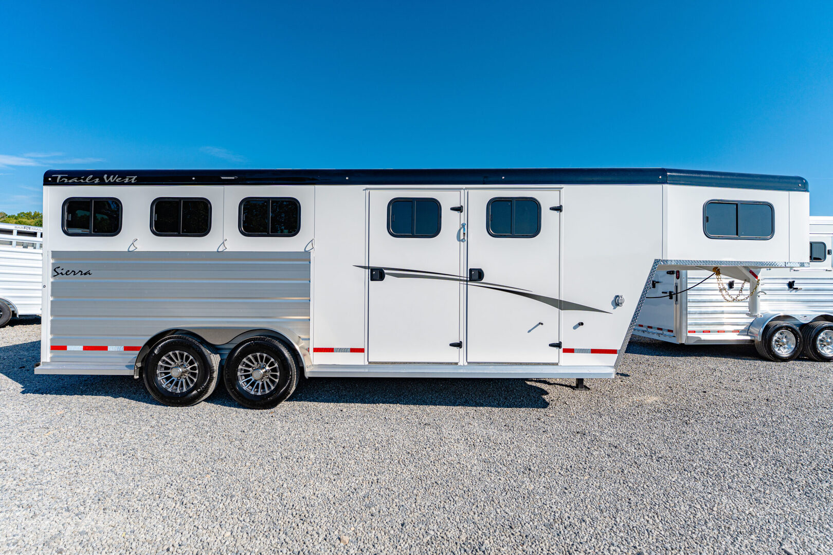 Stock# 44063 2026 Trails West SIERRA GN 3H Gooseneck Horse Trailer The Sierra is our flagship horse trailer model. It comes loaded with standard features such as aluminum wheels, anodized aluminum exterior extrusion, stainless-steel front, and fully-lined and insulated horse compartment. A fully-carpeted angle wall in the tack room allows you to hang plenty of tack without damaging your trailer. Its abundance of features make this THE trailer that serious equine enthusiasts are looking for. Warranty: 1yr- Paint/Trim 5yr- Structural Model: SIERRA GN 3H Model Information Model: Sierra GN 3-Horse Type: Gooseneck, Slant Load, Horse Trailer Horse Compartment: Fully enclosed Windows: Drop-down feed windows (head side) Sliding windows (tail side) Graphics & Logos Graphics Package: Zen-Char Logos: 1 - Charcoal Cove Logos: 5 - Silver Standard Features Axles: 6000# Tires: ST235/80R16 LRE Additional Features & Packages Black Roof Cove Boot Box Additional – Comfort Package Comfort Package 5x5 Convenience Package w/16” LRE on Gray Cooler in Boot Box – Comfort Package Pass Through Door Pre-Wire for A/C Side Escape with Feed Door Side Tack Window 24 x 48 Driver     We offer outstanding financing options, accept trades, and can arrange nationwide NO HASSLE delivery! Inquire today for more information! (888) 333-6613 **We believe these specifications to be accurate. Any discrepancies are unintentional. Please verify information with a sales associate prior to purchase.** Stock Number:44063
