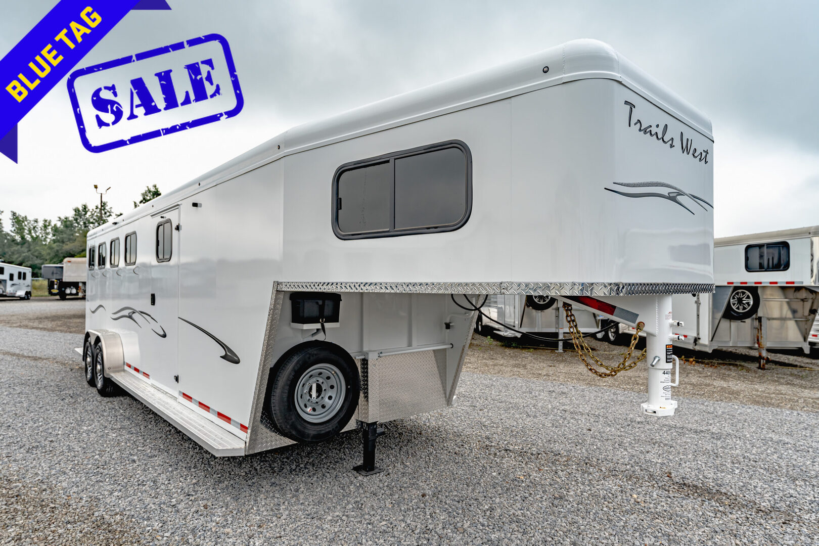 View Inventory: https://leonardtrailers.com/inventory/44064 Stock# 44064 2026 Trails West CLASSIC GN 4-HORSE Gooseneck Horse Trailer Our Classic model is constructed with a steel frame and aluminum skins.  It’s 7’0? wide, and 7’0? tall and comes standard with custom drop-down feed doors with face grills on the head side, sliding windows on the tail side, and a roof vent in each stall.  The large 41? stalls provide plenty of room and comfort for your horse and feature the industry’s best slam latch divider system.  The tack room is roomy and functional and features our state-of-the-art swing-out saddle and blanket racks. Warranty: 1yr- Paint/Trim 5yr- Structural Model: Classic GN 4-Horse Model Description: Gooseneck, slant load horse trailer Drop down feed windows (head side) Graphics Package: Rib-Char Logos: 1-Charcoal Cove Logos: 1-Charcoal Standard Axles: 6000# Standard Tires: ST235/80R16 LRE Upgrades / Options: Axle upgrade from 6K to 7K Convenience package with 16” LRE on gray Panel & insulated (Super Tack) Side escape with feed door Super Tack (5x10 with double door) Window, rear gate 16 x 22   We offer outstanding financing options, accept trades, and can arrange nationwide NO HASSLE delivery! Inquire today for more information! (888) 333-6613 **We believe these specifications to be accurate. Any discrepancies are unintentional. Please verify information with a sales associate prior to purchase.** Stock Number:44064