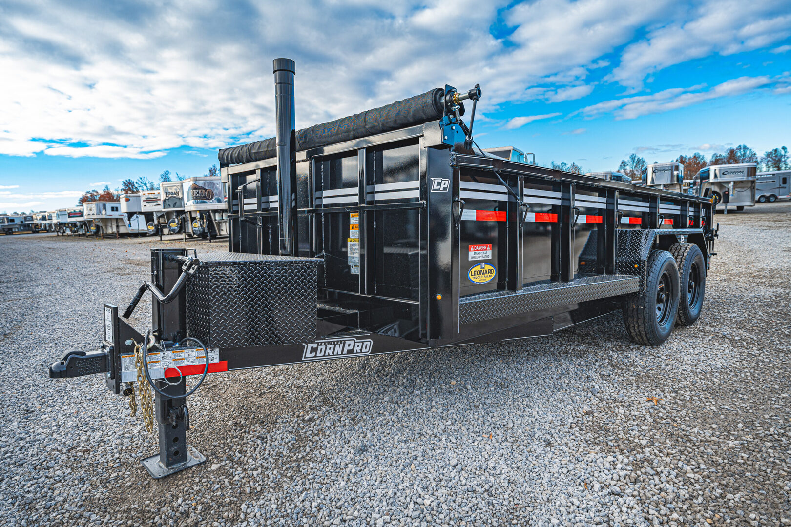 View Inventory: https://leonardtrailers.com/inventory/44185 Stock# 44185 New 2026 Corn Pro DB-16 S Dump Trailer Got a business that requires easy-haul, easy-unload, and the need to handle the toughest conditions? Step up to the toughest dump trailer in the industry. With strength built into every corner, you’ve got 12-gauge sides on a 10-gauge floor, with 2” x 2” tubing uprights and 11-gauge diamond plate fenders, and running boards – all lifted with a ChampionTM scissor hoist. Haul what you’ve got without a worry. Model: DB-16 S Warranty: 1yr- Limited DB-S Commercial Dump Trailer (Black) Model DB-16 S Standard Features Frame: 2”x8”x3/16” tube Crossmembers: 2”x3”x3/16” tube Tongue: 6” channel Axles: Dexter Toflex, 7K Coupler: Demco, adjustable, 2 5/16” Jack: Jost, 12K (4” square) Dump Bed: 81” wide, 24” tall sides Hoist: Scissor hoist Hydraulics: Electric/Hydraulic, power up and down Tires: ST235/80R16 E, 8 bolt Lighting: LED Ramps: Available as option Tie Downs: (6) D-rings in bed Rear Door: Spreader gate and barn doors Additional Options Front telescopic hoist Roll tarp kit Contractor Package   We offer outstanding financing options, accept trades, and can arrange nationwide NO HASSLE delivery! Inquire today for more information! (888) 333-6613 **We believe these specifications to be accurate. Any discrepancies are unintentional. Please verify information with a sales associate prior to purchase.** Stock Number:44185