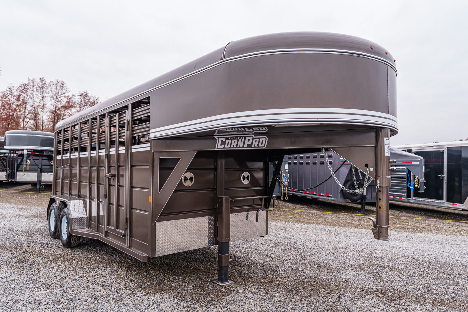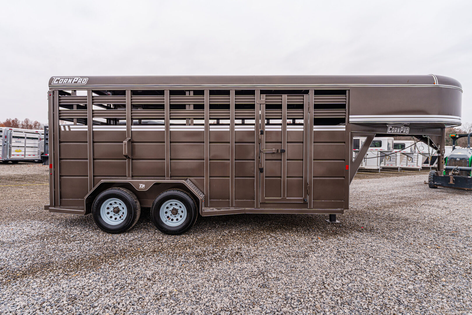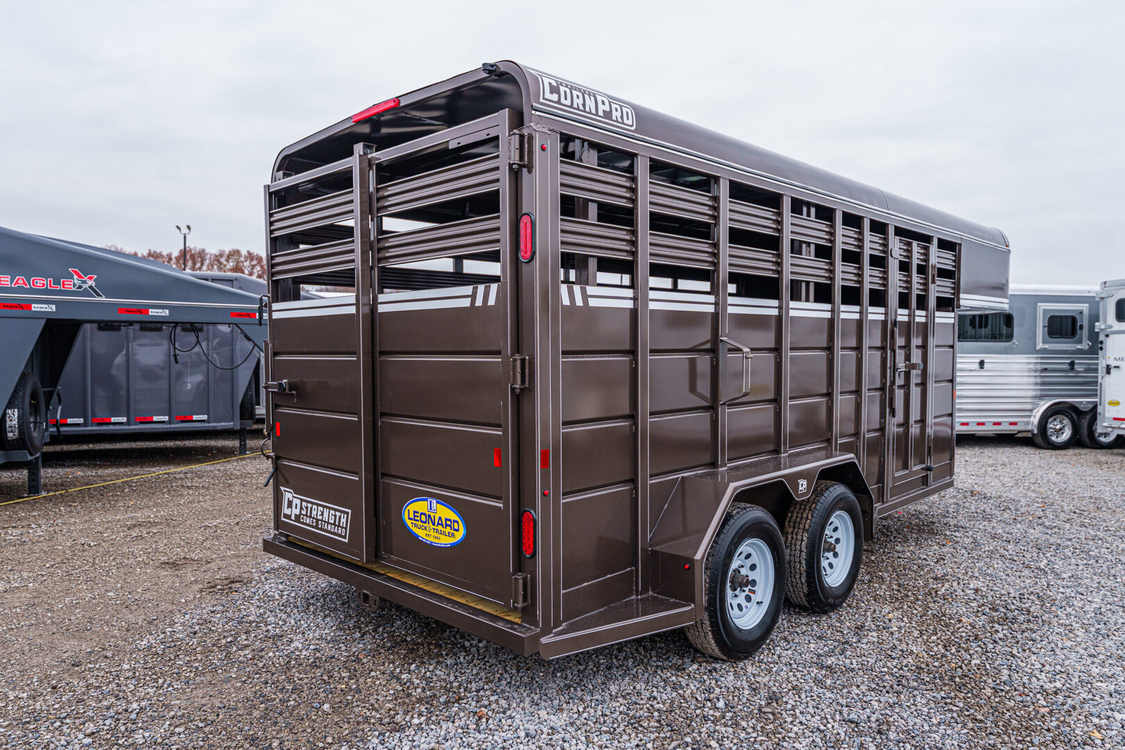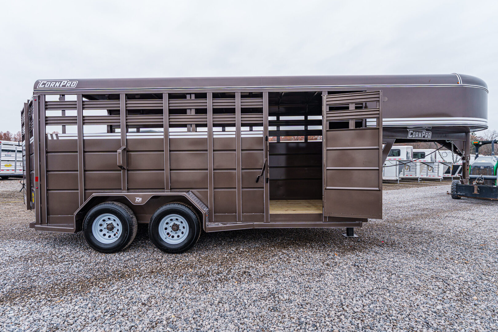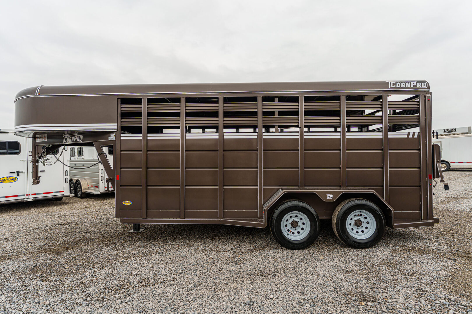 View Inventory: https://leonardtrailers.com/inventory/44212 Stock# 44212 New 2026 Corn Pro SG-16 Gooseneck Stock Trailer For professionals, or hobbyists that want the professional grade, CornPro brings durability with Dexter Torflex torsion axles and huge structural angle frames. Aluminum tread plate rock guards and kiln-dried pine flooring keeps it strong for years to come. Keep it standard or make it your own with five color choices and lots of customized options. Model:SG-16 Warranty: 1yr- Limited Trailer information: Color: AZ Beige Standard Features Frame: 3” × 5” × 1/4” angle iron Crossmembers: 3” × 2” × 3/16”, 24” on-center Tongue: 4” channel Coupler: B&W, 2-5/16” Jack: Jost, 12K with driver-side crank Axles (12’, 14’, 16’): Dexter Torflex, 3,500 lb Axles (18’, 20’, 22’, 24’): Dexter Torflex, 6,000 lb Tires: For 3.5K axle: 15E, 6-bolt For 6K axle: 16E, 8-bolt Side & Front Sheet: 14-gauge steel Roof Sheet: 16-gauge steel Wall Posts: 1” × 3” tube, 24” on-center Rear Door: Full swing with 1/2-slide Center Gate: Full swing Lighting: LED, one dome light We offer outstanding financing options, accept trades, and can arrange nationwide NO HASSLE delivery! Inquire today for more information! (888) 333-6613 **We believe these specifications to be accurate. Any discrepancies are unintentional. Please verify information with a sales associate prior to purchase.** Stock Number:44212