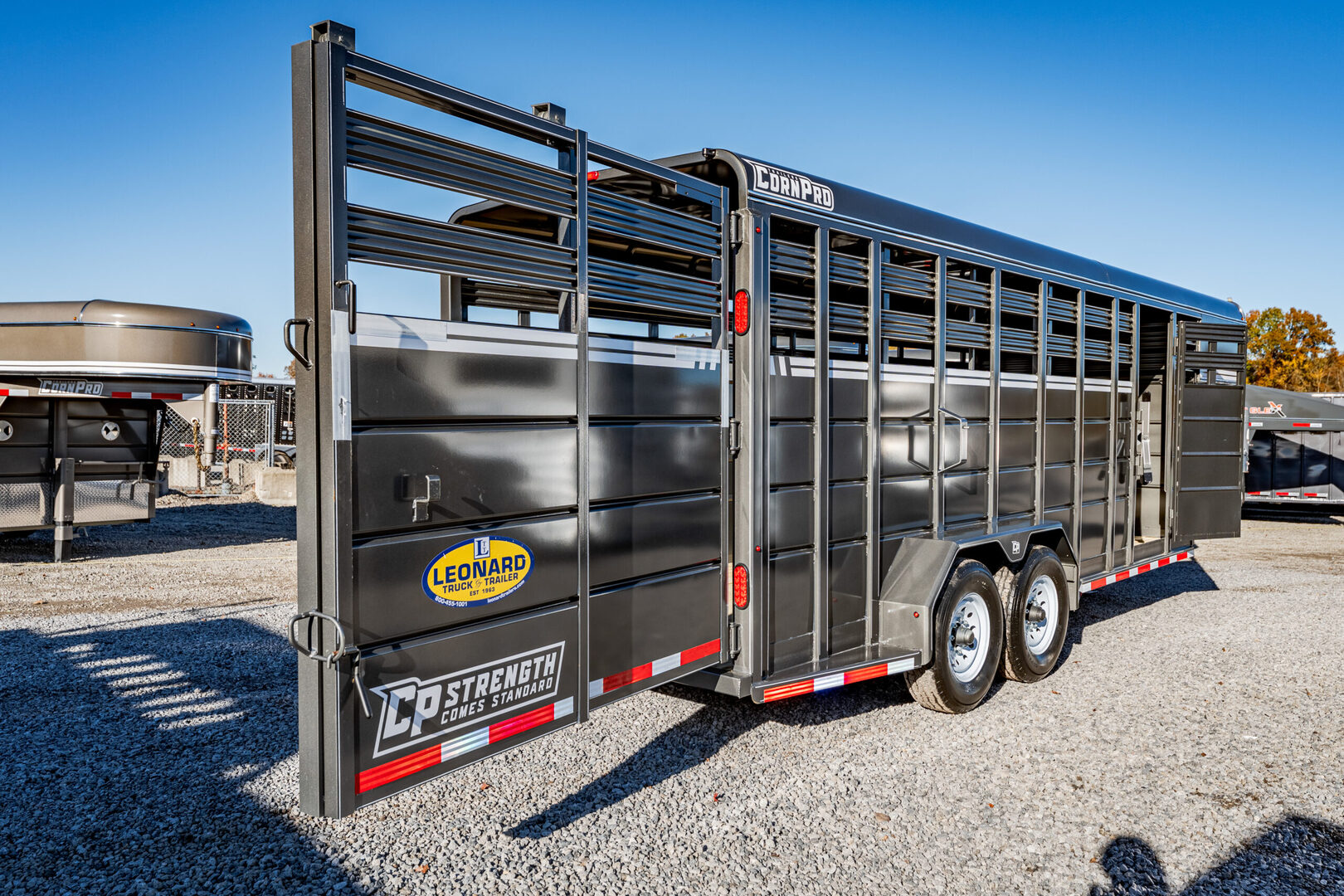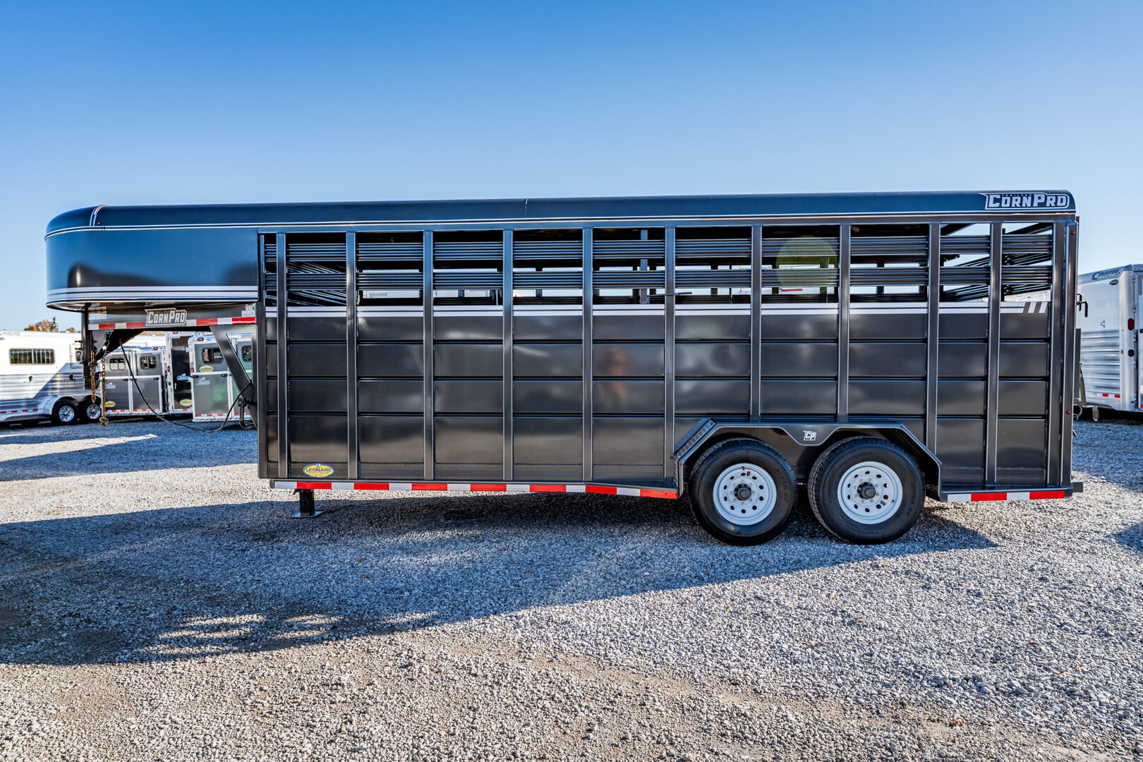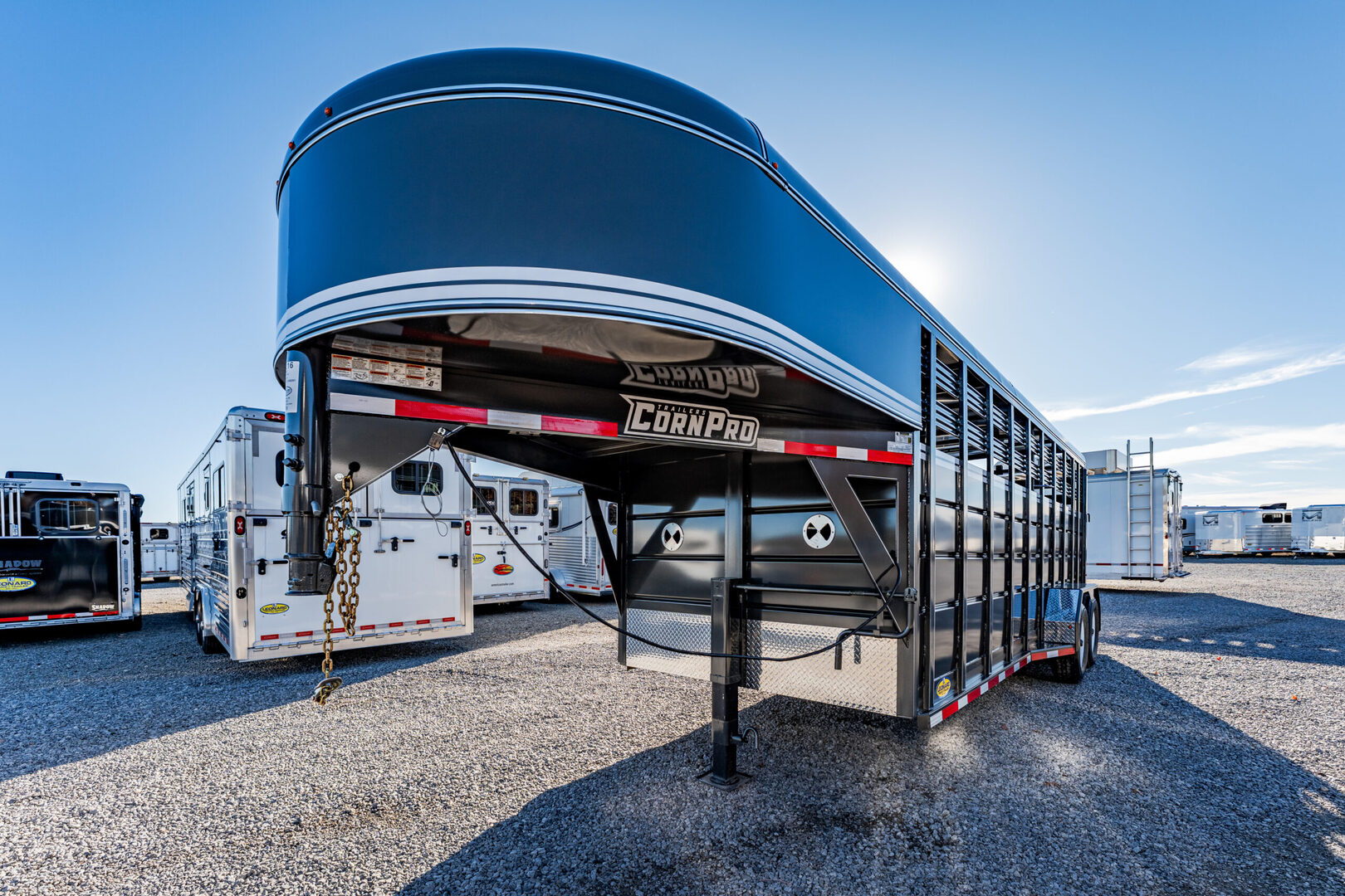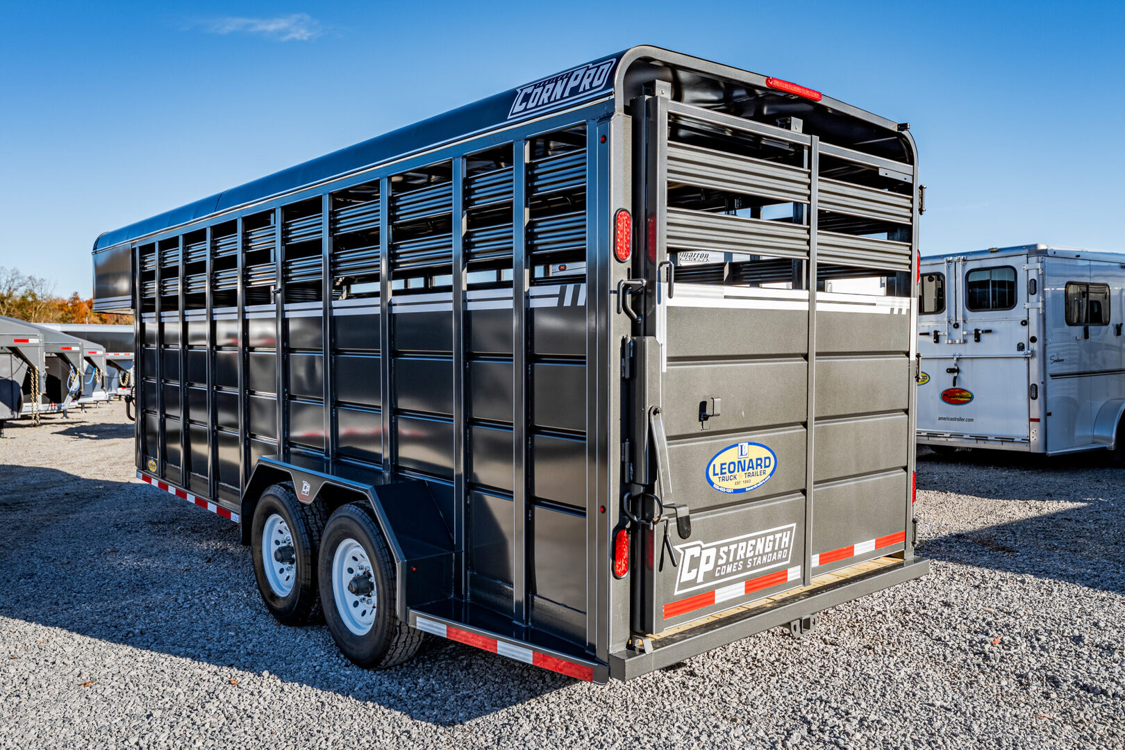 View Inventory: https://leonardtrailers.com/inventory/44216 Stock# 44216 New 2026 Corn Pro SG-20 Gooseneck Stock Trailer For professionals, or hobbyists that want the professional grade, CornPro brings durability with Dexter Torflex torsion axles and huge structural angle frames. Aluminum tread plate rock guards and kiln-dried pine flooring keeps it strong for years to come. Keep it standard or make it your own with five color choices and lots of customized options. Model:SG-20 Warranty: 1yr- Limited Trailer information: Color: Gray Height: 7 ft tall Standard Features Frame: 3” x 5” x 1/4” angle iron Crossmembers: 3” x 2” x 3/16”, 16” o.c. Tongue: 4” channel Coupler: B&W, 2-5/16 Jack: Jost, 12K with driver-side crank Axles (14’, 16’): Dexter Torflex, 6,000# Axles (8’, 20’, 22’, 24’): Dexter Torflex, 7,000# Tires: ST235/80R16 E, 8-bolt Side & Front sheet: 14 gauge Roof sheet: 16 gauge Wall posts: 1” x 3” tube, 16” o.c. Rear door: Full swing & 1/2 slide Center gate: Full swing (2 center gates in 24’) Lighting: LED, 1 dome light We offer outstanding financing options, accept trades, and can arrange nationwide NO HASSLE delivery! Inquire today for more information! (888) 333-6613 **We believe these specifications to be accurate. Any discrepancies are unintentional. Please verify information with a sales associate prior to purchase.** Stock Number:44216