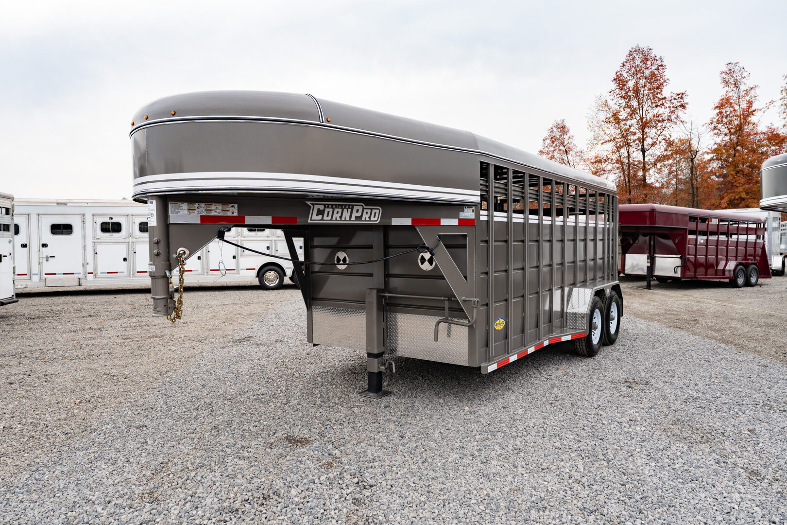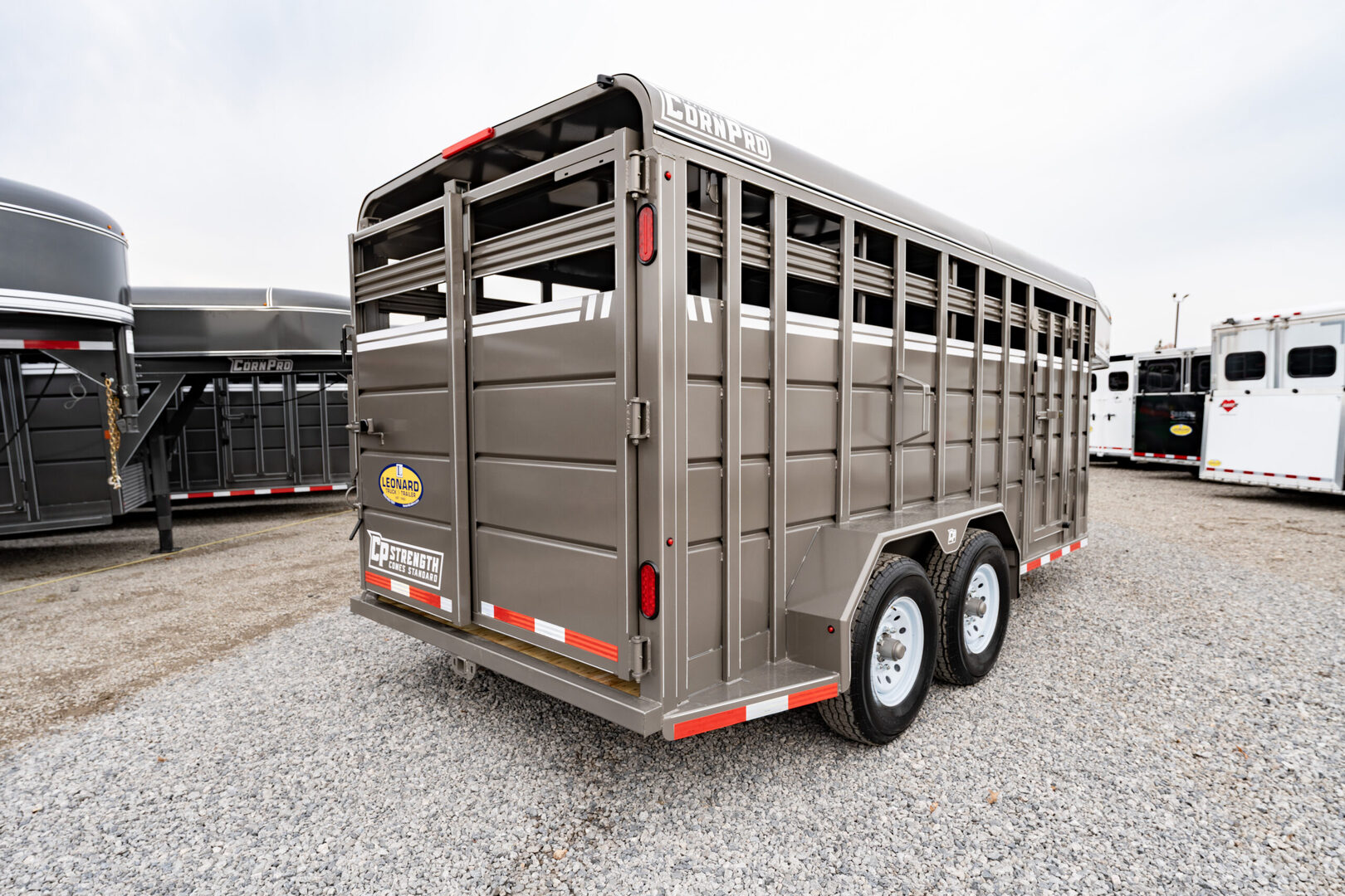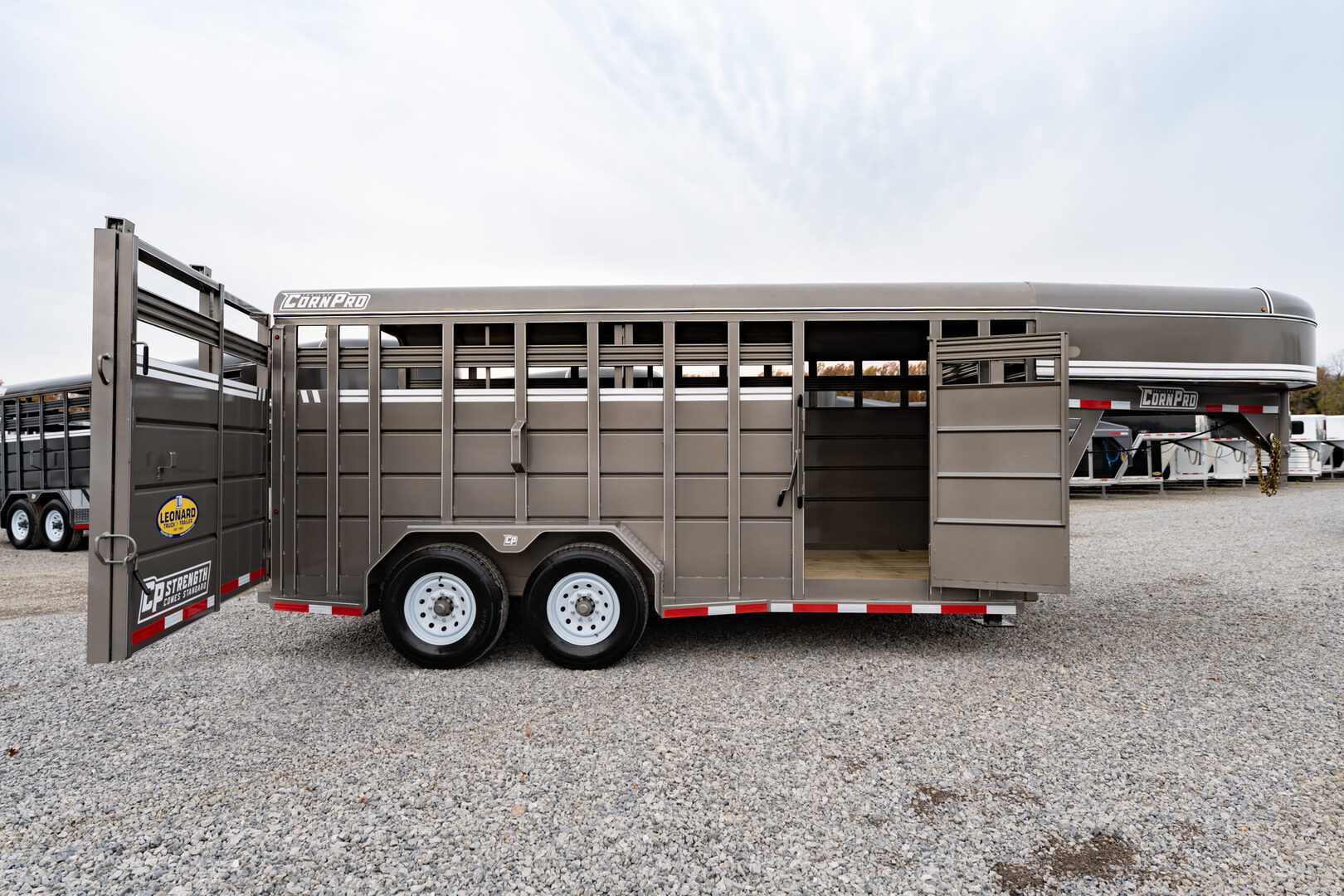 View Inventory: https://leonardtrailers.com/inventory/44198 Stock# 44198 New 2026 Corn Pro SG-16 Gooseneck Stock Trailer For professionals, or hobbyists that want the professional grade, CornPro brings durability with Dexter Torflex torsion axles and huge structural angle frames. Aluminum tread plate rock guards and kiln-dried pine flooring keeps it strong for years to come. Keep it standard or make it your own with five color choices and lots of customized options. Model:SG-16 Warranty: 1yr- Limited Trailer information: Color: PEWTER Standard Features Frame: 3” × 5” × 1/4” angle iron Crossmembers: 3” × 2” × 3/16”, 24” on-center Tongue: 4” channel Coupler: B&W, 2-5/16” Jack: Jost, 12K with driver-side crank Axles (12’, 14’, 16’): Dexter Torflex, 3,500 lb Axles (18’, 20’, 22’, 24’): Dexter Torflex, 6,000 lb Tires: For 3.5K axle: 15E, 6-bolt For 6K axle: 16E, 8-bolt Side & Front Sheet: 14-gauge steel Roof Sheet: 16-gauge steel Wall Posts: 1” × 3” tube, 24” on-center Rear Door: Full swing with 1/2-slide Center Gate: Full swing Lighting: LED, one dome light We offer outstanding financing options, accept trades, and can arrange nationwide NO HASSLE delivery! Inquire today for more information! (888) 333-6613 **We believe these specifications to be accurate. Any discrepancies are unintentional. Please verify information with a sales associate prior to purchase.** Stock Number:44198