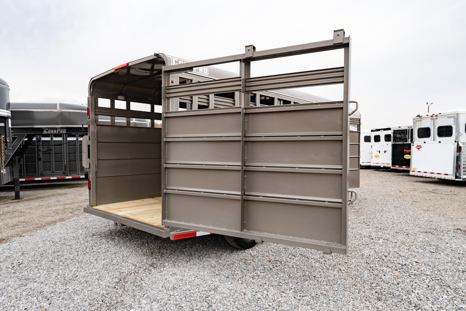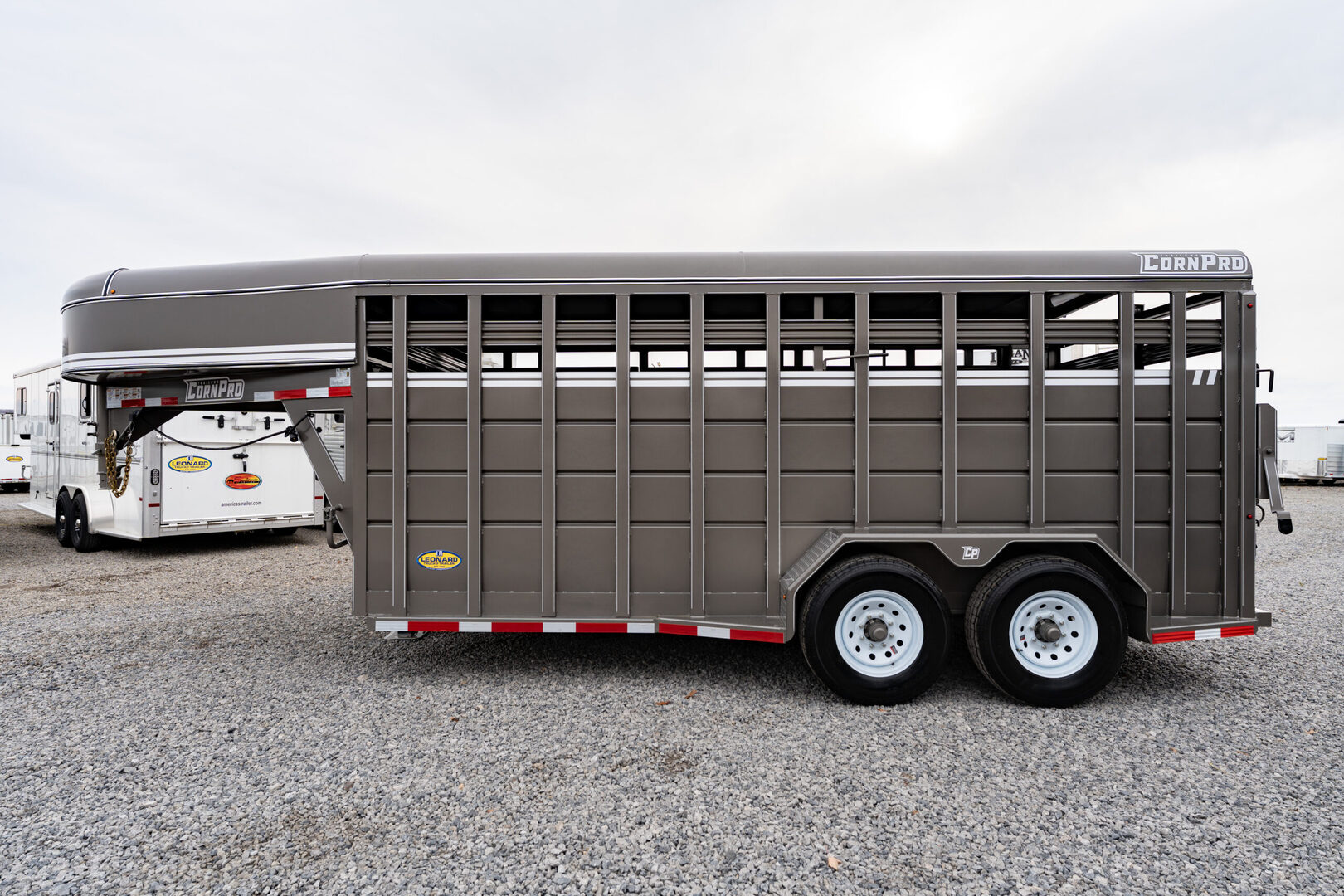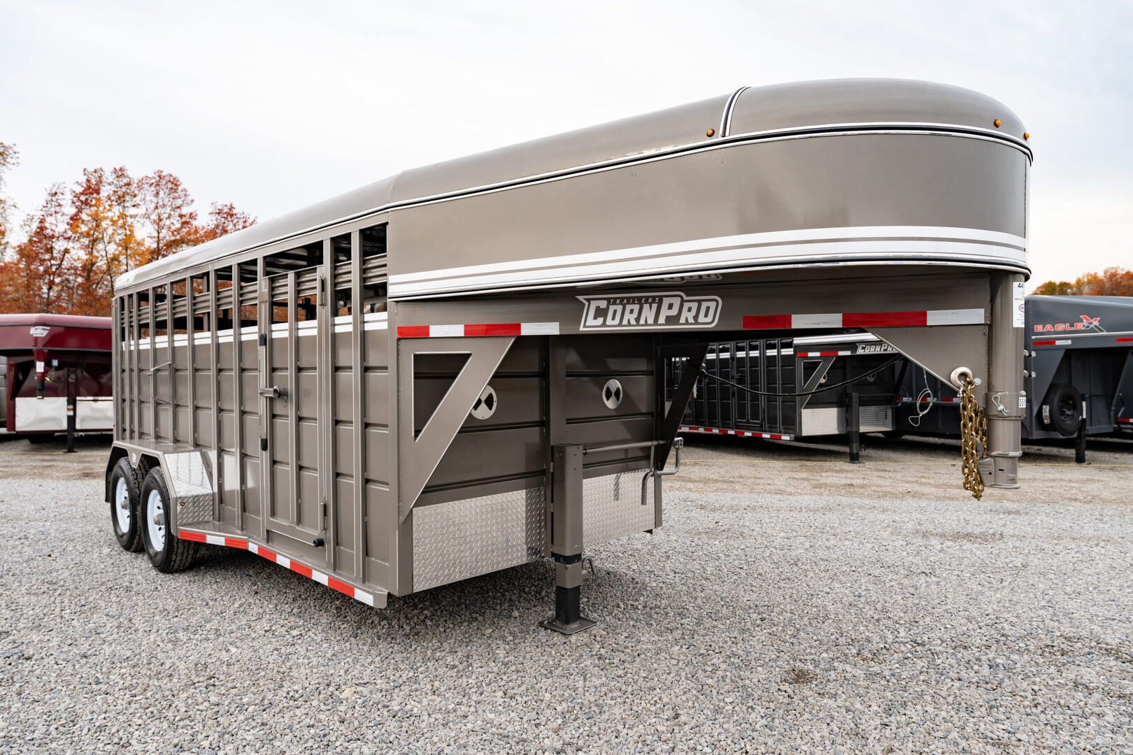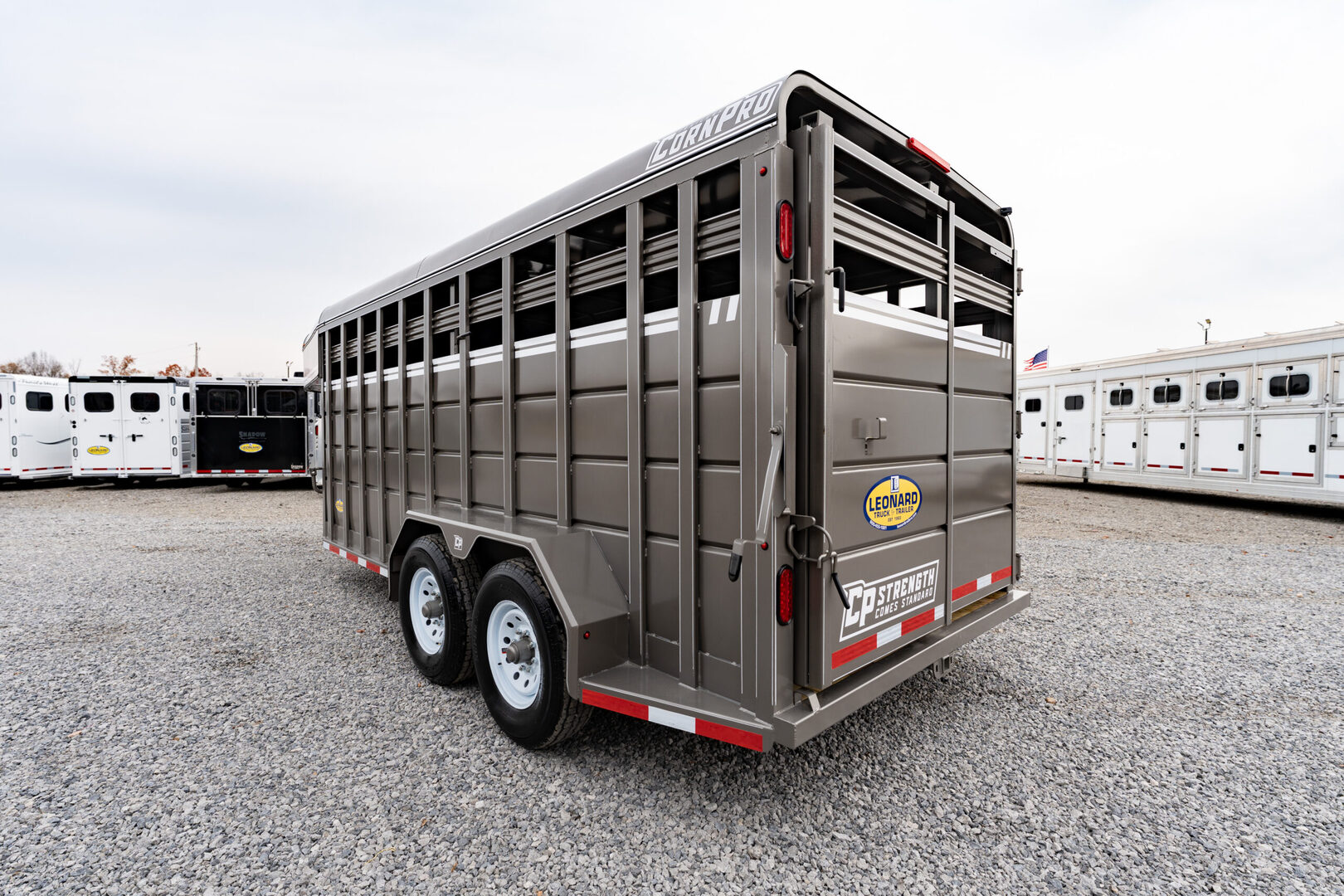 View Inventory: https://leonardtrailers.com/inventory/44198 Stock# 44198 New 2026 Corn Pro SG-16 Gooseneck Stock Trailer For professionals, or hobbyists that want the professional grade, CornPro brings durability with Dexter Torflex torsion axles and huge structural angle frames. Aluminum tread plate rock guards and kiln-dried pine flooring keeps it strong for years to come. Keep it standard or make it your own with five color choices and lots of customized options. Model:SG-16 Warranty: 1yr- Limited Trailer information: Color: PEWTER Standard Features Frame: 3” × 5” × 1/4” angle iron Crossmembers: 3” × 2” × 3/16”, 24” on-center Tongue: 4” channel Coupler: B&W, 2-5/16” Jack: Jost, 12K with driver-side crank Axles (12’, 14’, 16’): Dexter Torflex, 3,500 lb Axles (18’, 20’, 22’, 24’): Dexter Torflex, 6,000 lb Tires: For 3.5K axle: 15E, 6-bolt For 6K axle: 16E, 8-bolt Side & Front Sheet: 14-gauge steel Roof Sheet: 16-gauge steel Wall Posts: 1” × 3” tube, 24” on-center Rear Door: Full swing with 1/2-slide Center Gate: Full swing Lighting: LED, one dome light We offer outstanding financing options, accept trades, and can arrange nationwide NO HASSLE delivery! Inquire today for more information! (888) 333-6613 **We believe these specifications to be accurate. Any discrepancies are unintentional. Please verify information with a sales associate prior to purchase.** Stock Number:44198