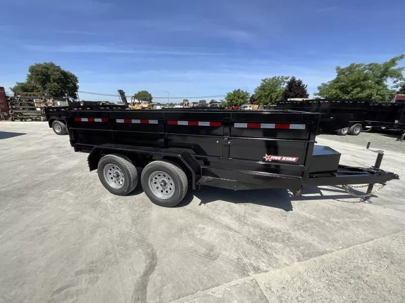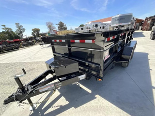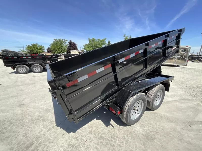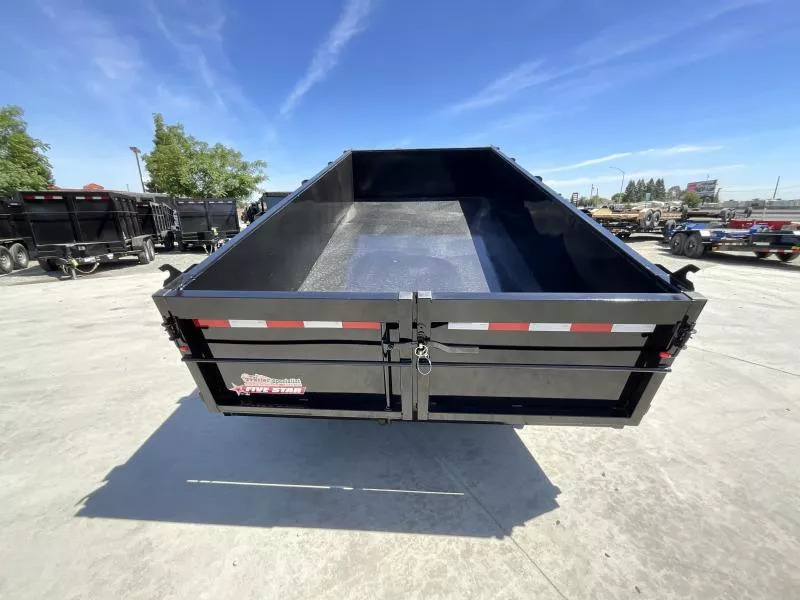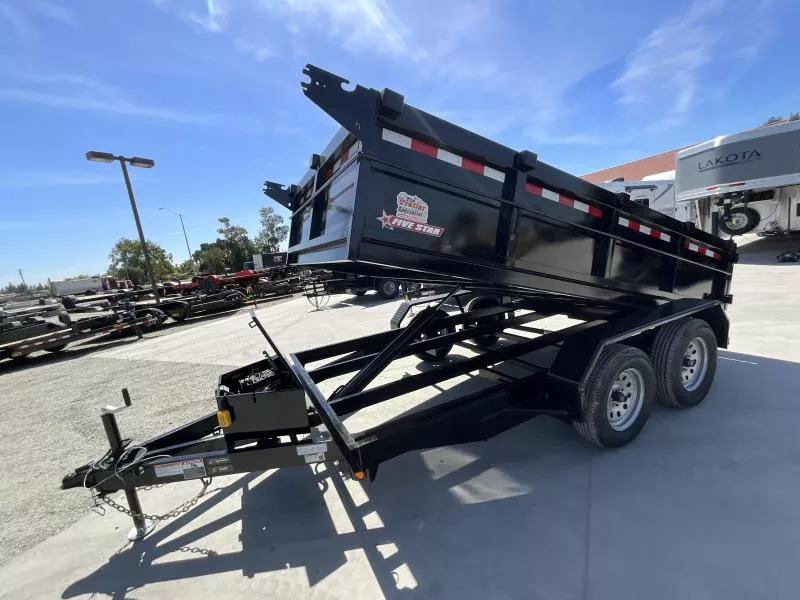 New 2025 Five Star DT212 D7 6X12 Dump Trailer 7K GVWR GVWR: 7,000 LBS Empty weight: 2,280 LBS Payload: 4,720 LBS STANDARD FEATURES: 4” channel frame, 2x2 tubing sidewall frame, 3x2 uprights, 5” channel tongue. 14g steel sides 12g steel floors 12 volt double acting hydraulic pump with a 10k hydraulic cylinder 12 volt deep cycle battery and a 110V charger Cam lock double rear swing doors lockable pump and battery box two 3500# axles with electric brakes on one 15” tires and wheels LED lighting While we always strive for complete accuracy, please confirm specifications with one of our sales reps.