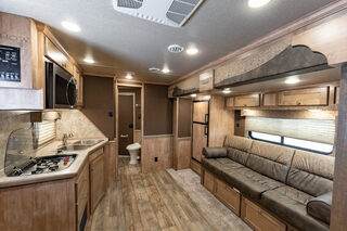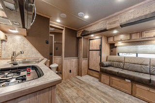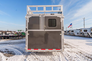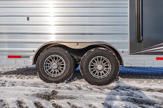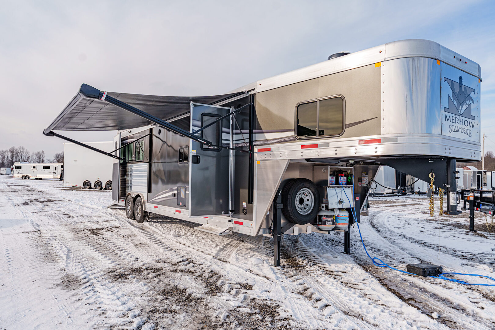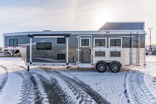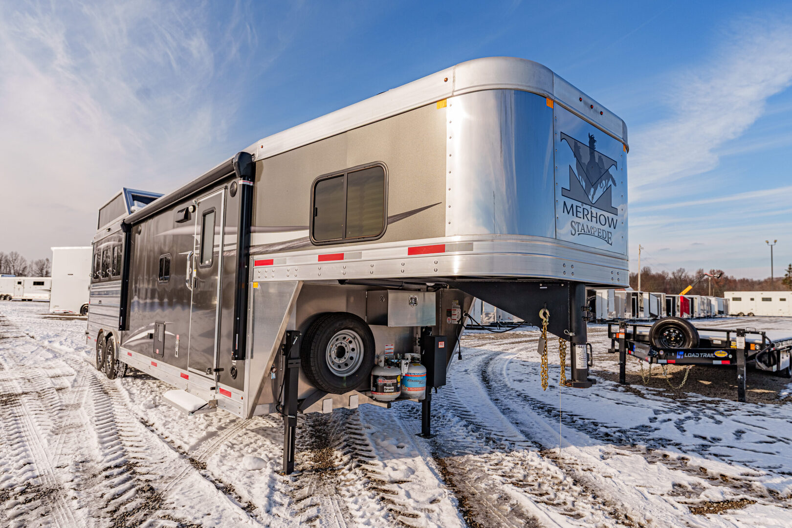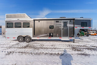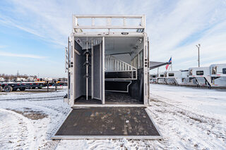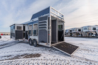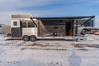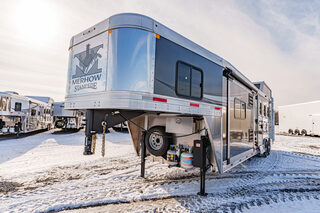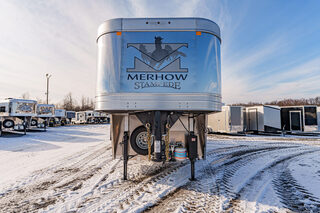 View Inventory: https://leonardtrailers.com/inventory/44270 Stock# 44270 New 2026 Merhow 8312-ARKS STAMPEDE Gooseneck Horse Trailer with Living Quarters The Stampede by Merhow is LOADED with standard features! The trailer offers the same Super-Structure as our Next Generation, the same 2/8 MFG warranty with an economically-built interior that offers premium vinyl with hardwood fascia and cabinet doors that will WOW you at first glance! Warranty: 2yr Living Quarter, 8yr Structural  Key Specifications Estimated Trailer Body Width: 8’ Estimated Belly Length: 27.17’ Estimated Overall Length: 35.167’ Exterior Skin Color: Black Exterior & Structural Features 40” stall setting, extruded aluminum floor, one-piece aluminum roof Drop-down feed windows on all head and escape doors Escape door (3 horse and larger models) with paddle latch & butterfly latch Rubber mats in horse area and rear tack 4-tier aluminum blanket bar in rear tack Rear collapsible tack with tie-back Interior Living Quarters Features Solid wood cabinet faces & flat panel cabinet doors Crown molding in main LQ, kitchen, and front bunk Laminate countertops with wood edges Soft-touch walls and ceiling, decorative panel ceiling Linoleum flooring in main LQ and bathroom, carpeted front bunk Kitchen backsplash laminate, overhead cabinets above seating White shower pan with opaque door, foot flush RV toilet Sky-dome above shower, stainless steel sinks High-velocity vent fan in bathroom AM/FM/CD/DVD radio with inside & outside speakers TV prep with antenna, 32” smart TV (size varies by model) Powered awning with LED light strip RV queen mattress in front bunk Fresh water tank: 38 gal, Gray water: 35 gal, Black water: 35 gal Selected Options & Upgrades Stainless steel nose wrap 16”, 8-lug gunmetal aluminum wheels with Westlake range E tires (ST235/80R16) Medium exterior graphics package Upgrade from single to dual leg hydraulic jack Install add-a-rail structural reinforcement Porcelain toilet upgrade Convection microwave upgrade Two-tone seating upgrade Electric fireplace Upgrade to 10-gallon DSI water heater Black tank rinse assist Interior Color Scheme Cabinet Color: Guan Tree Floor Color: Voyager Laredo Wall Color: McBeal Chocolate Ceiling Color: Apex Horizon (Panel) Countertop Color: Belmont Granite Seating: Donghia Java with Diviani Mushroom Accent We offer outstanding financing options, accept trades, and can arrange nationwide NO HASSLE delivery! Inquire today for more information! (888) 333-6613 **We believe these specifications to be accurate. Any discrepancies are unintentional. Please verify information with a sales associate prior to purchase.** Stock Number:44270