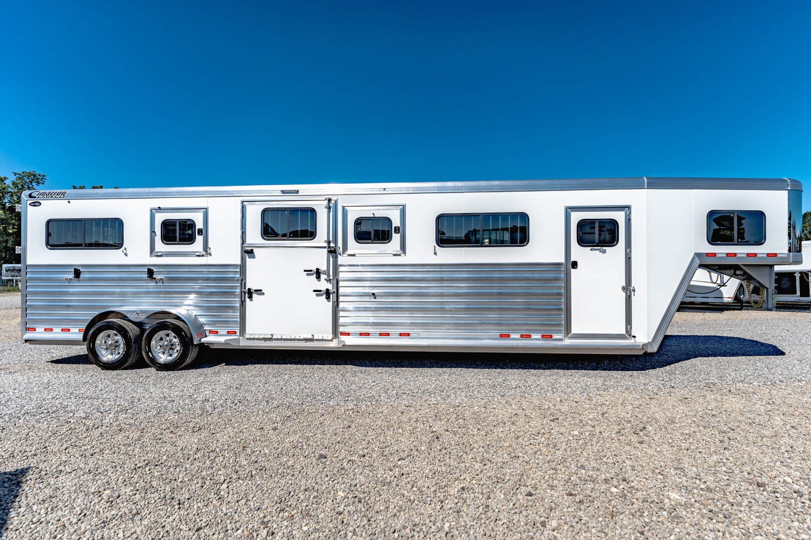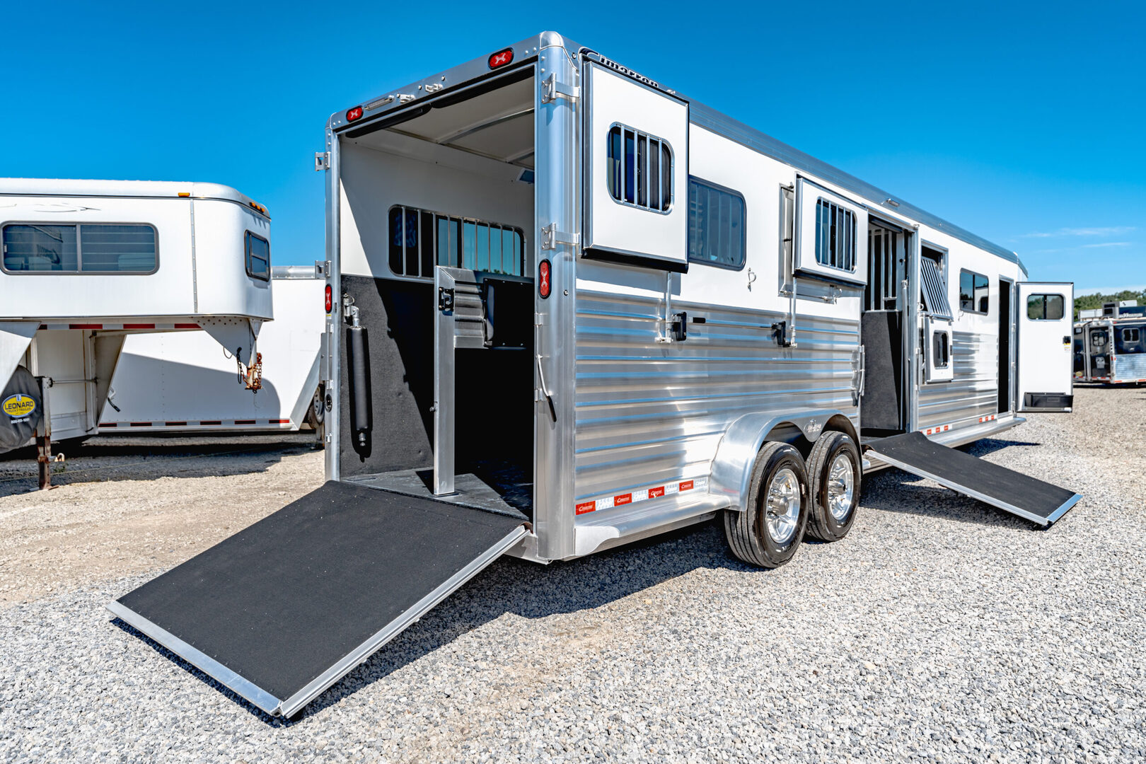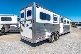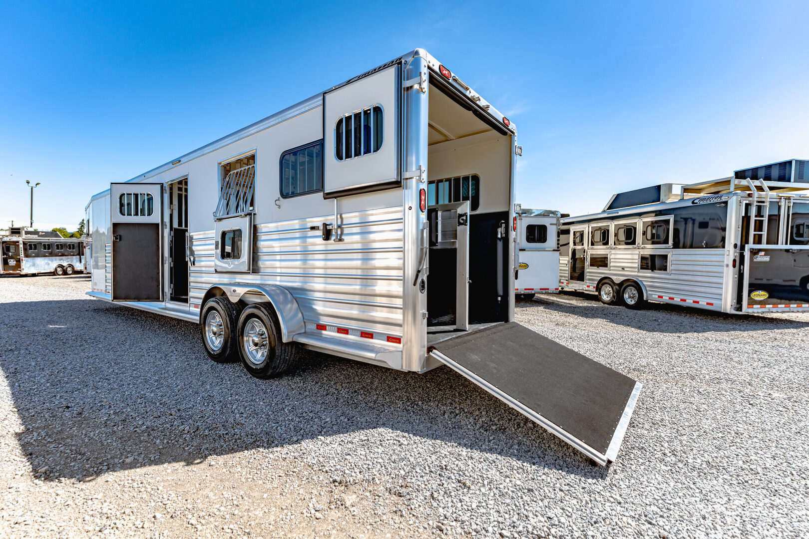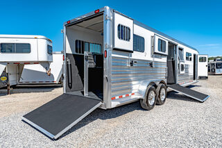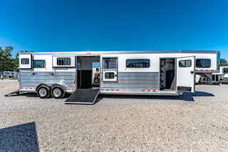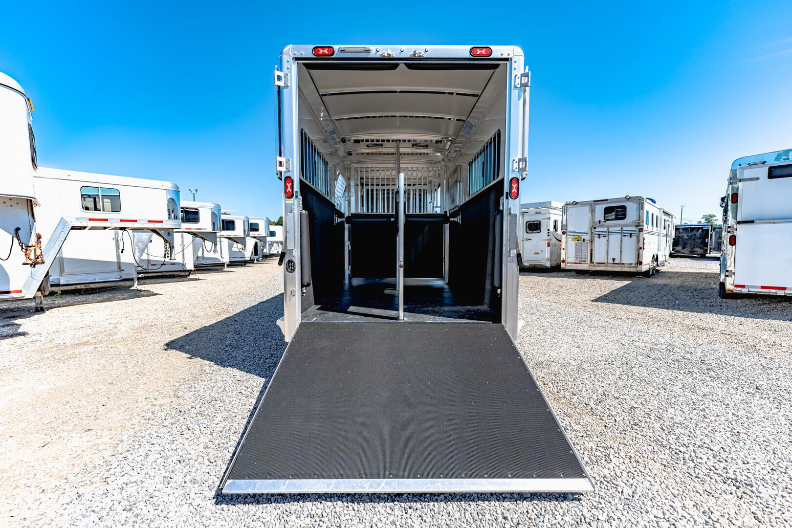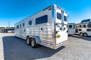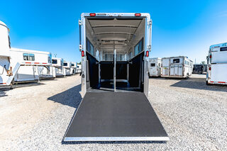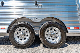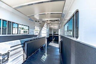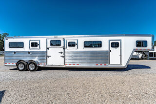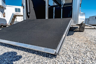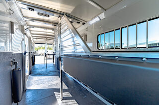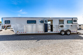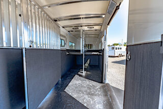 Drive train 7,000# Dexter torsion axles -extruded side slats at stall area, lower body running boards are full length, led awning lights, solid partition wall, full height and width of front tack wall, primary door front tack room door 32’’ wide, carpet floor, GN wall and GN deck, sliding type of windows for front tack, ramp 54’’ tall with swing around doors above in stall area, head side fold down type with safety bars feed doors, full center gate -bars above, ramps side -60’’ wide x54’’ upper door and rest. Strap, 2 partial dividers, swinging solid type for head grills, dome lights, adjustable saddle rack, added recessed paddle latch on side access door, window slider 19x34 in stall area, -in partition wall 54’’ from floor, centered, extra divider location, straight load to move both dividers to LH side wall, use 30’’ bolster pads on butt and breast bars, adjustable fold down bar at side ramp. Call for more details!! **We believe that these specifications to be accurate. Any discrepancies are unintentional. Please verify information with a sales associate prior to purchase.** Stock Number:44271