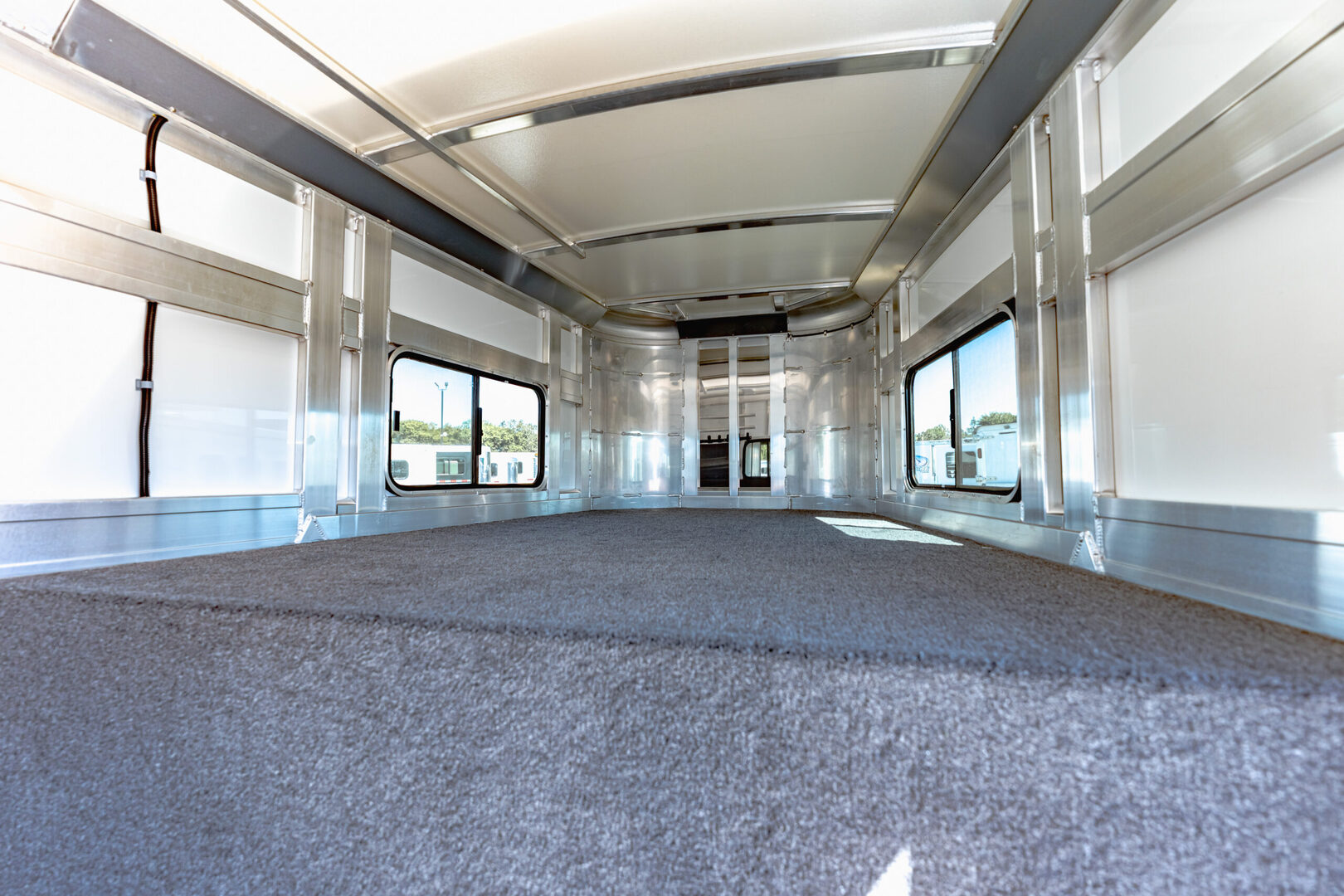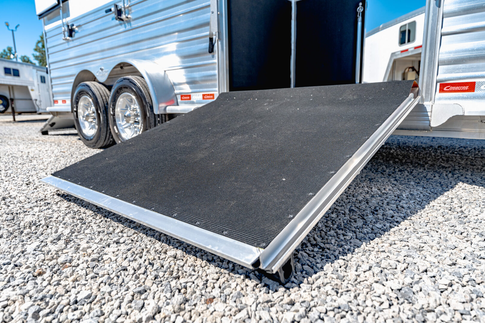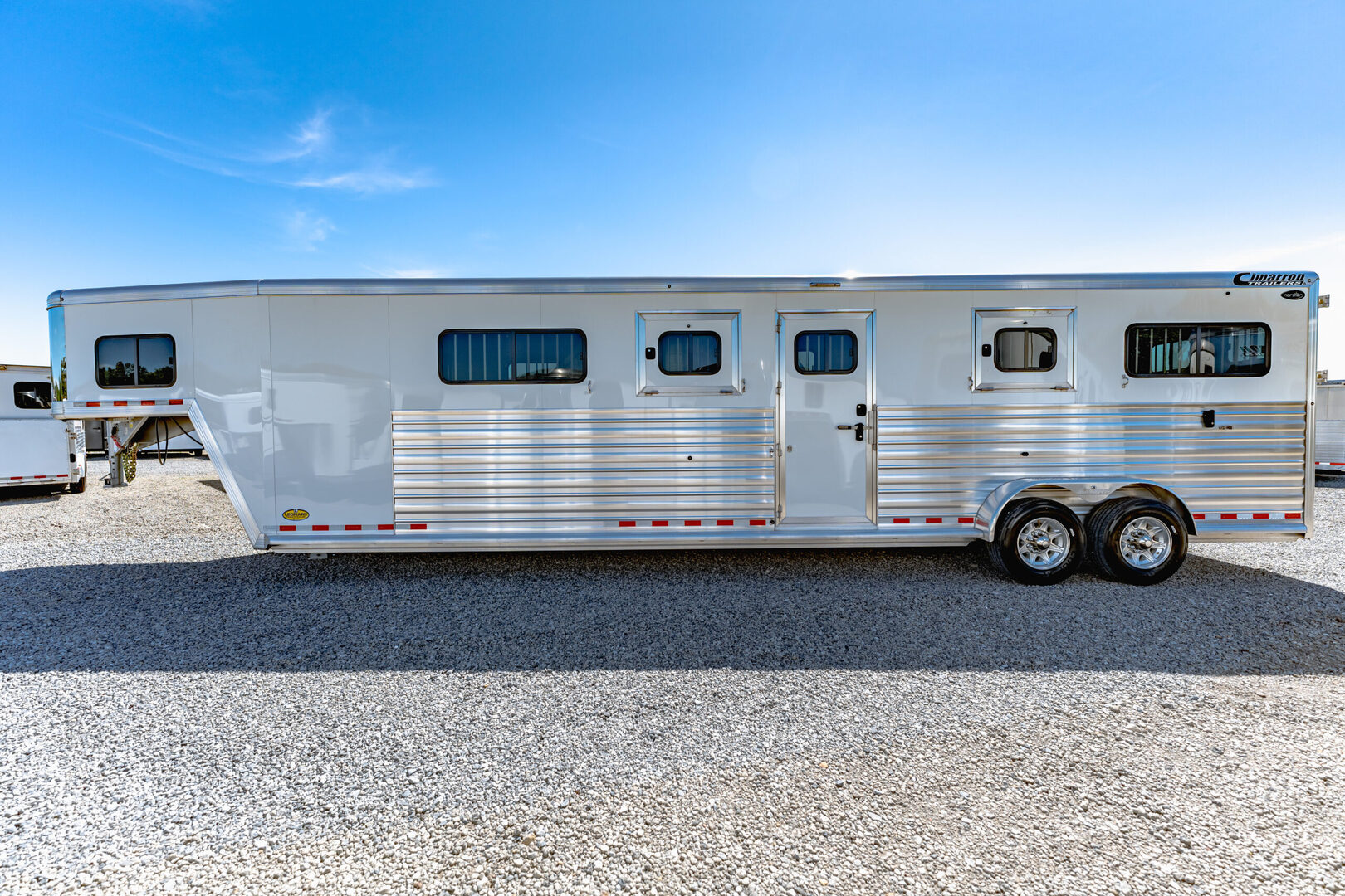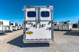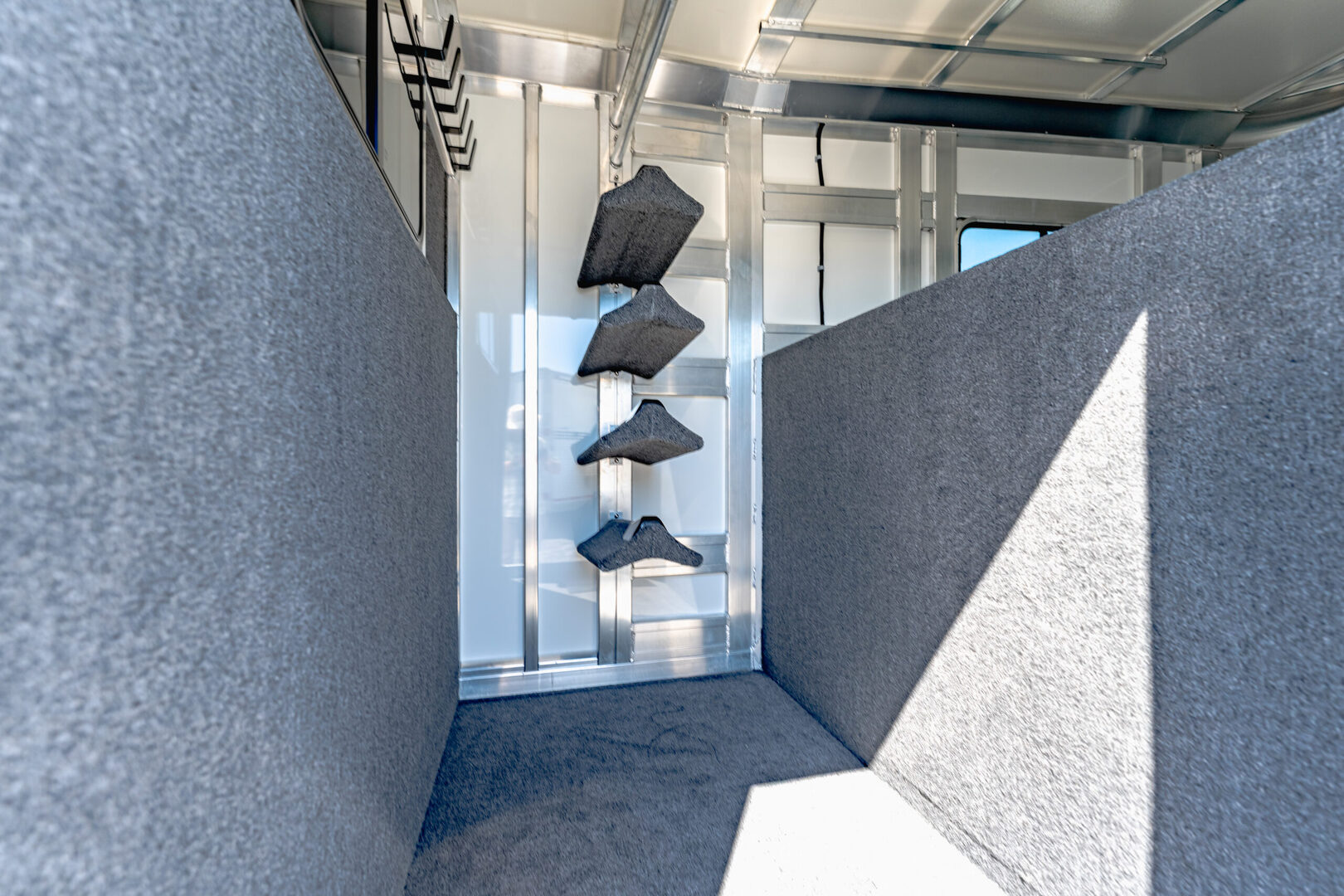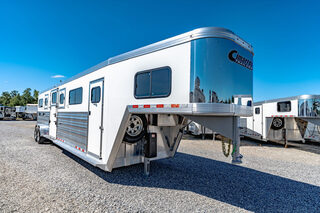 Drive train 7,000# Dexter torsion axles -extruded side slats at stall area, lower body running boards are full length, led awning lights, solid partition wall, full height and width of front tack wall, primary door front tack room door 32’’ wide, carpet floor, GN wall and GN deck, sliding type of windows for front tack, ramp 54’’ tall with swing around doors above in stall area, head side fold down type with safety bars feed doors, full center gate -bars above, ramps side -60’’ wide x54’’ upper door and rest. Strap, 2 partial dividers, swinging solid type for head grills, dome lights, adjustable saddle rack, added recessed paddle latch on side access door, window slider 19x34 in stall area, -in partition wall 54’’ from floor, centered, extra divider location, straight load to move both dividers to LH side wall, use 30’’ bolster pads on butt and breast bars, adjustable fold down bar at side ramp. Call for more details!! **We believe that these specifications to be accurate. Any discrepancies are unintentional. Please verify information with a sales associate prior to purchase.** Stock Number:44271