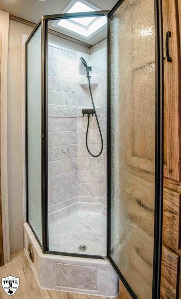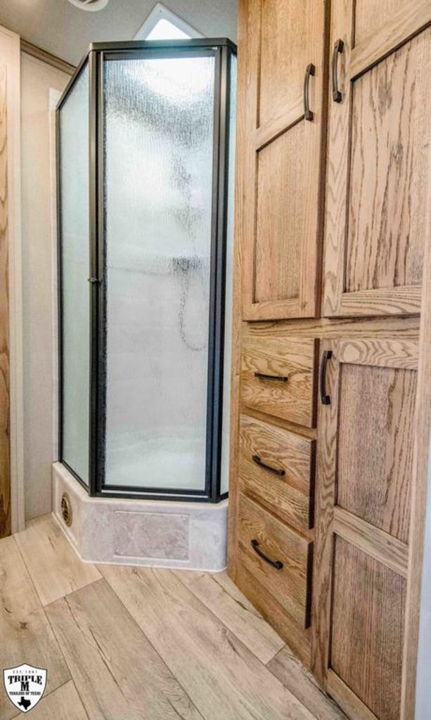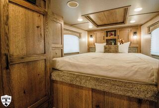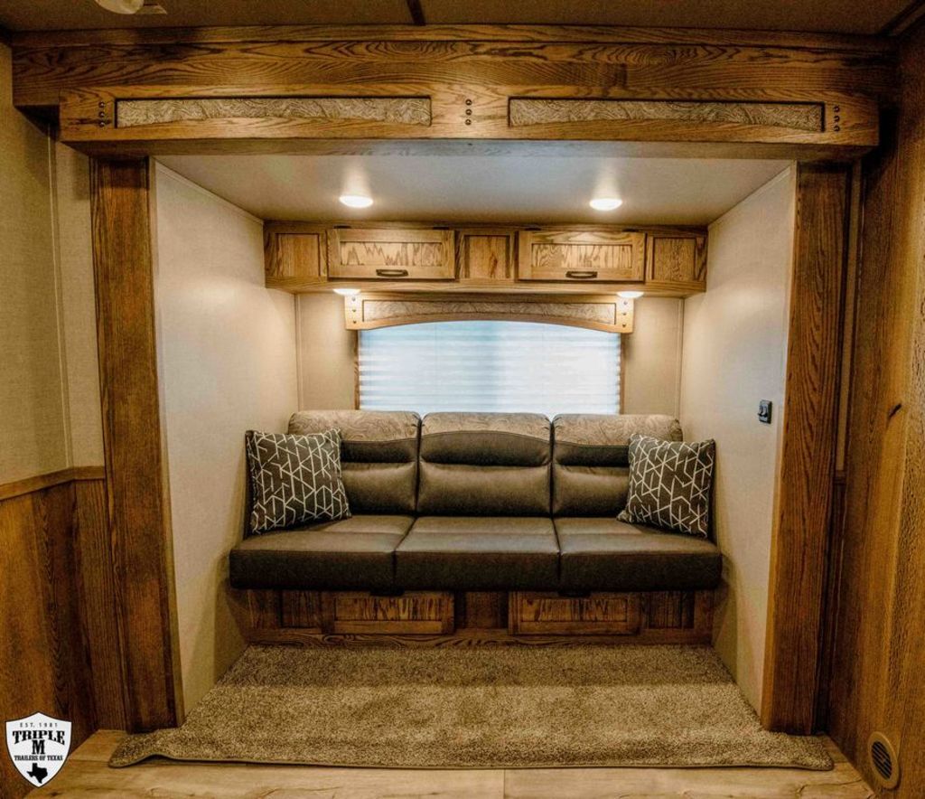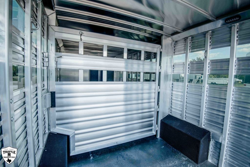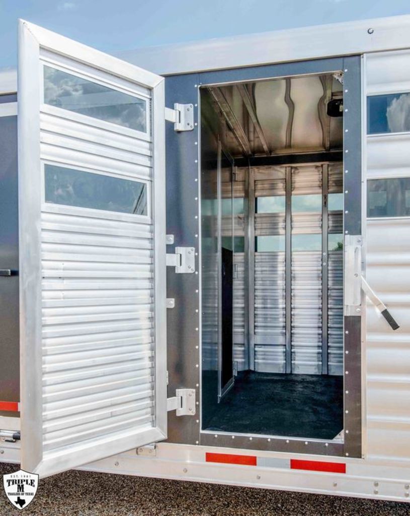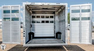CHARGER 12’4 LQ LIVESTOCK EDITION w/ MID TACK 6’ Slide 12’4 LQ Rear Kitchen 15’ Stock Area Side Ramp on Mid Tack Swing Out Saddle Rack Side access door to Stock Area Curb Side Access Door to Mid Tack 50/50 Rear Doors Awning Black Alicante Counters Cracked Oak Linoleum Elegance Seal w/ Valporaiso Stone Pass Thru Door Dual Batteries Skylight in Bath Rain Sensor Fan TV / Stereo / Interior & Exterior Speakers Extra Closet w/ Larger Bathroom Polished Nose Recess Cook top Plexiglass Track & Insert Three Way Light Switch for Mid Tack Extra Clearance Lights Dual 12k Hydraulic Jack GVWR = 16,000 EMPTY = 11,060