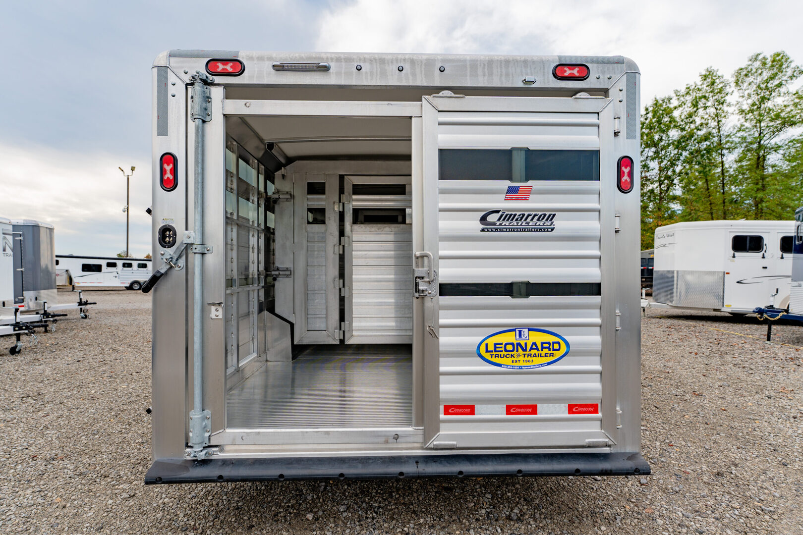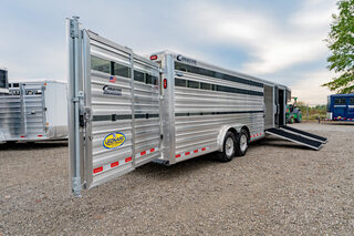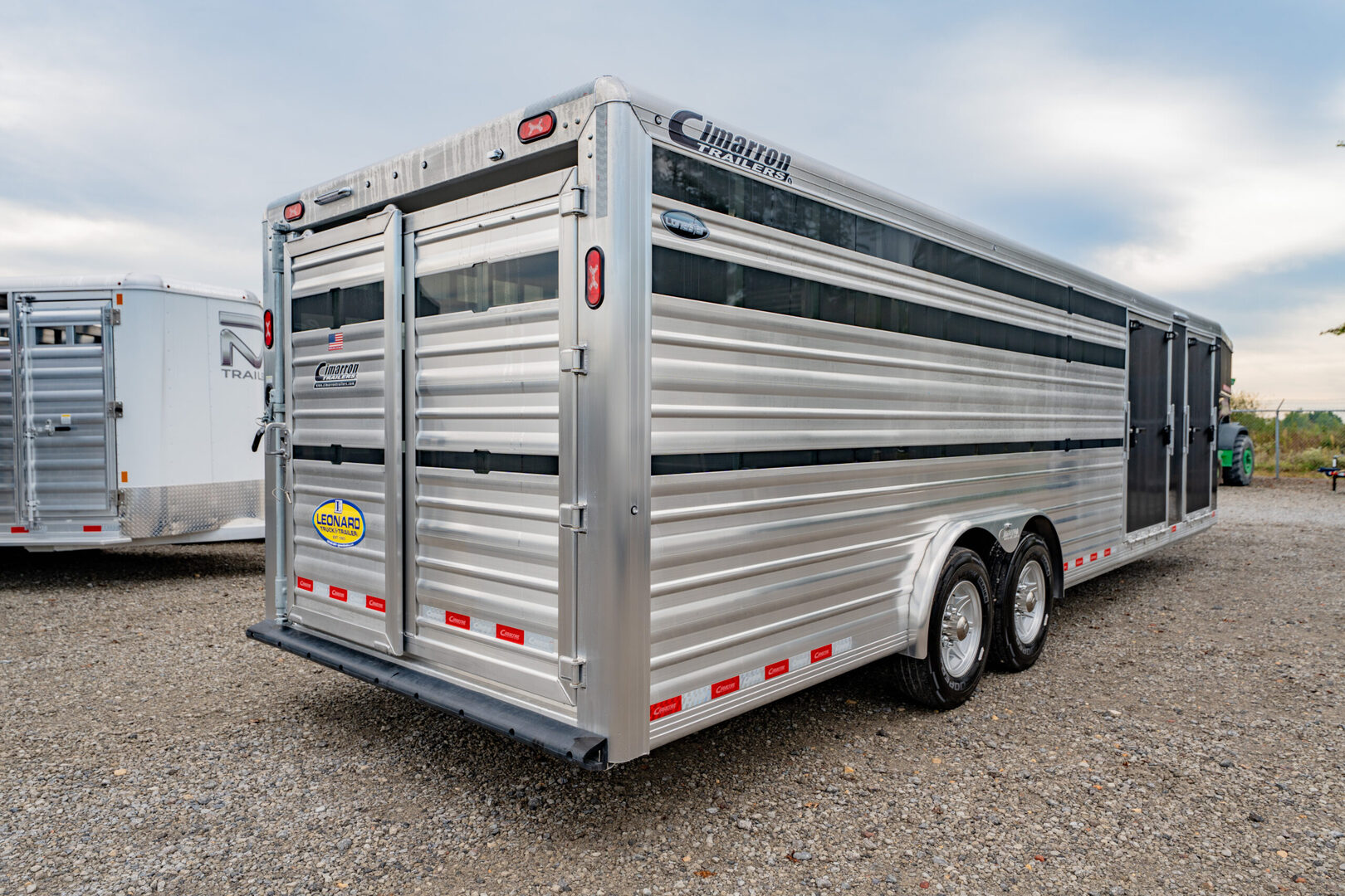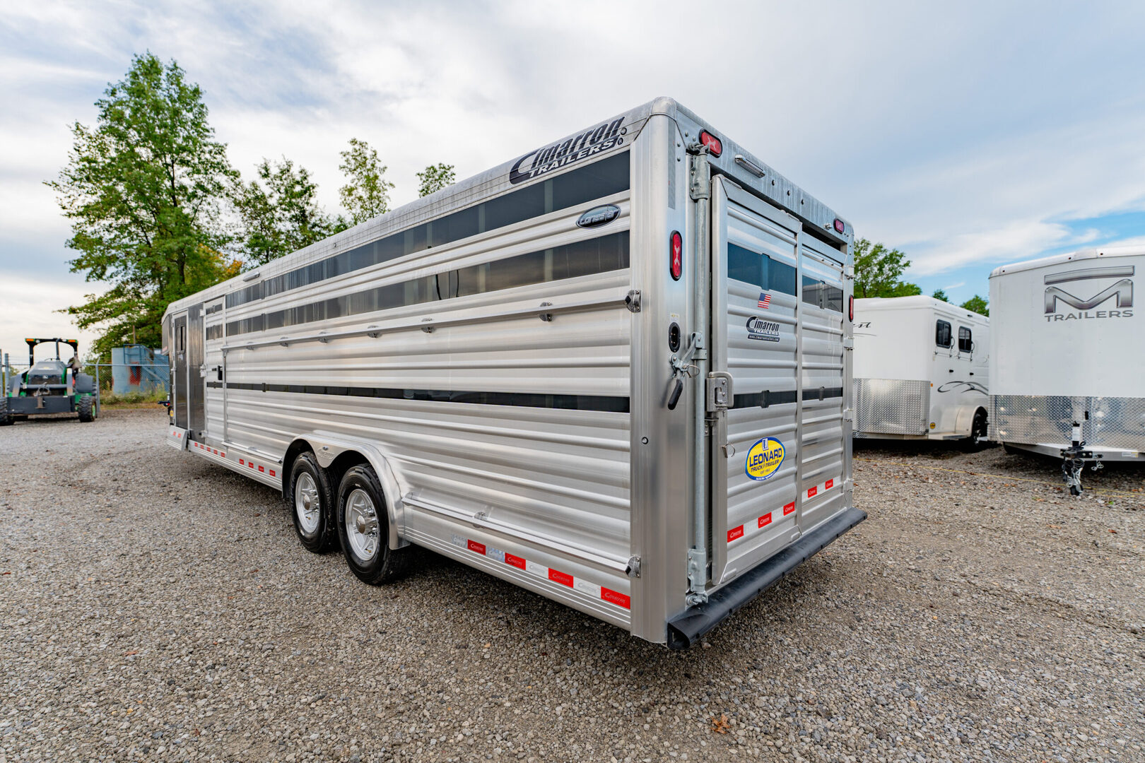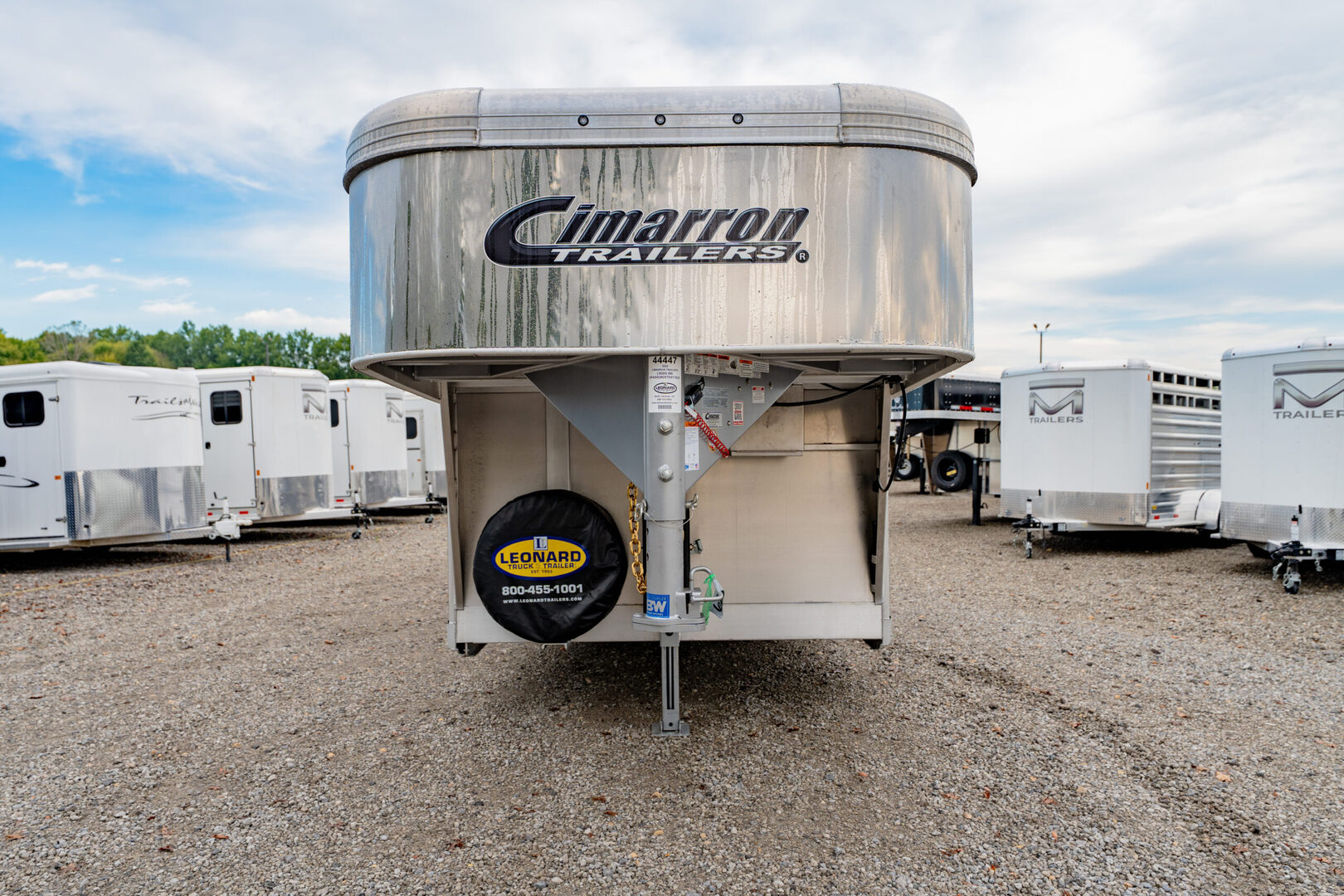 New all aluminum 2026 Cimarron Lonestar. 2026 Cimarron Trailers 24’ combo trailer. -WERM floor -4 aluminum pens and 1 cut gate -side ramp into stock compartment and track room -6’ tack room and 18’ stock area -hydraulic jack -lower fold down air gap with 2 stock sides w/ plexiglass -aluminum wheels This stock combo trailer has extruded aluminum flooring with mats, side slat aluminum walls with plexiglass inserts and a full swing center gate. The dress in this stock trailer is a full wall with bridle hooks, clothes bars, saddle racks and a brush tray. This unit also has a full swinging rear door with a slider. Other features include: 7,000lb Dexter Torflex axles, electric all-wheel brakes, 16” aluminum wheels. Call for more details! *We believe these specifications to be accurate. Any discrepancies are unintentional. Please verify all information with a sales associate prior to purchasing* Stock Number:44447