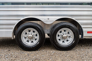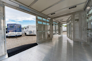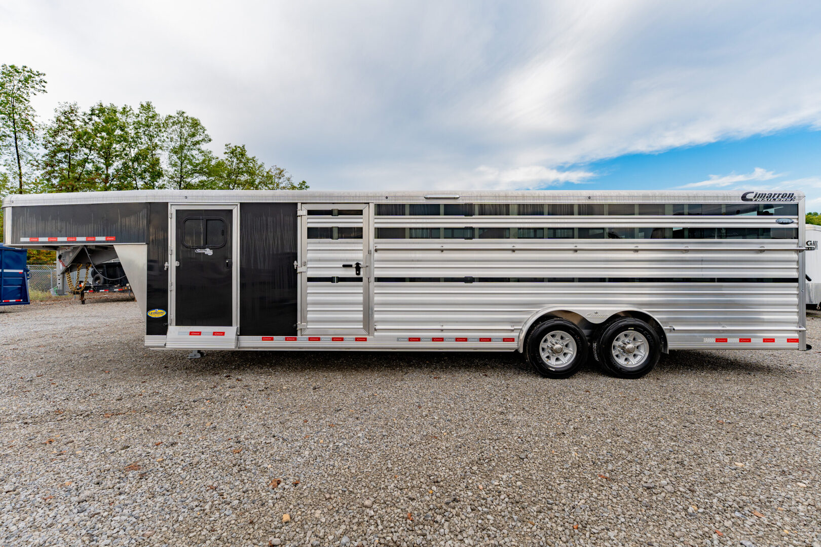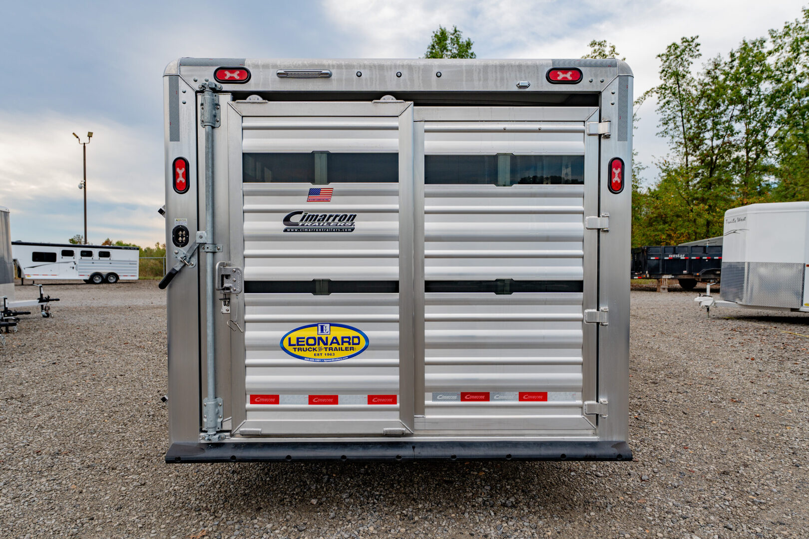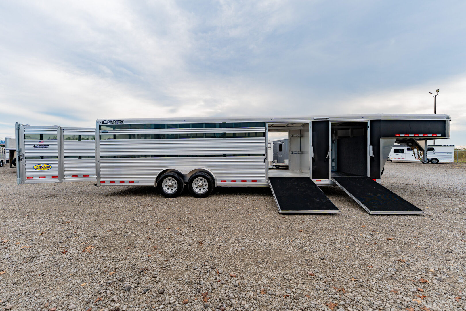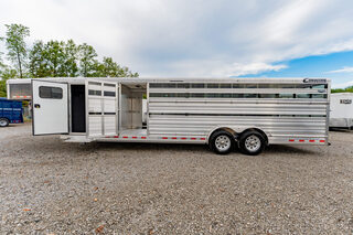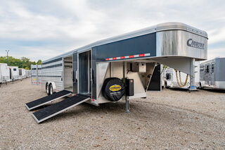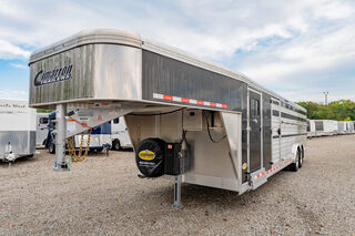 New all aluminum 2026 Cimarron Lonestar. 2026 Cimarron Trailers 24’ combo trailer. -WERM floor -4 aluminum pens and 1 cut gate -side ramp into stock compartment and track room -6’ tack room and 18’ stock area -hydraulic jack -lower fold down air gap with 2 stock sides w/ plexiglass -aluminum wheels This stock combo trailer has extruded aluminum flooring with mats, side slat aluminum walls with plexiglass inserts and a full swing center gate. The dress in this stock trailer is a full wall with bridle hooks, clothes bars, saddle racks and a brush tray. This unit also has a full swinging rear door with a slider. Other features include: 7,000lb Dexter Torflex axles, electric all-wheel brakes, 16” aluminum wheels. Call for more details! *We believe these specifications to be accurate. Any discrepancies are unintentional. Please verify all information with a sales associate prior to purchasing* Stock Number:44447