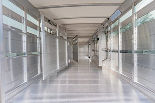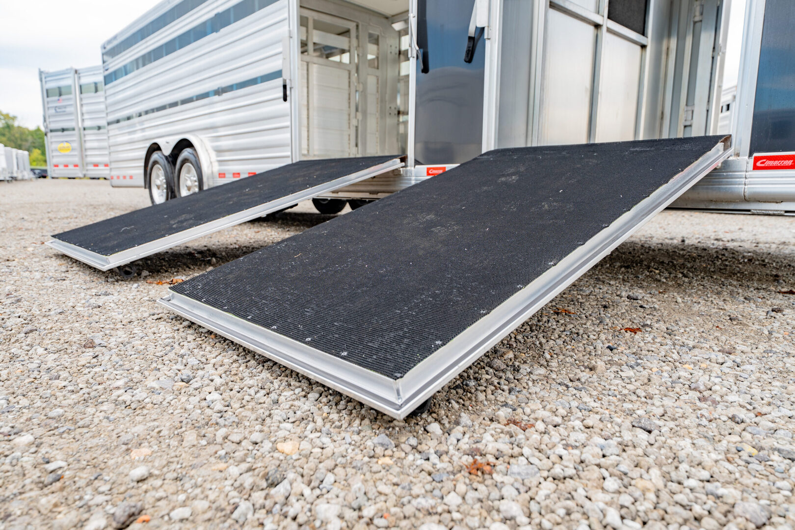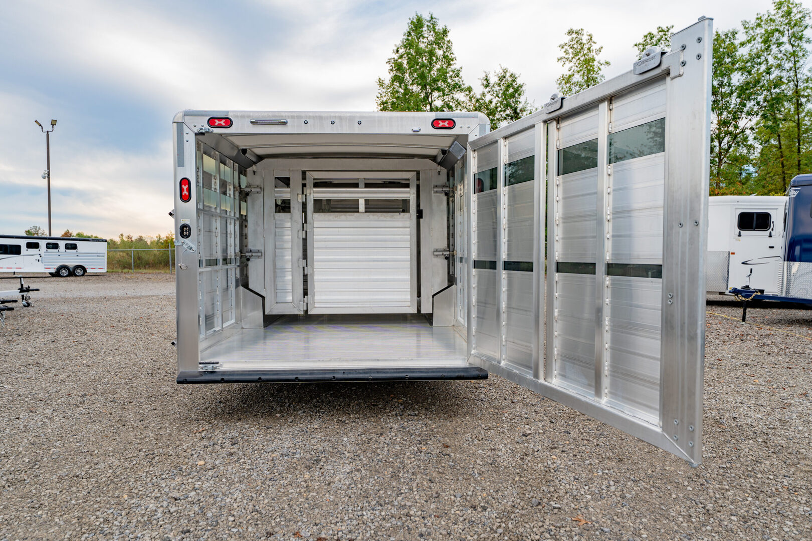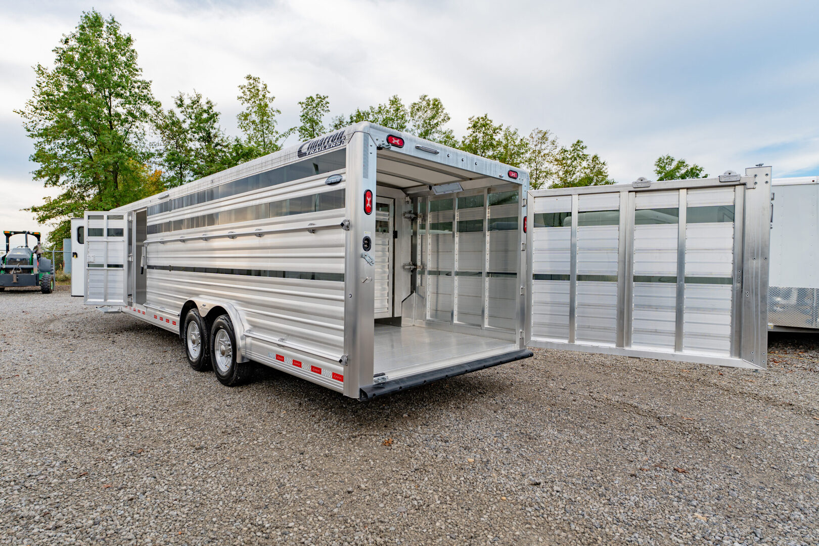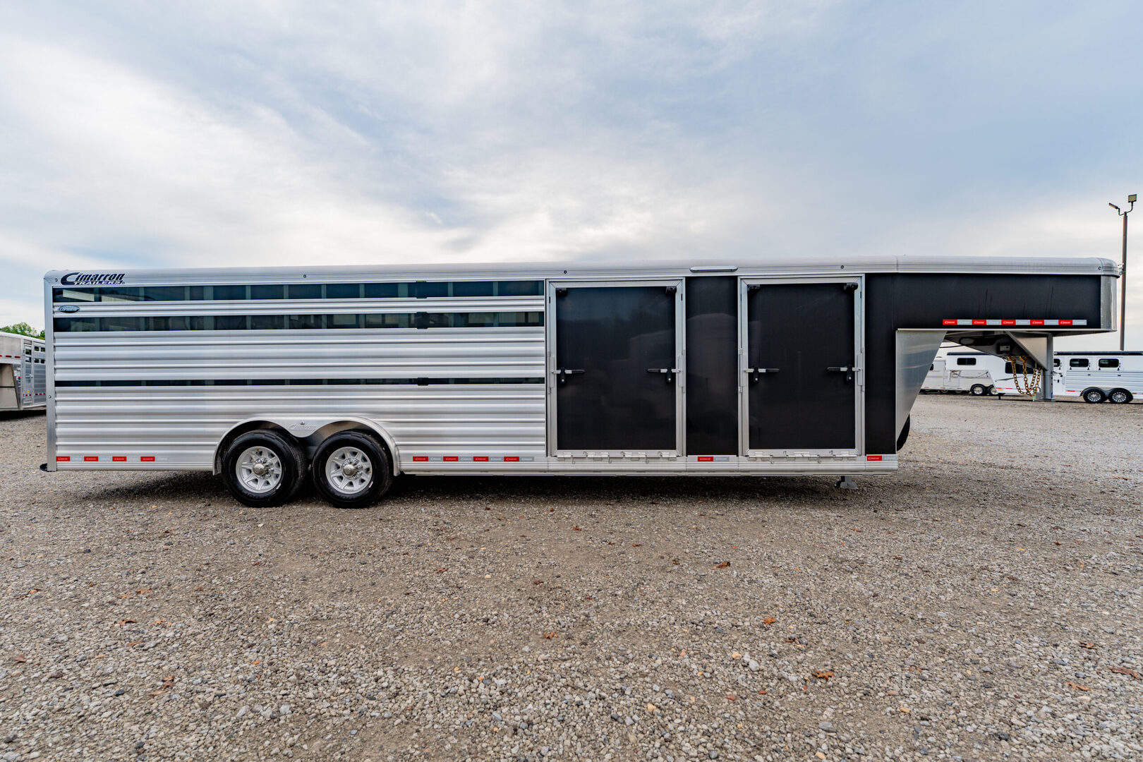 New all aluminum 2026 Cimarron Lonestar. 2026 Cimarron Trailers 24’ combo trailer. -WERM floor -4 aluminum pens and 1 cut gate -side ramp into stock compartment and track room -6’ tack room and 18’ stock area -hydraulic jack -lower fold down air gap with 2 stock sides w/ plexiglass -aluminum wheels This stock combo trailer has extruded aluminum flooring with mats, side slat aluminum walls with plexiglass inserts and a full swing center gate. The dress in this stock trailer is a full wall with bridle hooks, clothes bars, saddle racks and a brush tray. This unit also has a full swinging rear door with a slider. Other features include: 7,000lb Dexter Torflex axles, electric all-wheel brakes, 16” aluminum wheels. Call for more details! *We believe these specifications to be accurate. Any discrepancies are unintentional. Please verify all information with a sales associate prior to purchasing* Stock Number:44447