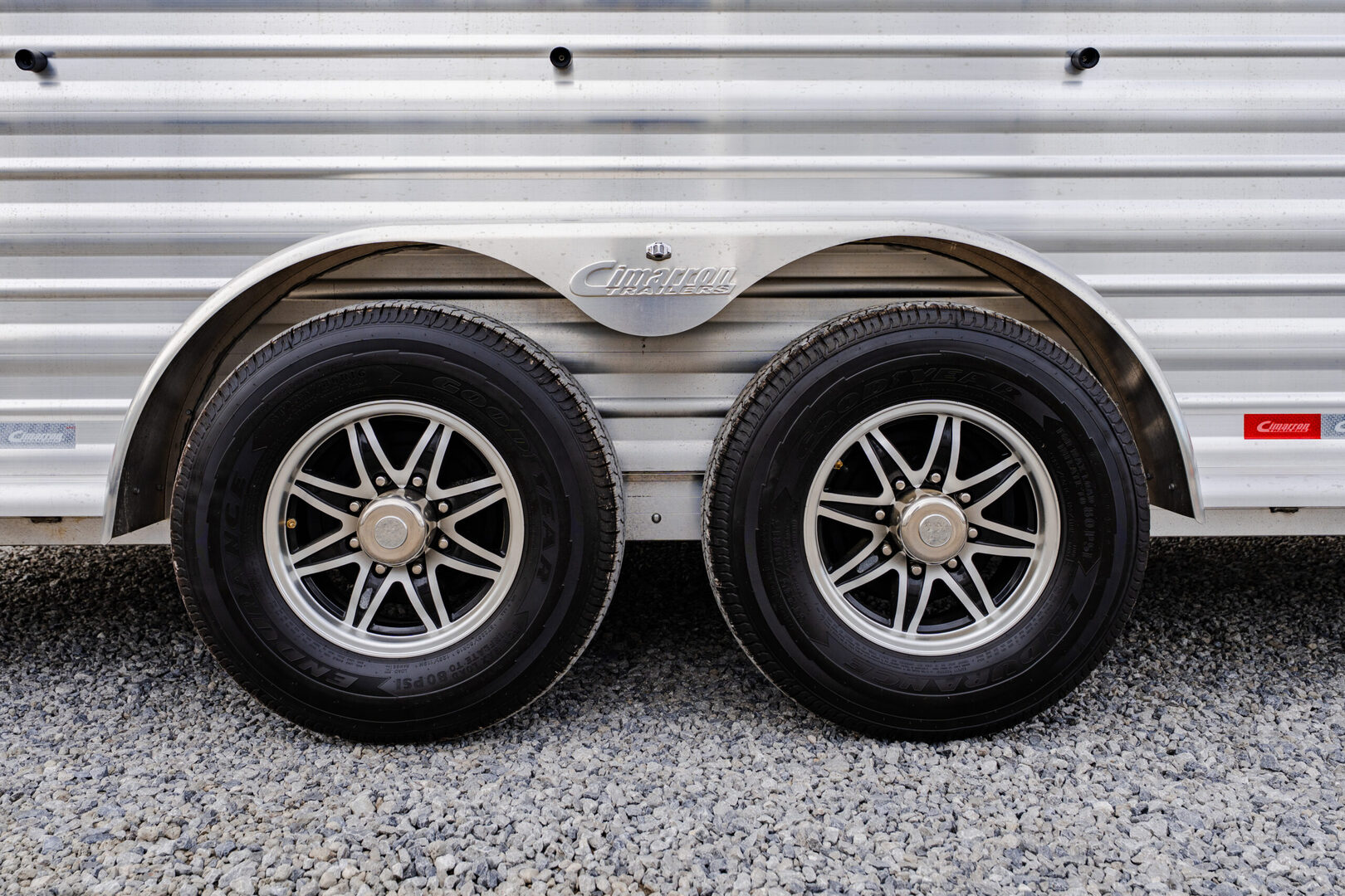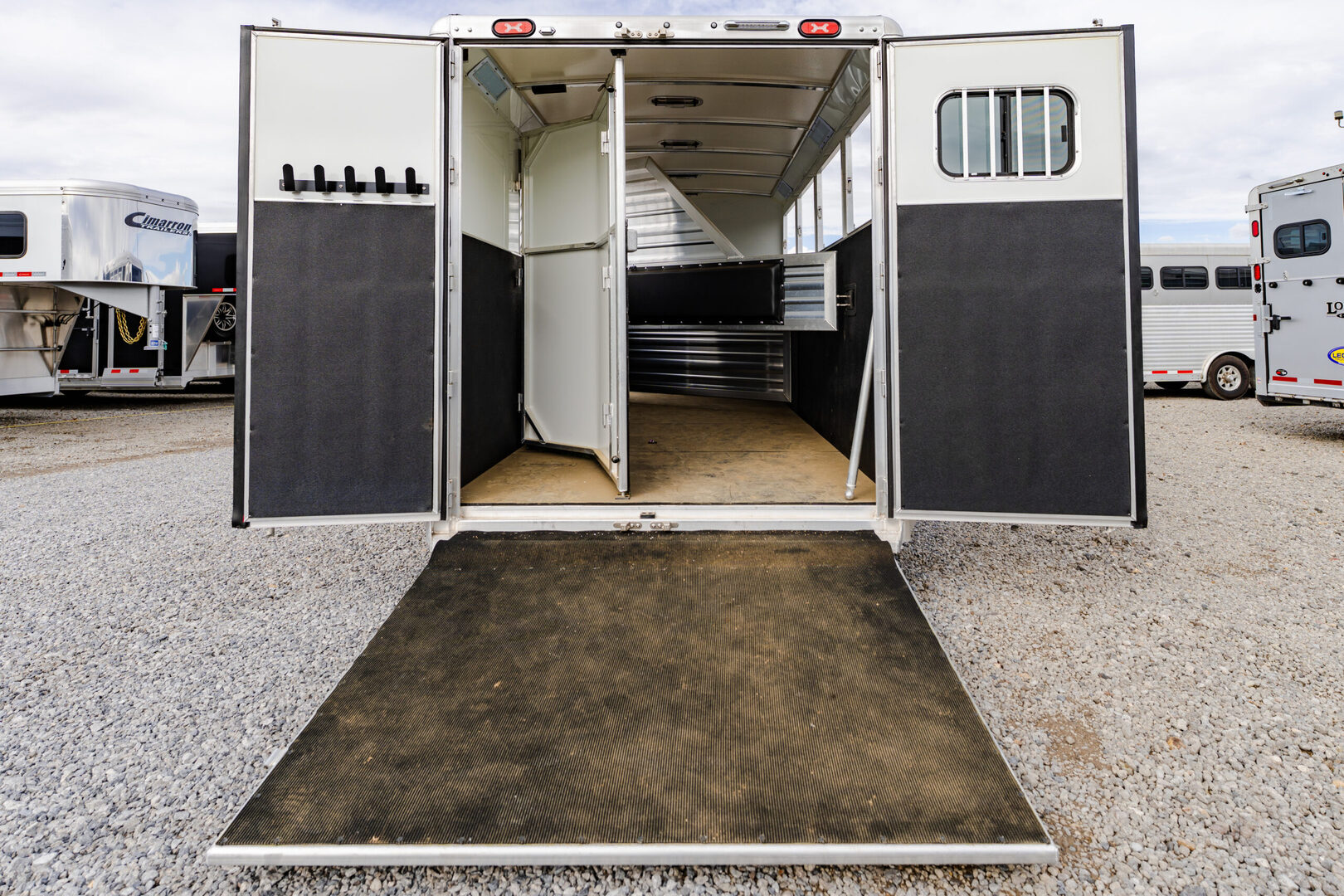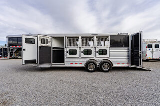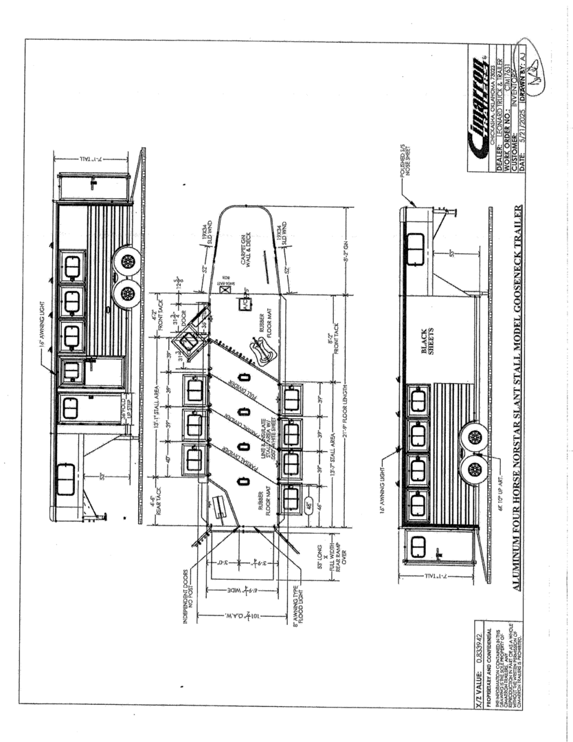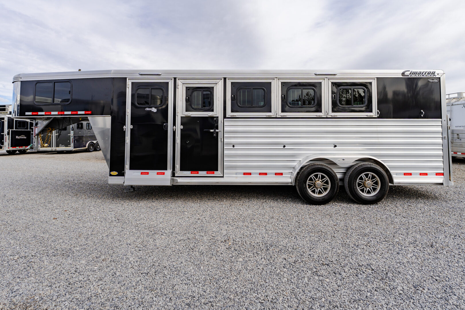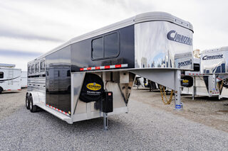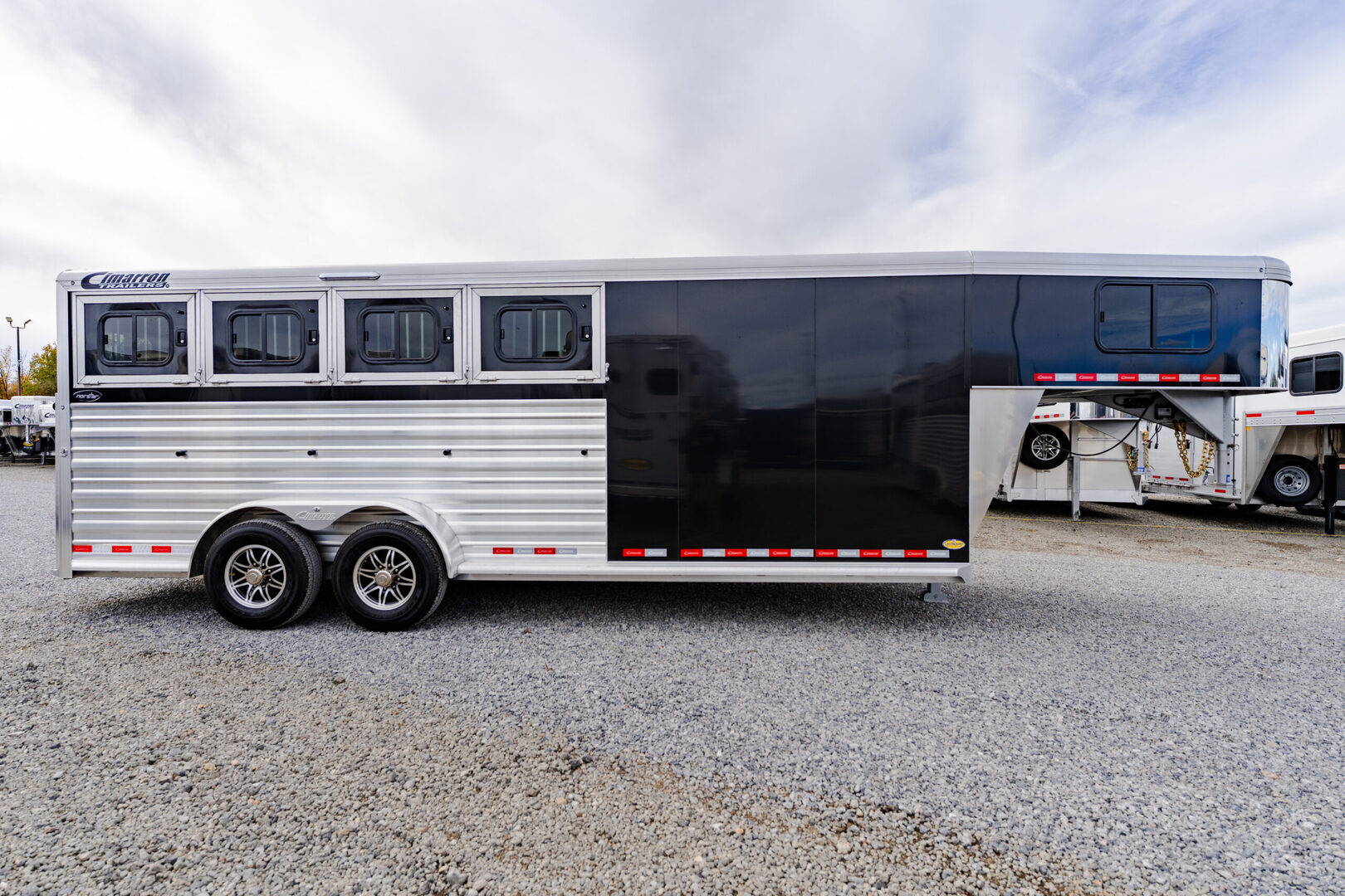 View Inventory: https://leonardtrailers.com/inventory/44480 Stock# 44480 New 2026 Cimarron NS4G Gooseneck Horse Trailer Cimarron Norstar aluminum horse trailers are engineered to be durable and safe. Bumper pull or gooseneck configurations ensure effortless towing and comfort. Model: NS4G Warranty: 8yr- Structural 3yr-Body and Hardware Overall Dimensions Box Length: 21’ 9” Box Width: 6’ 10” Box Height: 7’ 1” Gooseneck (GN) Length: 8’ 2” GN Drop Wall: 53” (for extreme 4x4 clearance) GN Structure: Standard Duty Undercarriage GVWR: 12,000 lbs Axles: 6,000 lb Dexter Torflex Axles, 8-Bolt Hubs with 1/2” Studs Axle Articulation: 10° up Brakes: Electric (All Wheel) Tires: Goodyear ST 235/80 R16” LR-E Wheels: 8-Hole Aluminum, Black Spoke 16” Design Nose Profile: Tapered sides with 18” corners Nose Sheet: Polished stainless steel Side Walls: Extruded side slat @ stall area (black, mill finished extrusions) Sheet Color: Black Fenders: Teardrop, overall width 102” O.A.W. Roof: Insulated roof panel Tack Rooms Front Tack: Solid partition wall, full height & width, slant wall Rear Tack: Folding rear tack wall (60/40 arrangement) Mid Tack: 4’ 6” length, 3’ width Closet Tack: 4’ 2” LH length, 8’ 2” RH length, 6’ 10” width Floor: Rubber mat floor, carpet GN wall & deck Battery: Single battery box aluminum under GN with electric jack Stall Equipment Restraints: 1 chest bar, 1 butt bar Padding: 6 pads (chest & sides) Dome Lights: Optibrite LED (Qty: 4) Bridle Hooks: 6 (set) Brush Trays: Qty: 2 Clothes Bars: Qty: 1 Pop-Up Vents: Qty: 4 Saddle Racks: 4 adjustable pads, removable posts (Qty: 2 posts) Blanket Poles: 2 (adjustable on saddle rack post) Special Requirements Add recessed paddle latch on side access door Rear stall is 1’ longer than standard, allowing divider to lay flat   We offer outstanding financing options, accept trades, and can arrange nationwide NO HASSLE delivery! Inquire today for more information! (888) 333-6613 **We believe these specifications to be accurate. Any discrepancies are unintentional. Please verify information with a sales associate prior to purchase.** Stock Number:44480