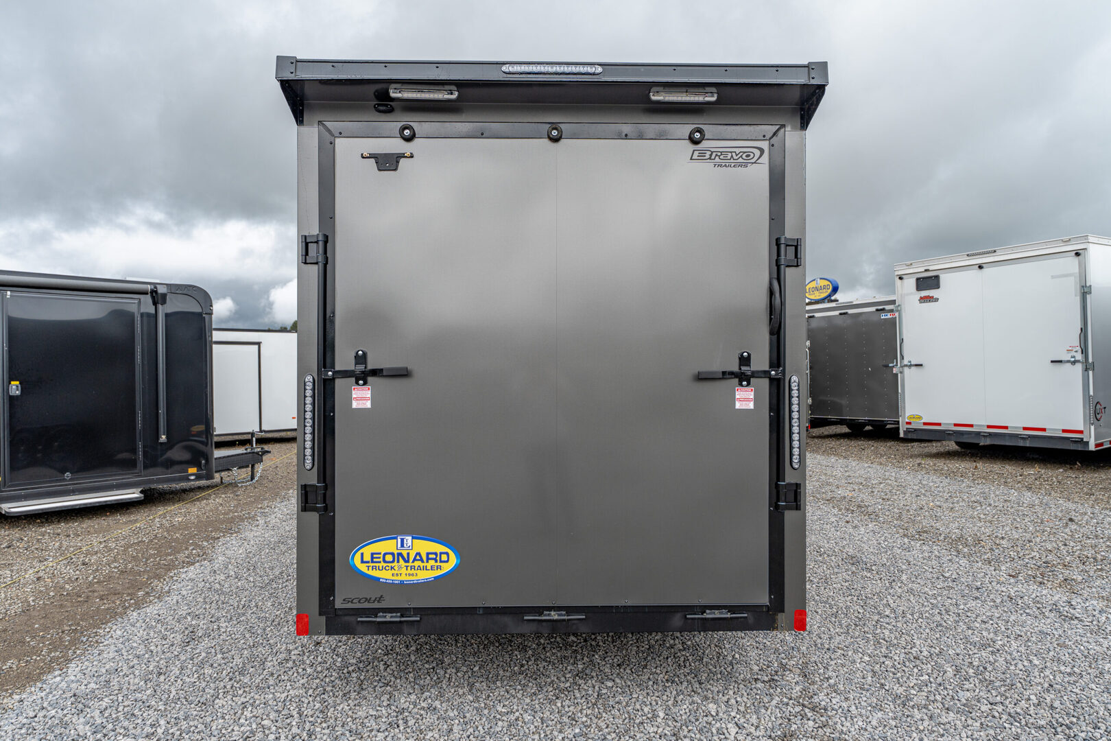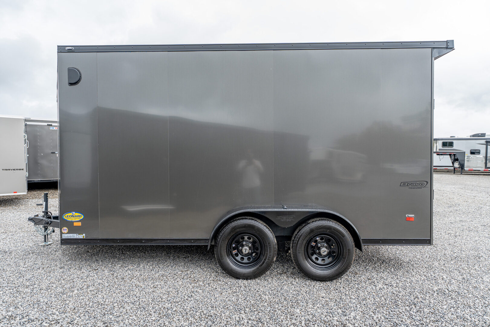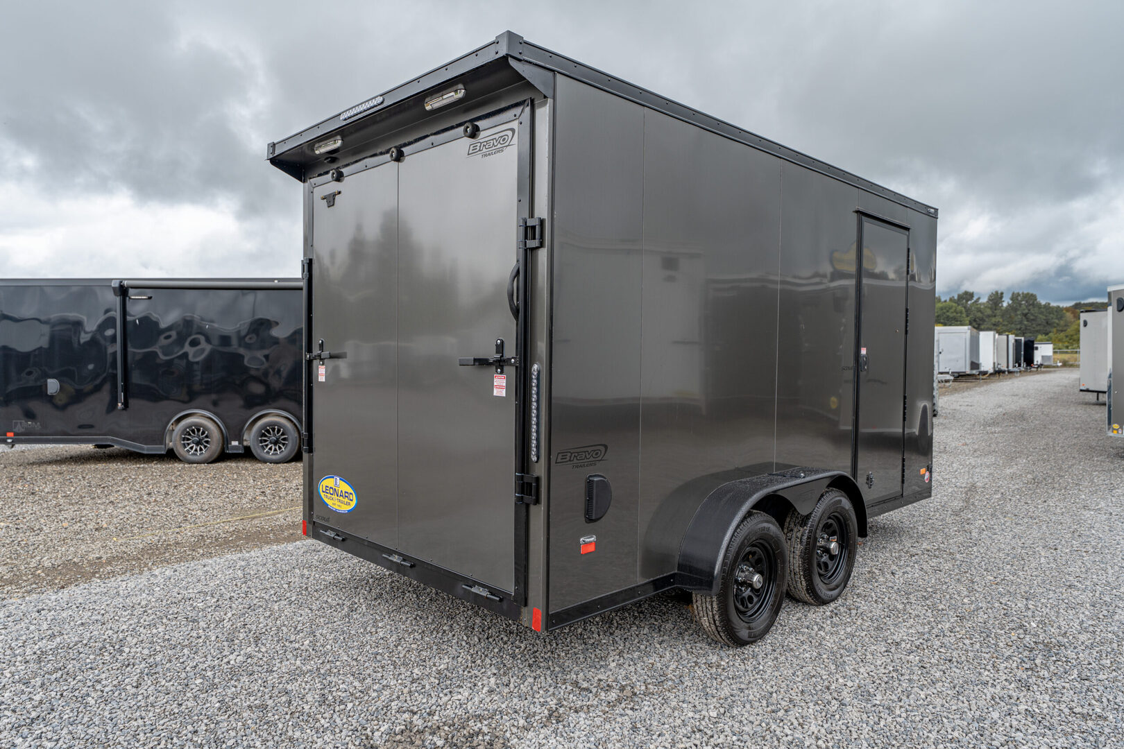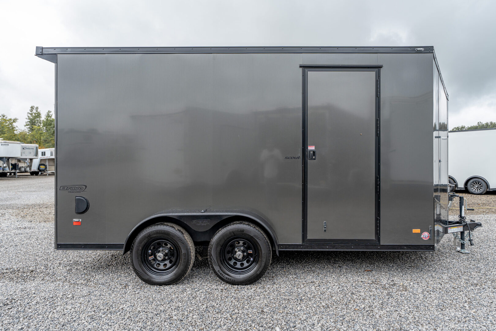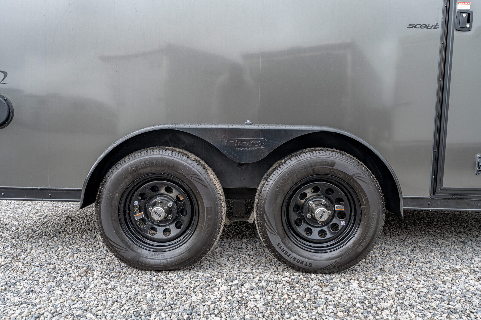 Stock# 44485 New 2025 Bravo SC714TA2  Enclosed  Trailer The Scout trailer may be Bravo’s entry-level trailer model, but it’s no “throw away” trailer. All Scout trailers are work ready and feature the Bravo “BIG 10 plus 5” commercial construction features. Scout is a great value in enclosed cargo trailer with sizes ranging from 5×8 to 8.5x24TA3 with a long list of options. If you’re in the market for an economical cargo trailer, yet built to stand up to years of use, Scout is for you! Model: SC714TA2  Warranty: 3yr- Limted Scout Enclosed Trailer – Model SC714TA2 Chassis & Frame 3500# tandem drop spring axles Electric brakes 4” tube frame Cross members @ 16” O.C. Tube wall posts @ 16” O.C. Tube roof members @ 16” O.C. 2-5/16” coupler – 14K Painted tongue jack w/ sand foot No wheel wells Wheels & Tires ST205/75R15/LRC 15” radial tires Black mod wheels Spare tire not listed Exterior Aluminum roof Bonded .030 exterior sidewalls Charcoal metallic .030 exterior metal 30” slant wedge V nose (7W) w/ 24” tapered stoneguard (ILO 30” V) 6” extra height (LTF) to unit & doors Approx. interior height: 84” Side door height: 76”T Scout wing 8” roof extension – 90° degree  Interior 3/8” engineered sidewalls 3/4” engineered flooring Medium duty ramp door w/ flap 32” side door w/ flushlock & cast alum holdback (C/S @ 2’ back)  Ventilation (1) Pair ABS flow-thru sidewall vents Front R/S high Rear C/S low Tie-Downs (4) 5000# recessed floor D-rings (1 in each corner, 10” away from sidewalls)   We offer outstanding financing options, accept trades, and can arrange nationwide NO HASSLE delivery! Inquire today for more information! (888) 333-6613 **We believe these specifications to be accurate. Any discrepancies are unintentional. Please verify information with a sales associate prior to purchase.** Stock Number:44485
