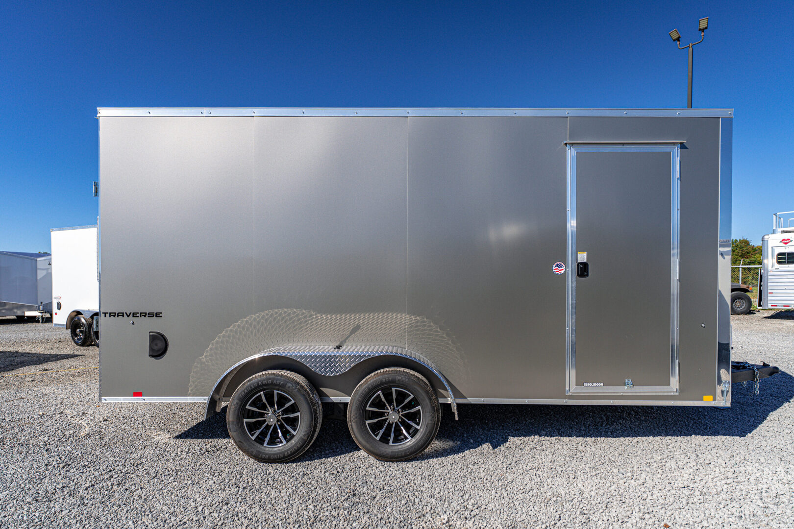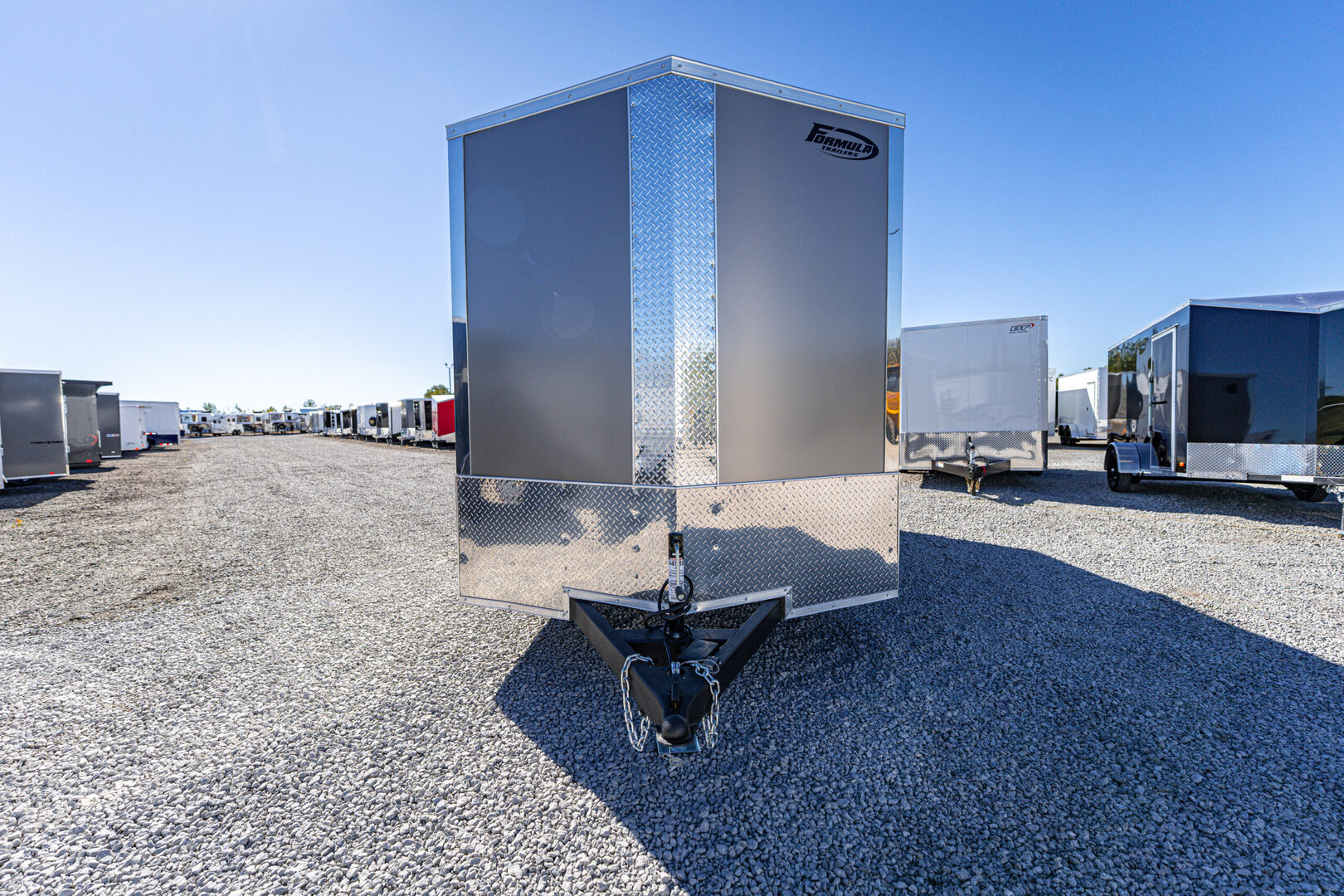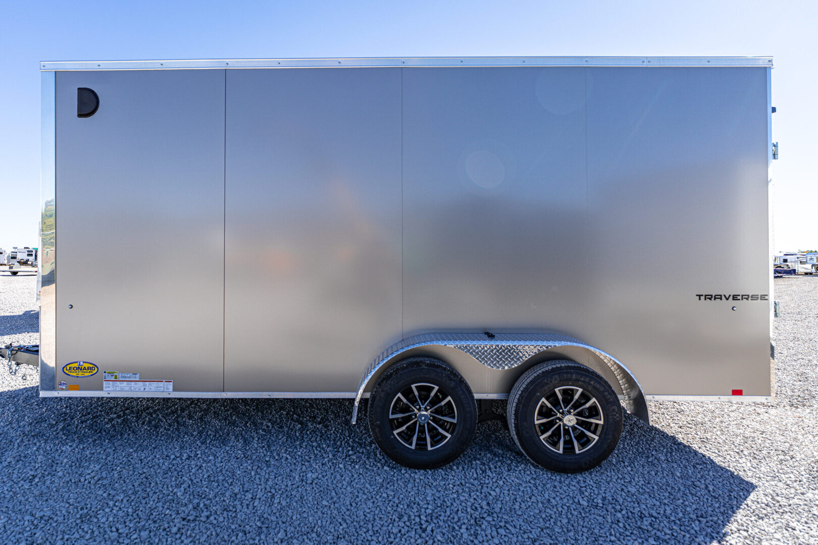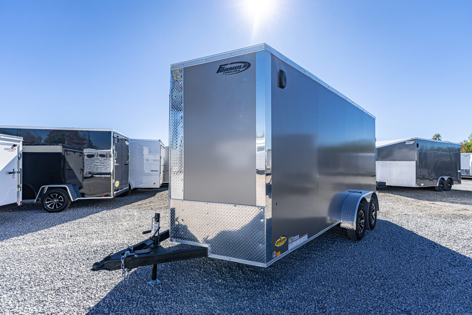 View Inventory: https://leonardtrailers.com/inventory/44588 Stock# 44588 New 2026 Formula F8416TVSV-070 POLY Enclosed Trailer   The Traverse Cargo Trailer is engineered to exceed expectations with a perfect blend of strength, reliability, and modern design. Built for both everyday hauls and demanding commercial use, this enclosed cargo trailer offers unmatched durability, weather resistance, and sleek aesthetics—making it a dependable partner for any job. Designed with advanced construction techniques and high-quality materials, the Traverse ensures your cargo stays protected while delivering long-lasting performance season after season.   Model: F8416TVSV-070 POLY Warranty: 3yr-Limited Standard Features Per Trailer Frame: 4” × 2” steel tube Crossmembers: Formed steel, 24” on-center Tongue: 4” × 2” steel tube Coupler: 2-5/16” A-frame Safety Chains: DOT compliant Tongue Jack: 2K coupler mounted Wall Studs: Steel tube, 24” on-center Roof Bows: Steel tube, 24” on-center Front Profile: V-nose Ramp(s): 2500 lbs with assist Side Door: 32” wide, flush lock, wire holdback Vents & Fenders Sidewall airflow vents Aluminum treadplate fenders Axle & Running Gear (2) 3500 lb drop spring brake axles Easy lube hubs Breakaway: battery, switch, lanyard Tires: ST205/75R15C 6-PR Wheels: 15”, 5-hole steel Exterior Finish: .030” aluminum Undercoating: Automotive Protective coatings: Textured polyurea on all exposed steel Fastening: Color-matching screws on seams Fastening: VHB bonded field (semi-screwless) Trim: 1.5” bottom extrusion, 2.7” top extrusion Stone guard: 24” ATP Roof: Flat top seamless aluminum Interior Walls: Engineered wood Ceiling: Lauan strip Flooring: 3/4” engineered wood Lights: (1) LED dome light (12V) Switches: (1) dome light, 12V Connector Plug: Round 7-pin blade Exterior Lights: Full LED, DOT compliant Selected Options Per Trailer Setback jack upgrade – 2K Upgrade to black aluminum wheel assembly, ST205/75R15, 5-lug Additional 6” extra height (84” interior height) Color option: Composite Silver (7–8.5 wide) Enclosed promotional package (aluminum wheels) Enclosed promotional package (extra height) We offer outstanding financing options, accept trades, and can arrange nationwide NO HASSLE delivery! Inquire today for more information! (888) 333-6613 **We believe these specifications to be accurate. Any discrepancies are unintentional. Please verify information with a sales associate prior to purchase.** Stock Number:44588