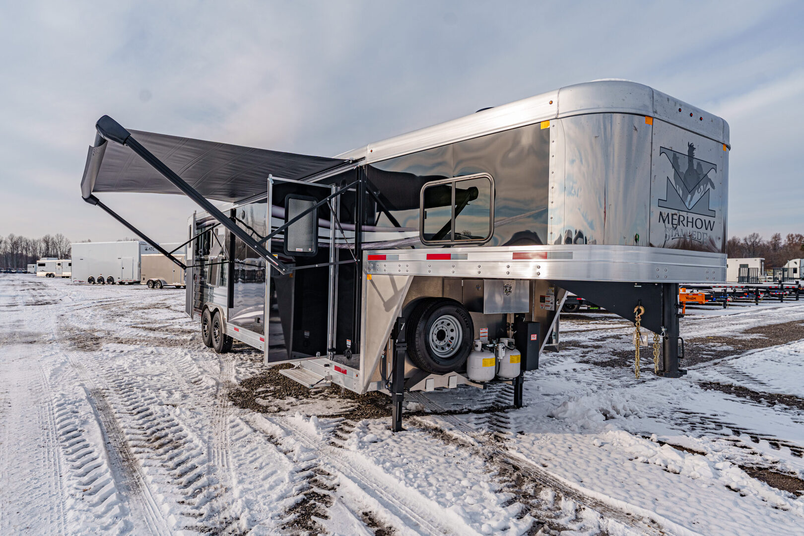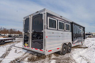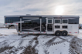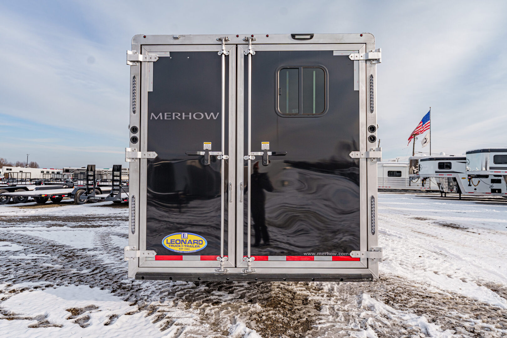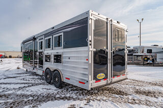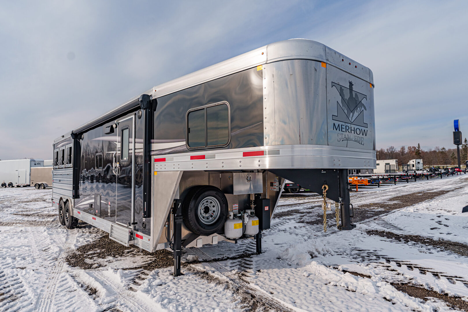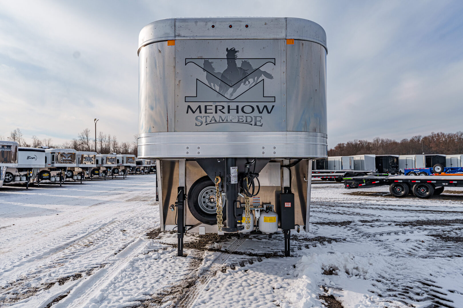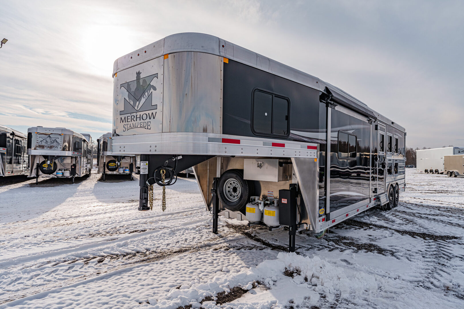View Inventory: https://leonardtrailers.com/inventory/44592 Stock# 44592 New 2026 Merhow 8312-ARKS STAMPEDE Gooseneck Horse Trailer with Living Quarters The Stampede by Merhow is LOADED with standard features! The trailer offers the same Super-Structure as our Next Generation, the same 2/8 MFG warranty with an economically-built interior that offers premium vinyl with hardwood fascia and cabinet doors that will WOW you at first glance! Warranty: 2yr Living Quarter, 8yr Structural  Key Specifications Estimated Trailer Body Width: 8’ Estimated Overall Length: 35.167’ Exterior Skin Color: Black Exterior & Structural Features 40” stall setting, extruded aluminum floor, one-piece aluminum roof Drop-down feed windows on all head and escape doors Escape door (3 horse and larger models) with paddle latch & butterfly latch Rubber mats in horse area and rear tack 4-tier aluminum blanket bar in rear tack Rear collapsible tack with tie-back Interior Living Quarters Features Solid wood cabinet faces & flat panel cabinet doors Crown molding in main LQ, kitchen, and front bunk Laminate countertops with wood edges Soft-touch walls and ceiling, decorative panel ceiling Linoleum flooring in main LQ and bathroom, carpeted front bunk Kitchen backsplash laminate, overhead cabinets above seating White shower pan with opaque door, foot flush RV toilet Sky-dome above shower, stainless steel sinks High-velocity vent fan in bathroom AM/FM/CD/DVD radio with inside & outside speakers TV prep with antenna, 32” smart TV (size varies by model) Powered awning with LED light strip RV queen mattress in front bunk Fresh water tank: 38 gal, Gray water: 35 gal, Black water: 35 gal Selected Options & Upgrades Stainless steel nose wrap 16”, 8-lug gunmetal aluminum wheels with Westlake range E tires (ST235/80R16) Medium exterior graphics package Upgrade from single to dual leg hydraulic jack Install add-a-rail structural reinforcement Porcelain toilet upgrade Convection microwave upgrade Two-tone seating upgrade Electric fireplace Upgrade to 10-gallon DSI water heater Black tank rinse assist We offer outstanding financing options, accept trades, and can arrange nationwide NO HASSLE delivery! Inquire today for more information! (888) 333-6613 **We believe these specifications to be accurate. Any discrepancies are unintentional. Please verify information with a sales associate prior to purchase.** Stock Number:44592