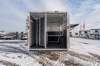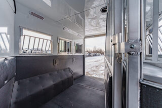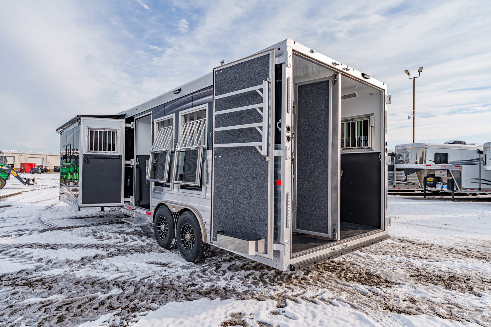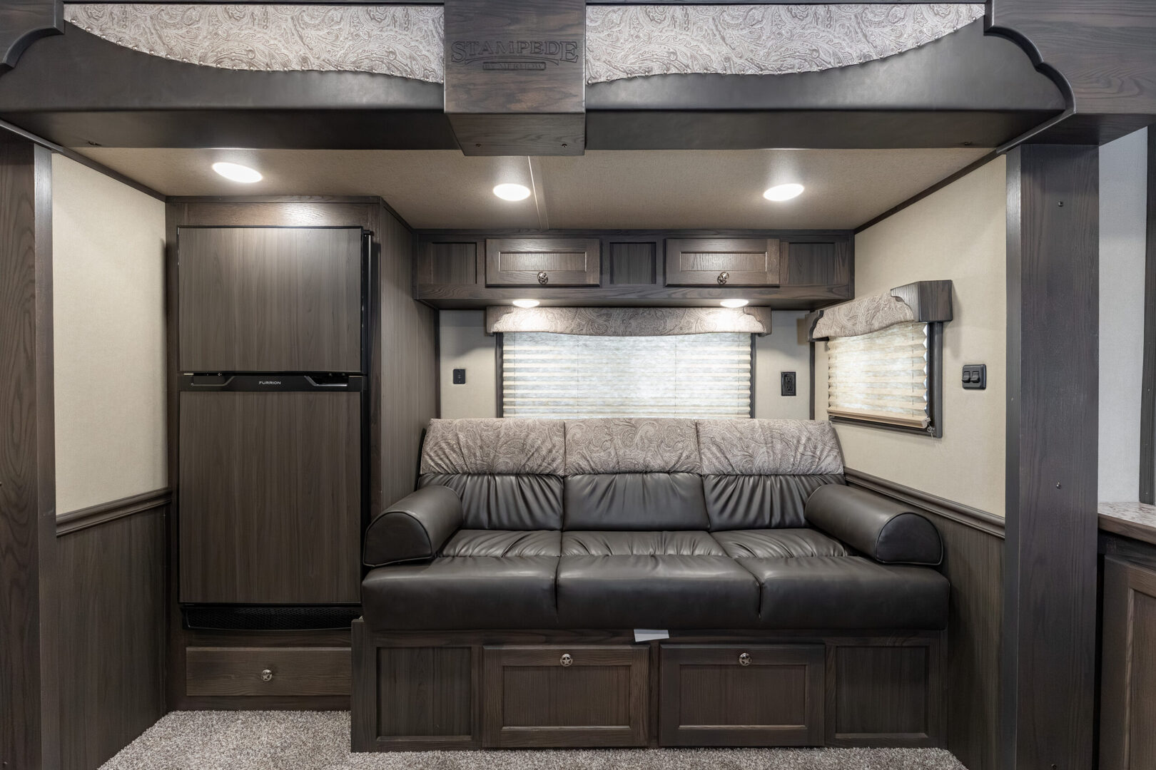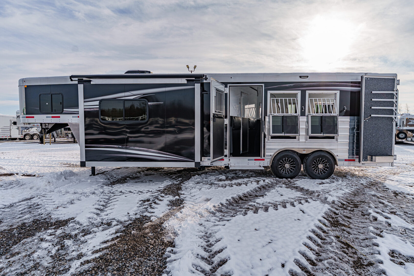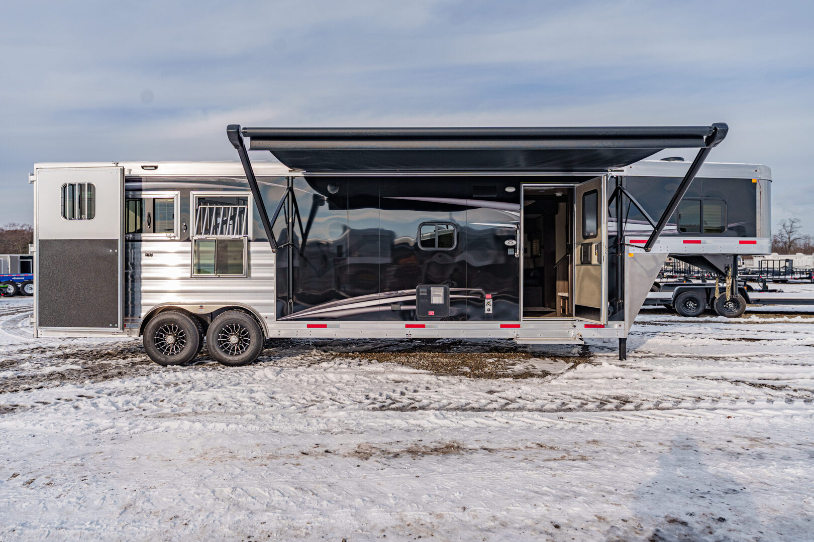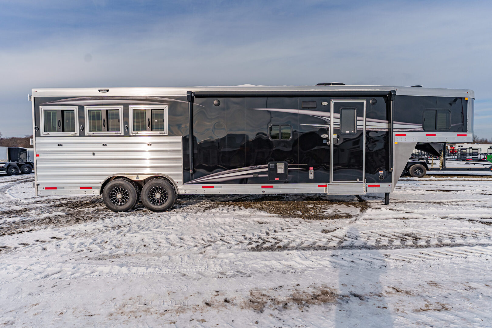 View Inventory: https://leonardtrailers.com/inventory/44592 Stock# 44592 New 2026 Merhow 8312-ARKS STAMPEDE Gooseneck Horse Trailer with Living Quarters The Stampede by Merhow is LOADED with standard features! The trailer offers the same Super-Structure as our Next Generation, the same 2/8 MFG warranty with an economically-built interior that offers premium vinyl with hardwood fascia and cabinet doors that will WOW you at first glance! Warranty: 2yr Living Quarter, 8yr Structural  Key Specifications Estimated Trailer Body Width: 8’ Estimated Overall Length: 35.167’ Exterior Skin Color: Black Exterior & Structural Features 40” stall setting, extruded aluminum floor, one-piece aluminum roof Drop-down feed windows on all head and escape doors Escape door (3 horse and larger models) with paddle latch & butterfly latch Rubber mats in horse area and rear tack 4-tier aluminum blanket bar in rear tack Rear collapsible tack with tie-back Interior Living Quarters Features Solid wood cabinet faces & flat panel cabinet doors Crown molding in main LQ, kitchen, and front bunk Laminate countertops with wood edges Soft-touch walls and ceiling, decorative panel ceiling Linoleum flooring in main LQ and bathroom, carpeted front bunk Kitchen backsplash laminate, overhead cabinets above seating White shower pan with opaque door, foot flush RV toilet Sky-dome above shower, stainless steel sinks High-velocity vent fan in bathroom AM/FM/CD/DVD radio with inside & outside speakers TV prep with antenna, 32” smart TV (size varies by model) Powered awning with LED light strip RV queen mattress in front bunk Fresh water tank: 38 gal, Gray water: 35 gal, Black water: 35 gal Selected Options & Upgrades Stainless steel nose wrap 16”, 8-lug gunmetal aluminum wheels with Westlake range E tires (ST235/80R16) Medium exterior graphics package Upgrade from single to dual leg hydraulic jack Install add-a-rail structural reinforcement Porcelain toilet upgrade Convection microwave upgrade Two-tone seating upgrade Electric fireplace Upgrade to 10-gallon DSI water heater Black tank rinse assist We offer outstanding financing options, accept trades, and can arrange nationwide NO HASSLE delivery! Inquire today for more information! (888) 333-6613 **We believe these specifications to be accurate. Any discrepancies are unintentional. Please verify information with a sales associate prior to purchase.** Stock Number:44592