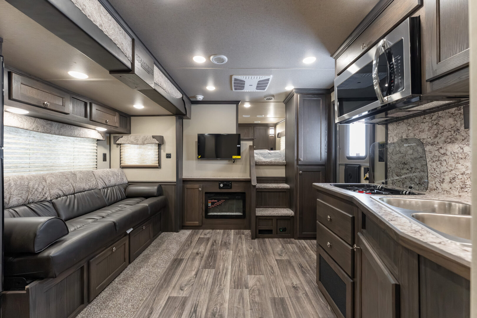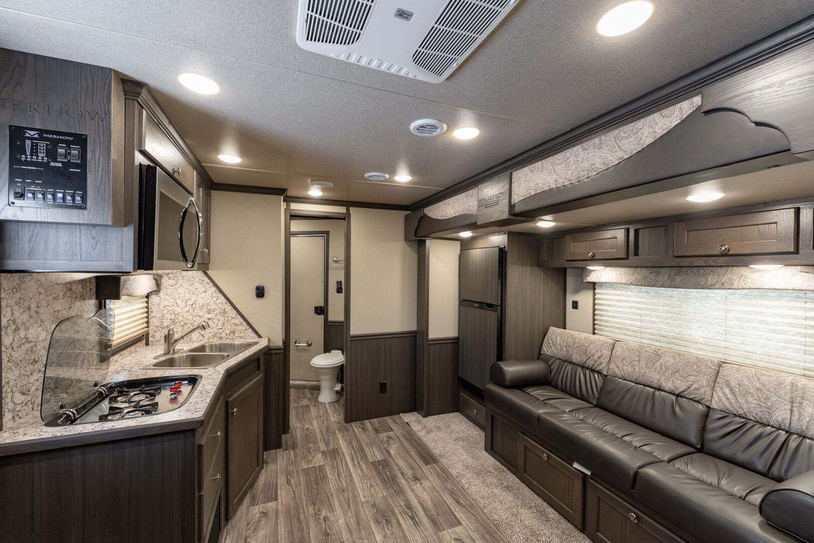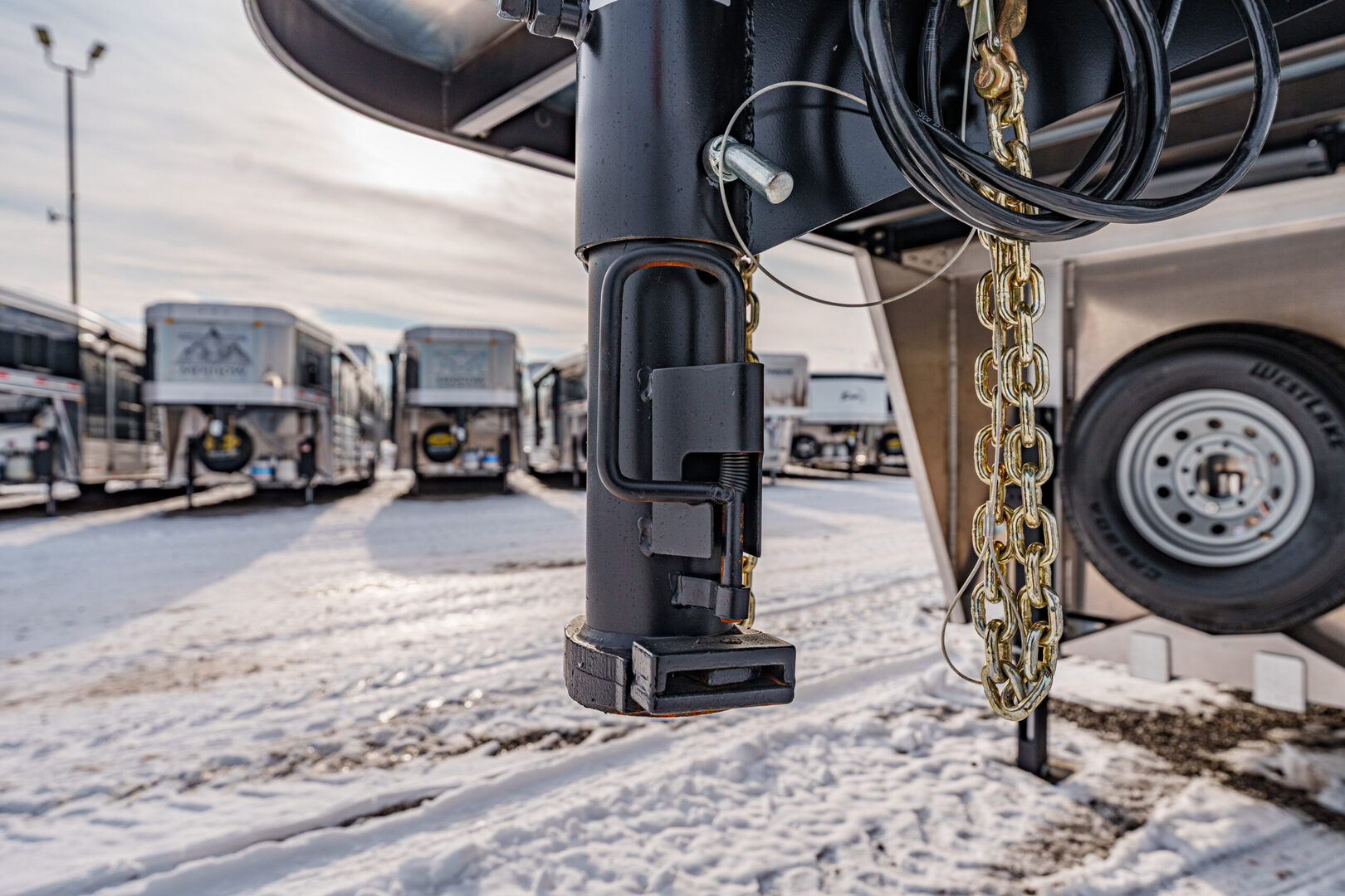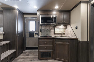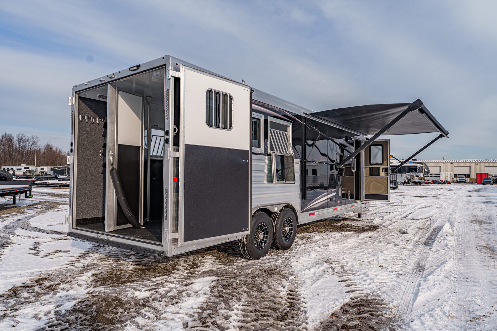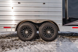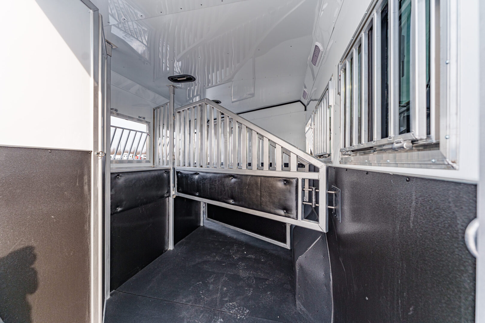 View Inventory: https://leonardtrailers.com/inventory/44592 Stock# 44592 New 2026 Merhow 8312-ARKS STAMPEDE Gooseneck Horse Trailer with Living Quarters The Stampede by Merhow is LOADED with standard features! The trailer offers the same Super-Structure as our Next Generation, the same 2/8 MFG warranty with an economically-built interior that offers premium vinyl with hardwood fascia and cabinet doors that will WOW you at first glance! Warranty: 2yr Living Quarter, 8yr Structural  Key Specifications Estimated Trailer Body Width: 8’ Estimated Overall Length: 35.167’ Exterior Skin Color: Black Exterior & Structural Features 40” stall setting, extruded aluminum floor, one-piece aluminum roof Drop-down feed windows on all head and escape doors Escape door (3 horse and larger models) with paddle latch & butterfly latch Rubber mats in horse area and rear tack 4-tier aluminum blanket bar in rear tack Rear collapsible tack with tie-back Interior Living Quarters Features Solid wood cabinet faces & flat panel cabinet doors Crown molding in main LQ, kitchen, and front bunk Laminate countertops with wood edges Soft-touch walls and ceiling, decorative panel ceiling Linoleum flooring in main LQ and bathroom, carpeted front bunk Kitchen backsplash laminate, overhead cabinets above seating White shower pan with opaque door, foot flush RV toilet Sky-dome above shower, stainless steel sinks High-velocity vent fan in bathroom AM/FM/CD/DVD radio with inside & outside speakers TV prep with antenna, 32” smart TV (size varies by model) Powered awning with LED light strip RV queen mattress in front bunk Fresh water tank: 38 gal, Gray water: 35 gal, Black water: 35 gal Selected Options & Upgrades Stainless steel nose wrap 16”, 8-lug gunmetal aluminum wheels with Westlake range E tires (ST235/80R16) Medium exterior graphics package Upgrade from single to dual leg hydraulic jack Install add-a-rail structural reinforcement Porcelain toilet upgrade Convection microwave upgrade Two-tone seating upgrade Electric fireplace Upgrade to 10-gallon DSI water heater Black tank rinse assist We offer outstanding financing options, accept trades, and can arrange nationwide NO HASSLE delivery! Inquire today for more information! (888) 333-6613 **We believe these specifications to be accurate. Any discrepancies are unintentional. Please verify information with a sales associate prior to purchase.** Stock Number:44592