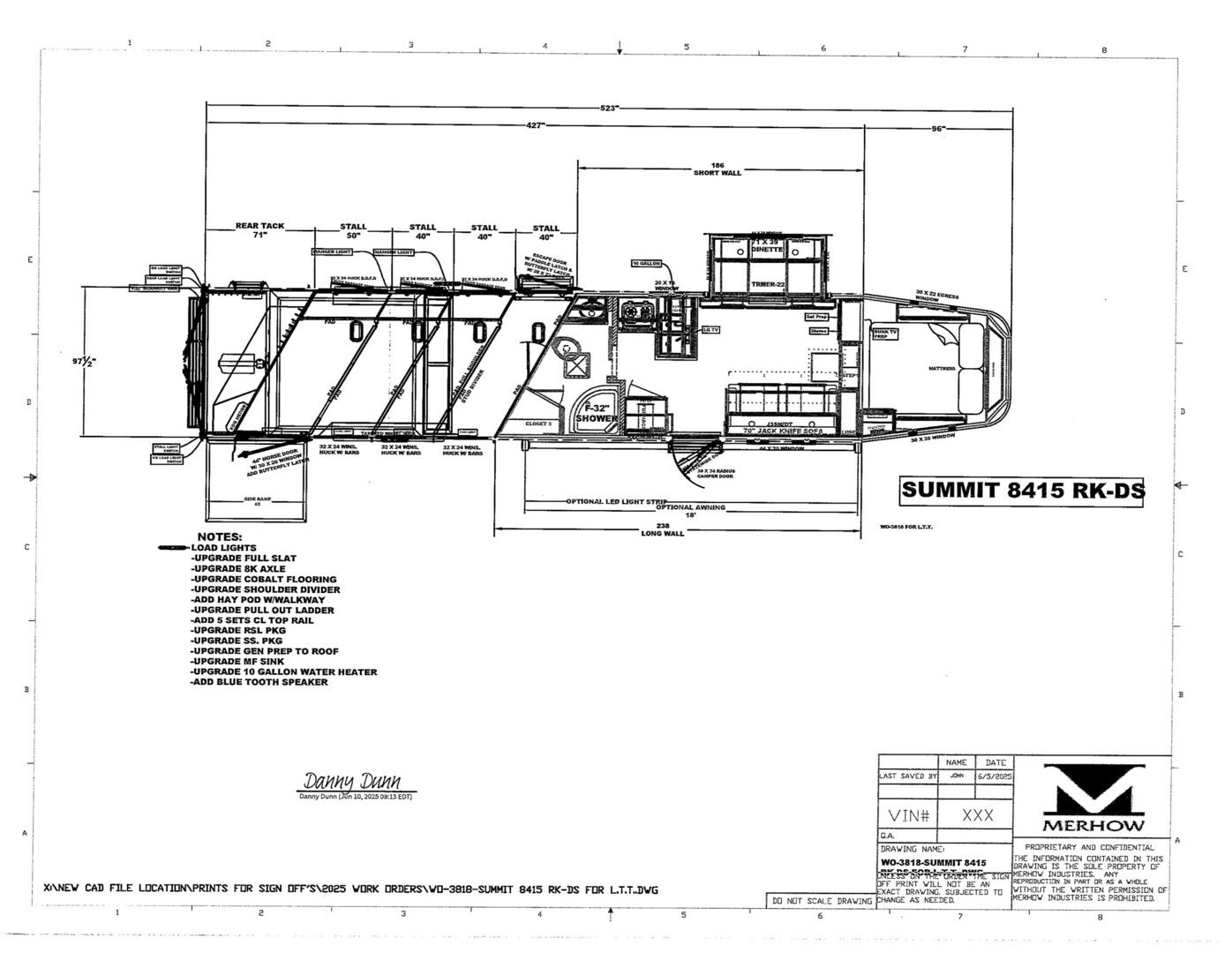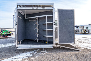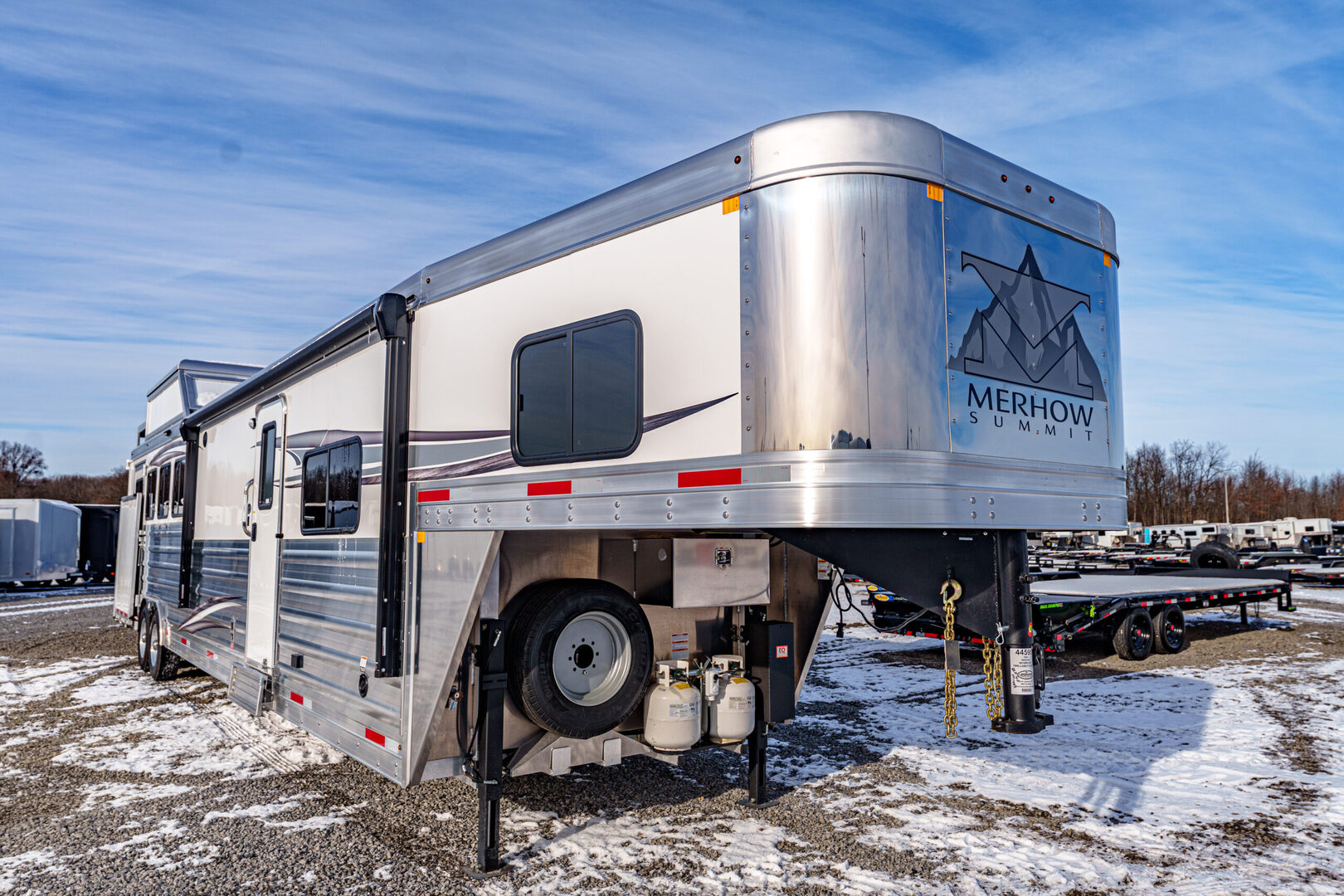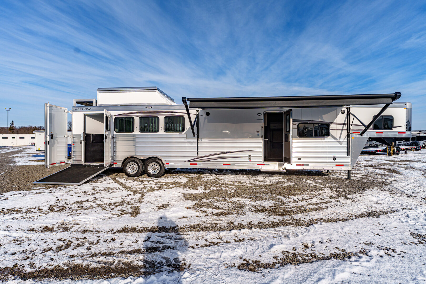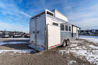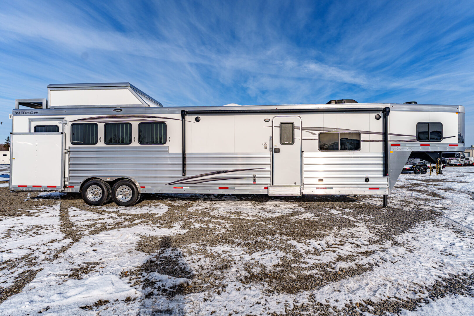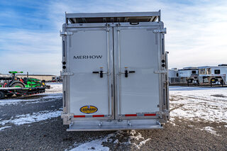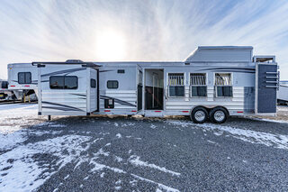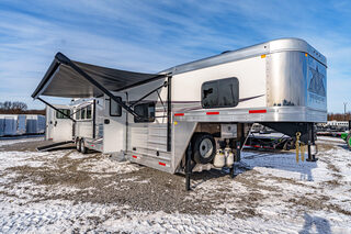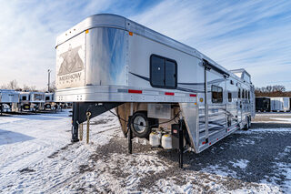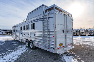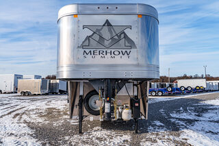 View Inventory: https://leonardtrailers.com/inventory/44595 Stock# 44595 New 2026 Merhow 8415RK-DS Gooseneck Horse Trailer With Living Quarters Merhow’s Summit offers the best value in the industry today! Summit offers an ALL HARDWOOD Premium interior. Our Summit shell is extremely strong yet lightweight and most of all affordable! Once Yor Pull a Merhow. You Won’t Pull Anything Else. Model:8415 RK-DS   Axle, Wheel, and Tire Options Axle upgrades: Tandem 8,000-pound axles. Wheel and Tire Selection: 17.5”, 8-lug Aluminum Mod wheels with Cooper Roadmaster range ”H” tires (ST215/75R17.5). Upgrade the spare tire wheel to aluminum from steel. Ramps, Hay-Rack, and Hay-Pod Options Enclosed hay pod, skinned to match the trailer, includes ladder and 3’ walk platform. 8’ Hay Pod with walkway and ladder. Upgrade the standard ladder to a pull-out ladder. Additional Horse Stall Configurations Rear side-load package. Full rear tack with an additional 18” of length to the belly of the trailer. Side load door with slider window and butterfly latch. Rear tack and rear door lined with ply-felt. One long aluminum shelf spans the width of the rear tack. Jack Options Upgrade to dual leg hydraulic jack with dual control switch Exterior Appearance Option Full length mill finished extruded slats SS Décor Package Upper cabinets in ”To Be Country Cream.” Lower cabinets in ”To Be Toffee.” Countertops are to be ”Mirage” (solid surface). Lighting to be farmhouse-style lighting. Custom Colors Cabinet Color: Two-tone for SS package only. Floor Color: Elpaso. Wall Color: Zilch linen (Soft touch). Ceiling Color: Apex Horizon (Panel). Countertop Color: Custom color. Seating: Custom color. Additional Notes: Seating and valance insert color to be made from Stout Clay. Warranty: 1yr- Components 1yr- Annual Maintenance (from date of manufacturing) 2yr- Merhow Living Quarters 8yr- Structural Trailer Technical Data Estimated Trailer Body Width: 8” Number of Horses: 4 Horse Tire Load Range: H Wheel Size: 17.5” Axle Capacity and Axle Quantity: Tandem 8,000-pound axles Estimated Belly Length: 33.5’ Estimated Overall Length: 41.5’ Estimated Overall Height: 186” Trailer Standard Features Aluminum sidewall posts, top rail, rear hoop, bottom rail. 40” Stall setting (Measured center of hinge pins). 4” Cross members, typically on 14” centers. Extruded aluminum floor below LQ and horse area. One-piece aluminum roof. White, .040 exterior aluminum skin (Optional color upgrades). Stainless steel nose wrap. Extruded aluminum sides in the horse area (Optional full slat). Horse area walls lined with white aluminum. Lined and insulated horse area ceiling with white aluminum. Lower section of horse area walls lined with ballistic liner. .100 Aluminum kick plate on butt wall behind the ballistic liner sheet. Drop down feed windows standard on all head windows. Radius corner window with bar guard on hip side (1 per stall). Rubber mats in horse area and rear tack. Padded dividers with airflow shoulder sections. Aluminum chest and butt bars with padded covers. Tapered inside wheel wells (8 wide models only). 18” Deep mangers on all 8 wide models. Drain and drain tube in all units with mangers. Escape door with step standard on 3-horse & larger models. Drop down feed windows standard on all escape doors. Paddle latch on escape doors. Butterfly style latch standard on escape doors. Interior Standard Features Solid wood cabinets. Solid wood raised panel cabinet doors on 8’ wide units. Solid wood flat panel cabinet doors on 7’ wide units. European-style cabinet door hinges. Crown molding in the main LQ, kitchen, and front bunk. Laminate countertops on 8’ wide units with wood edges. Picture frame-style window rings on 7’ wide units. Hardwood valance with fabric inlay (8’ wide units). Pleated day/night only shades on all windows. Stainless steel sink for the kitchen. Stainless steel bathroom sink (Based on floor plan). Deluxe queen innerspring mattress in the front bunk (60”x74”). Porcelain toilet with foot flush. High-velocity vent fan with a rain sensor in the bathroom. Built-in microwave. 19,000 BTU LP furnace. 13,500 or 15,000 BTU air conditioner (Based on floor plan). Black and gray water waste tanks (35 gallons each).   We offer outstanding financing options, accept trades, and can arrange nationwide NO HASSLE delivery! **We believe these specifications to be accurate. Any discrepancies are unintentional. Please verify information with a sales associate prior to purchase.** Stock Number:44595