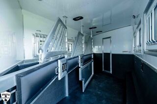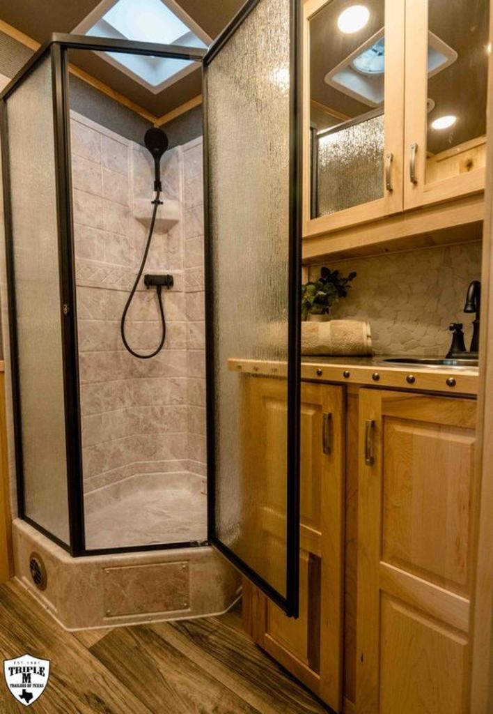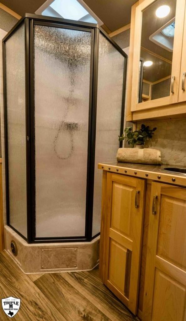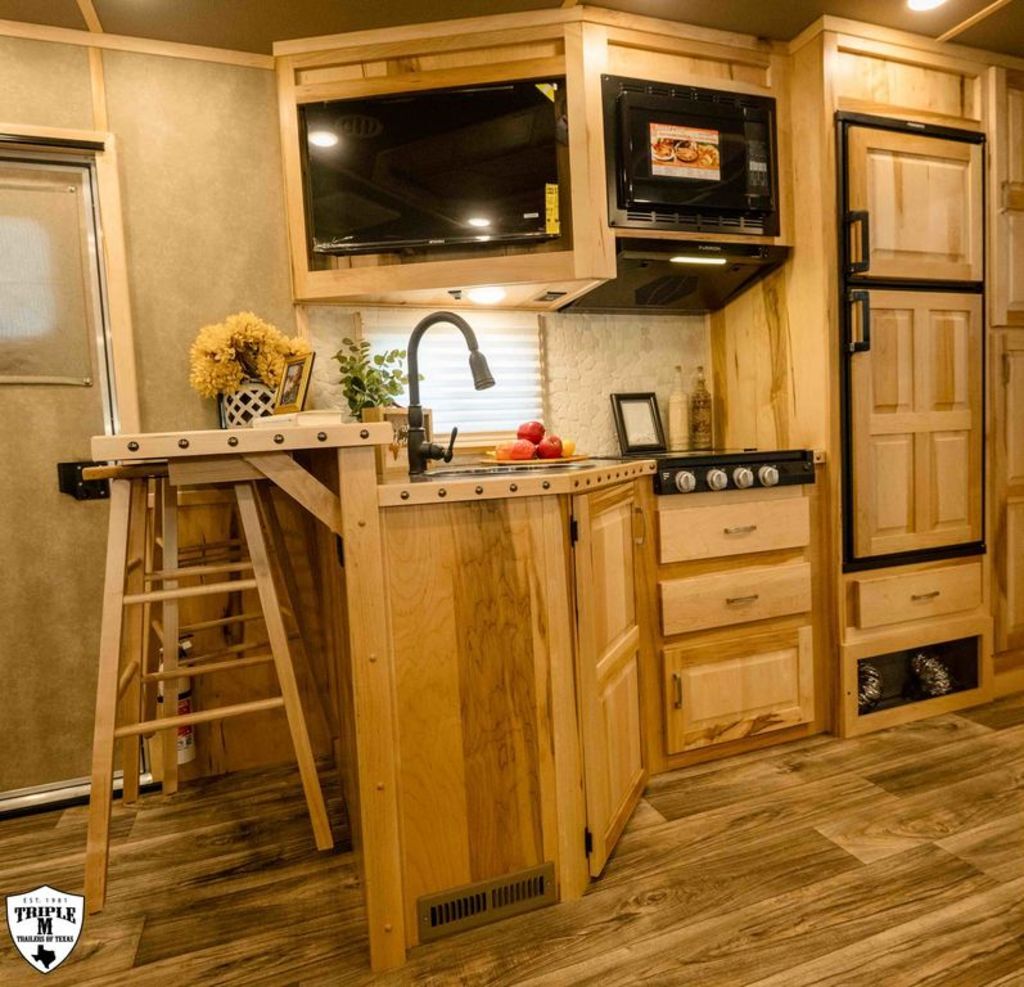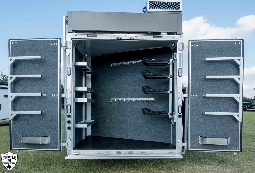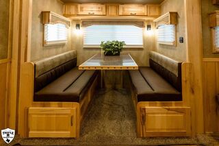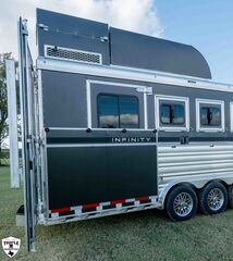 4H INFINITY BUNK BED w/ SIDE LOAD 38’3 FLOOR / 46’5 OVERALL 8’2 TALL / 8’ WIDE (3) 7K DEXTER TORSION AXLES REAR SIDE LOAD w/ 1’ ADDED SWING OUT SADDLE RACK ADJUSTABLE SHELVING IN REAR TACK 6’ FLUSH SLIDE OUT RUSTIC MAPLE BRONZITE COUNTER TOP LINO VOYAGER FINA ELEGANCE CHOCOLATE w/ REPTILE DESERT INSERT CABINET DOORS ON DINETTE FULL SLATS BAUER LATCH & STEP @ FRONT STALL RECESSED 3 BURNER COOK TOP DROP DOWN WINDOWS ON BOTH SIDES CONVECTION MICROWAVE 10 GAL H20 (2) 13.5 AC UNITS 50 AMP SERVICE 5.5 ONAN GASOLINE GEN HAY POD w/ LADDER EXTRA CLEARANCE LIGHTS EXTRA TAIL LIGHTS 110v OUTLETS IN EACH BUNK MATTE BLACK METALLIC EMPTY = 15,125 GVWR = 21,000