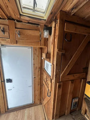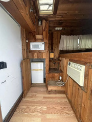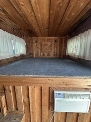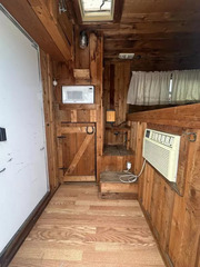 Dressing room - porch light, hand hold, entry door with window, cedar wood interior, 1.5 cubic foot refrigerator, 110v outlet, 2 reading lights, (2) 12v outlets, cabinet headboard, carpet in nose, AC in drop wall, roof mounted lights, wall hooks, power inverter, manual roof vent, wood floor, pass through door to horse area.