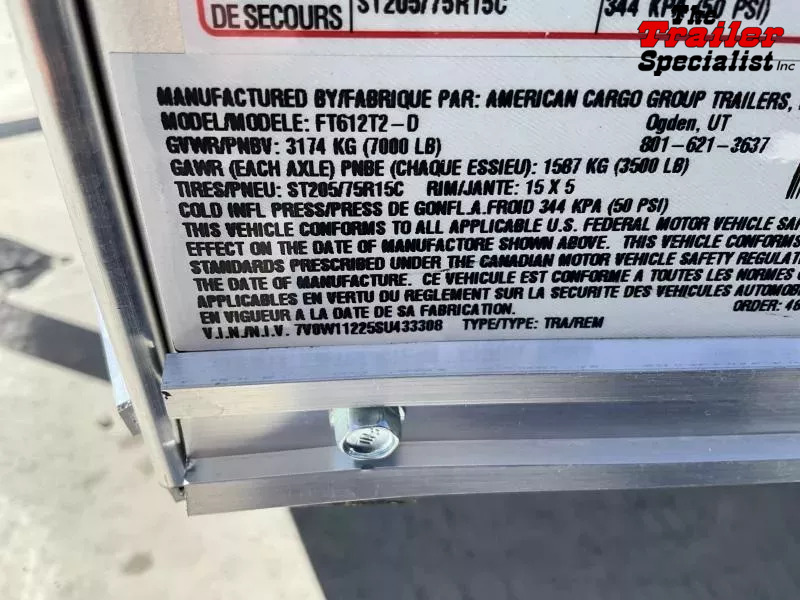 *** *** 2025 Wells Cargo FastTrac 6x12 7K Tandem Axle Enclosed Cargo Trailer Get ready to haul with the NEW 2025 Wells Cargo FT612T2-D FastTrac 6x12 7K Tandem Axle Enclosed Cargo Trailer! This trailer redefines value in the light-duty recreational cargo market, offering a perfect blend of versatility and affordability. It’s built with the uncompromising dependability you expect from Wells Cargo, packing exceptional value into an entry-level trailer. Key Features: This 6x12 tandem axle enclosed cargo trailer is ready for your toughest jobs. Dimensions & Weight: * Empty Weight: 1,740 lbs * GVWR: 7,000 lbs Standard Features: * Safety Chains with Clevis Hook and Latch * Undercoated Entire Chassis * E-Z Lube Hubs * Smooth Aluminum Jeep Fenders * 12v LED Exterior Lighting * 16” On-Center Vertical Posts * 3/4” PlexCore High-Performance Interior Decking * 32” Side Entry Door with Bar Lock * Rear Ramp Door with Spring Assist * 16” Starbright Stoneguard * 24” On-Center Roof Bows * 24” On-Center Floor Crossmembers * 4-Wheel Electric Brakes (Tandem Axle Models only) * Flow-Thru Sidewall Vents * 15” Radial Tires * White .024 Aluminum Exterior (with screws) * Spring Axles with 4” Drop * 12v LED Dome Light * Steel Tube Main Rails * (4) 500 lb. Surface Wall Mounted Rope-Rings (Note: 5’ wide models feature a single swing rear door and no side door as standard) Warranty: * Includes a 1-year limited warranty. *** Please note: While we strive for accuracy, we recommend confirming all specifications with one of our sales representatives to ensure complete detail.