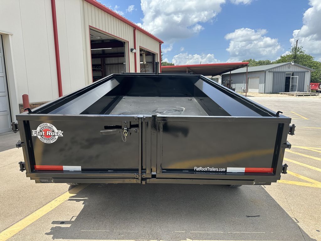 7’ x 14’ x 2’ Flare Side Dump Trailer (+/ 7.77 Cubic Yards) 2 x 7,000 lb. EZ Lube 8 lug (Brakes on both axles) Heavy Duty Slipper Spring Suspension Tires: New ST235/80R16 LRE 10 Ply Radials) Main Frame: Full 6 in. channel Gooseneck Tongue: 8 in. Channel Risers and Beams Tilt Frame: 3 in. x 2 in. tubing Cross Members: 3 in. channel Bed Flooring: 1/8 in. thick sheet steel Bed Siding: 1/8 in. thick sheet steel Deck width: 82 in. Deck Length: 14 in. Deck Height: Approximately 28 in. Side Wall Height: 24 in. Rear Doors: Double swing doors (open like barn doors) Battery: Group 24 deep cycle marine Pump: Electric over hydraulic (1.7 gpm) Controller: 15’ corded remote control Front locking toolbox contains battery and pump Hydraulics: Single 3 stage hydraulic cylinder (14,000 lb.) 2 5/16 in. Adjustable GN Coupler Two heavy duty safety chains Jack on Gooseneck: 12,000lb spring loaded drop leg Fenders: 14ga heavy duty tread plate Lighting: All flush mount or recessed lifetime LED   Empty Weight: 4,000 lb. G.V.W.R. 14,000 lb. Carrying Capacity: 10,000 lb.