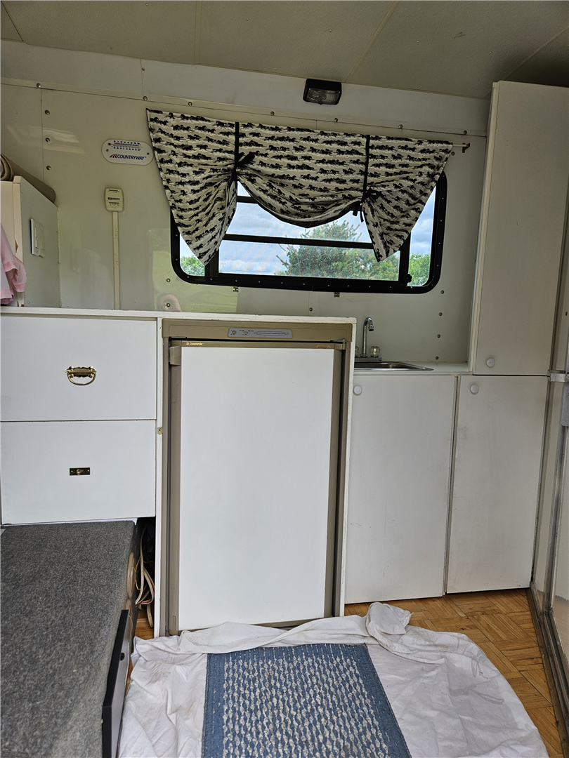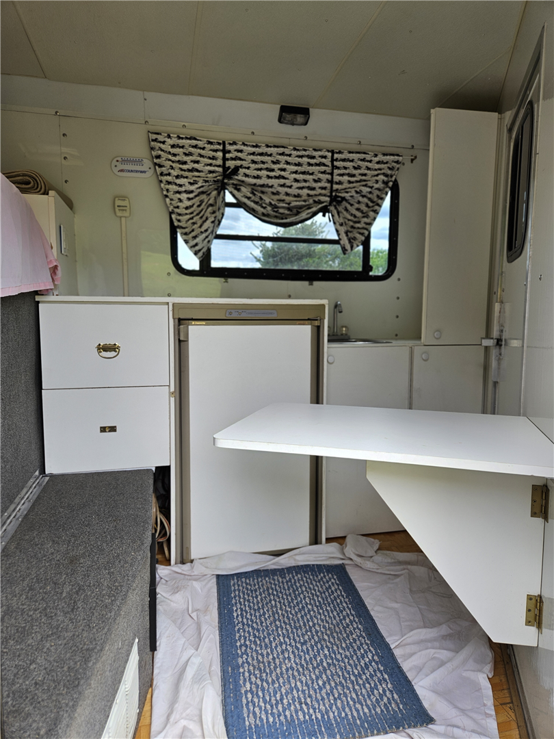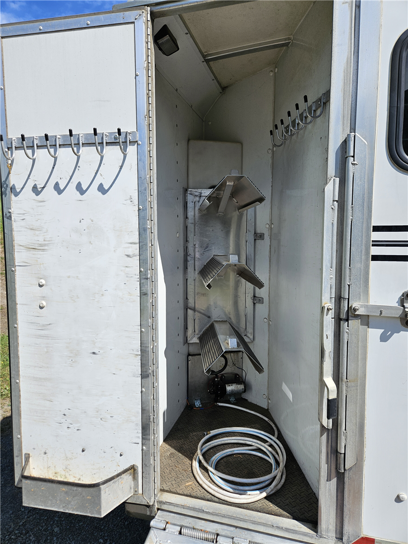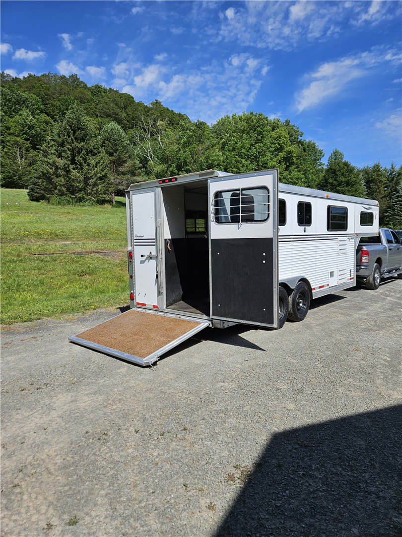 Like new condition, 3 horse slant trailer. Always stored inside. Queen bed over gooseneck, propane furnace, propane/electric refrigerator, propane hot water. Built in folding dining table. 2 deep storage drawers, and 2 deep closets. No bathroom, porta pottie in storage compartment. Cowboy shower with hot water in the first stall. 3 Marine batteries with solar charger. 3 saddle tack room, with water tank plus water pump. New loading ramp. Electric awning and electric jack. Gooseneck extension for short body truck. Original straight gooseneck coupler available.