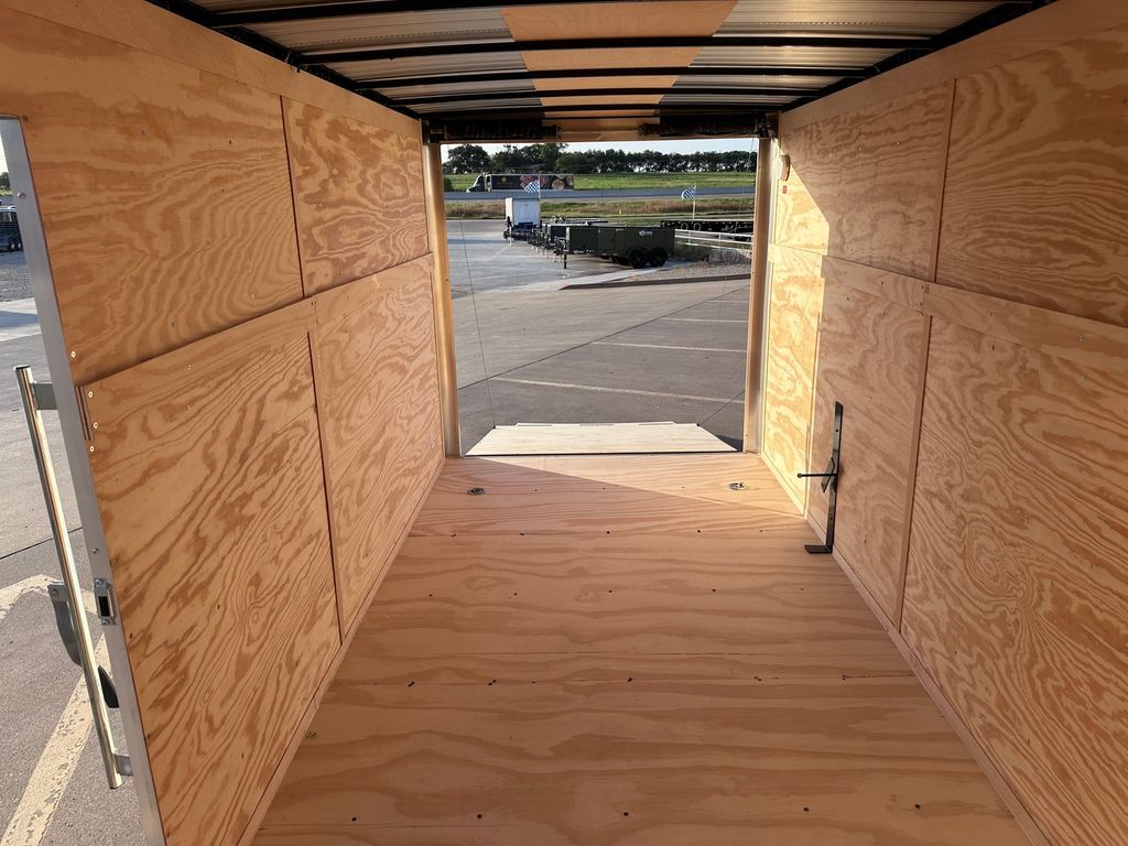 7’ x 16’ CGR CM + 6 in Interior Height 2 x 3,500 lb. EZ Lube 4 in Drop Axles 2 5/16 in Coupler Triple 2 in x 6 in Tongue .030 Aluminum Siding Side Post on 16 in Centers ATP Diamond Plate Fenders 6’ 6 in Interior Height Sloped Roof (Prevents Water from Sitting) 2K Jack 5 Hole Wheel ST 205 75 R 15 in Radials Dual Spring Assist Rear Ramp Door 36 in Side Door with Bar Lock and RV Latch Interior Spare Tire Mount ATP Front Stone Guard 3/4 in Treated Plywood Floors 3/8 in Plywood Walls Flow Through Vents Empty Weight: 2,490 lbs. GVWR: 7,000 lbs. Carrying Capacity: 4,510 lbs.