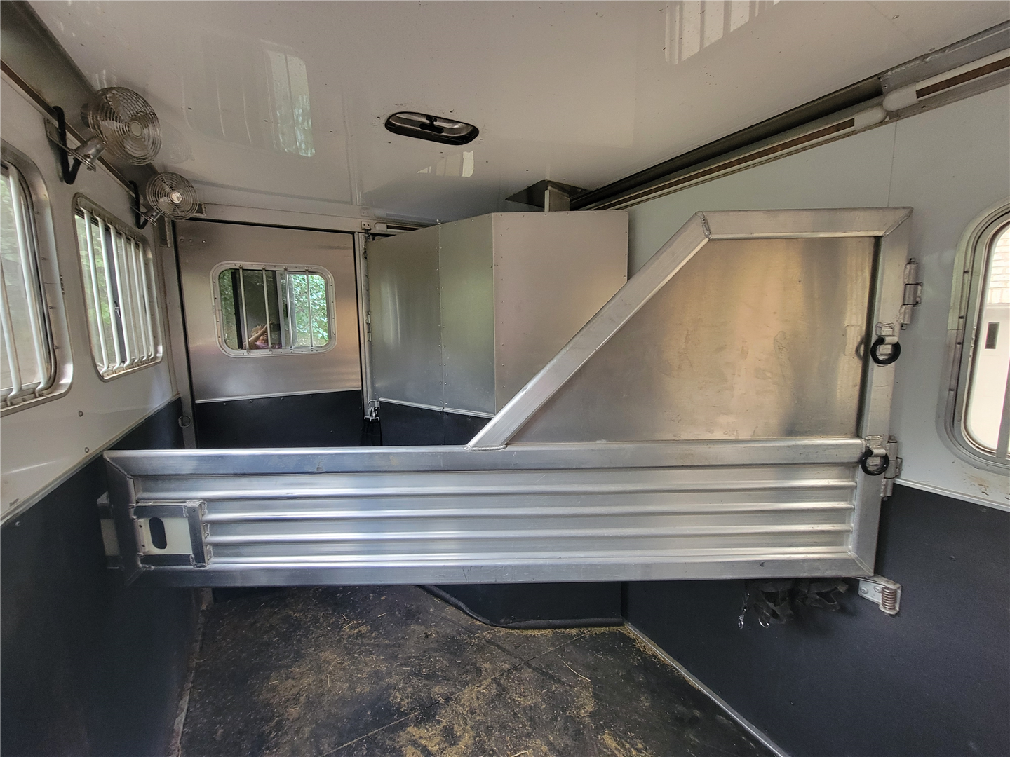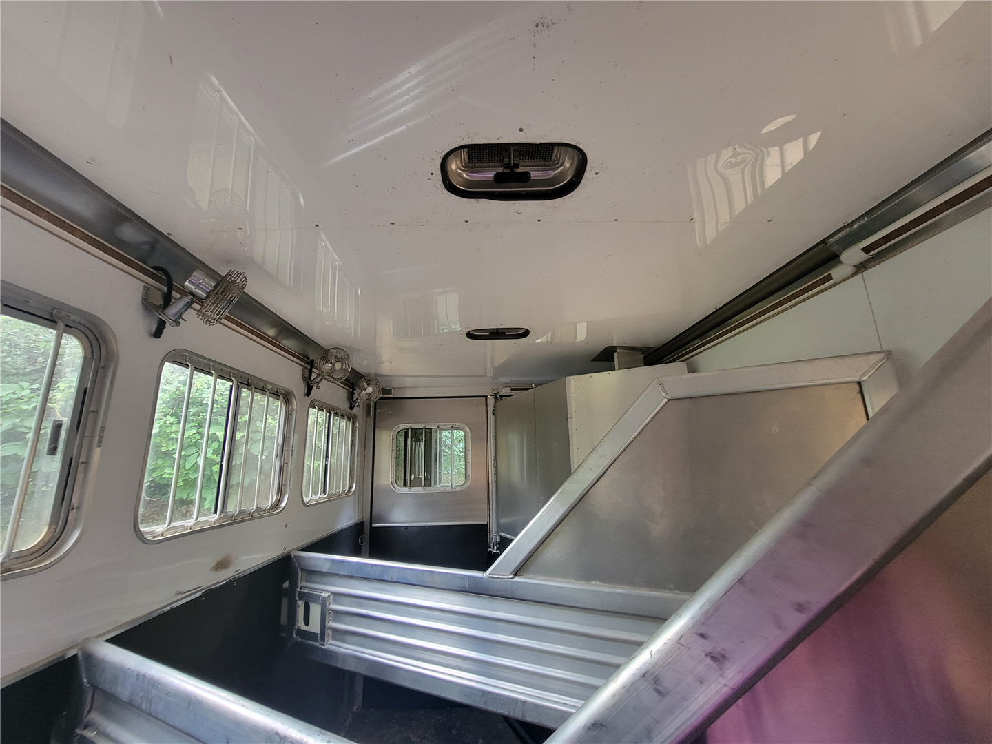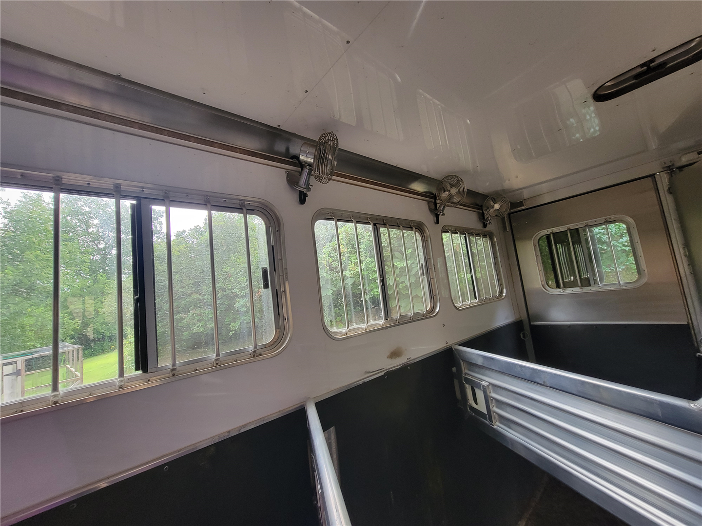 3 spacious stalls (slanted) each with a fan. Tack storage in rear, as well as loading ramp. Ramp is designed to lift very easily.