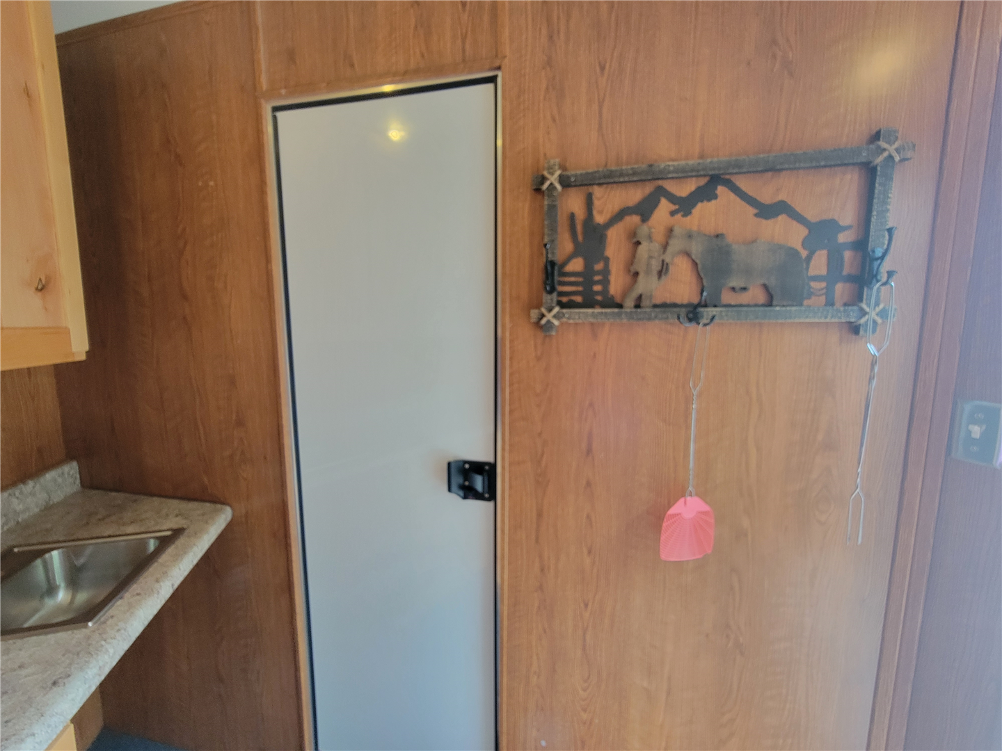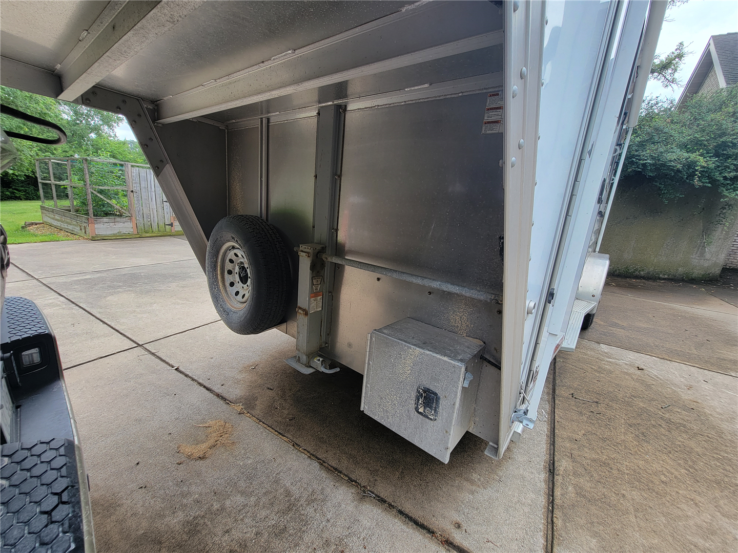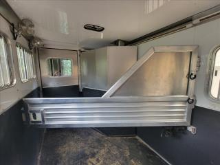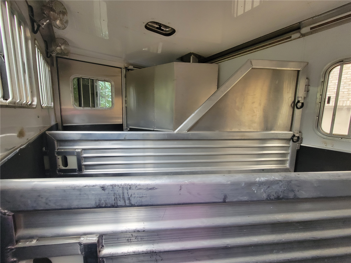 3 spacious stalls (slanted) each with a fan. Tack storage in rear, as well as loading ramp. Ramp is designed to lift very easily.